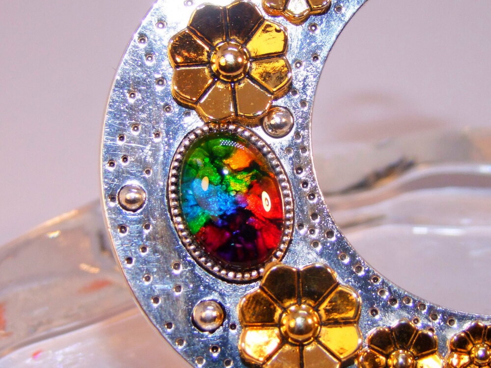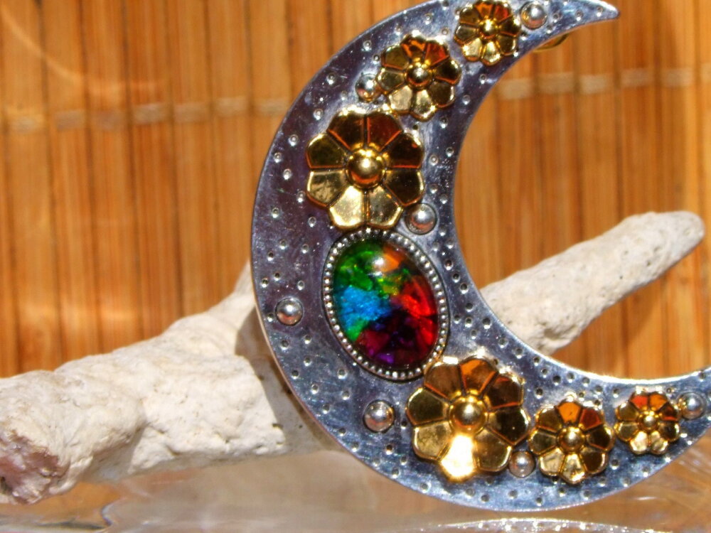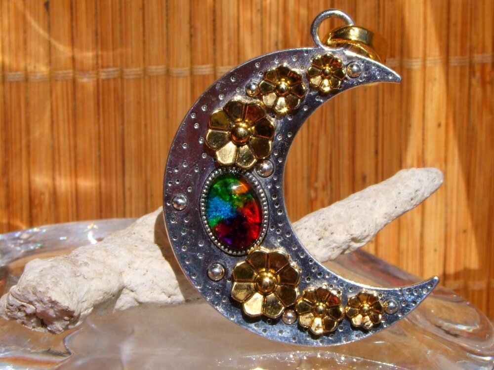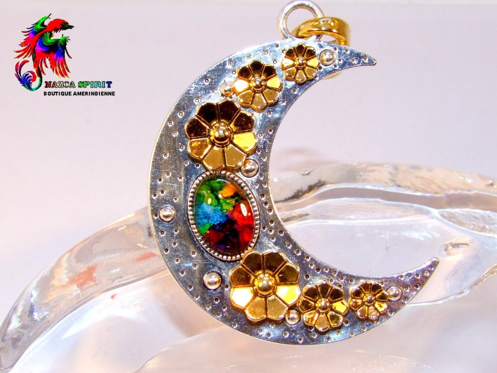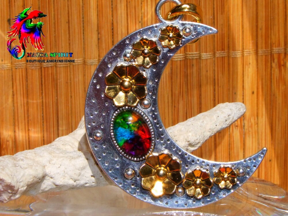 Grand Pendentif Bohème Amérindien de 7.1 cm Lune en Métal Argenté Gravures Ethniques Fleurs Dorées et et Cabochon Coloration Artisanale