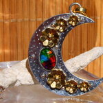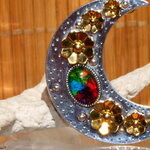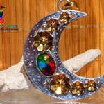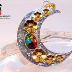Pendentif Bohème 7.1 cm Lune en Métal Argenté Gravures Ethniques Fleurs Dorées et et Cabochon Coloration Artisanale