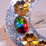 J'ai intégré lors de la réalisation de la coloration des particules holographiques pour intensifier les effets lumineux du cabochon sous la lumière solaire ou artificielle.