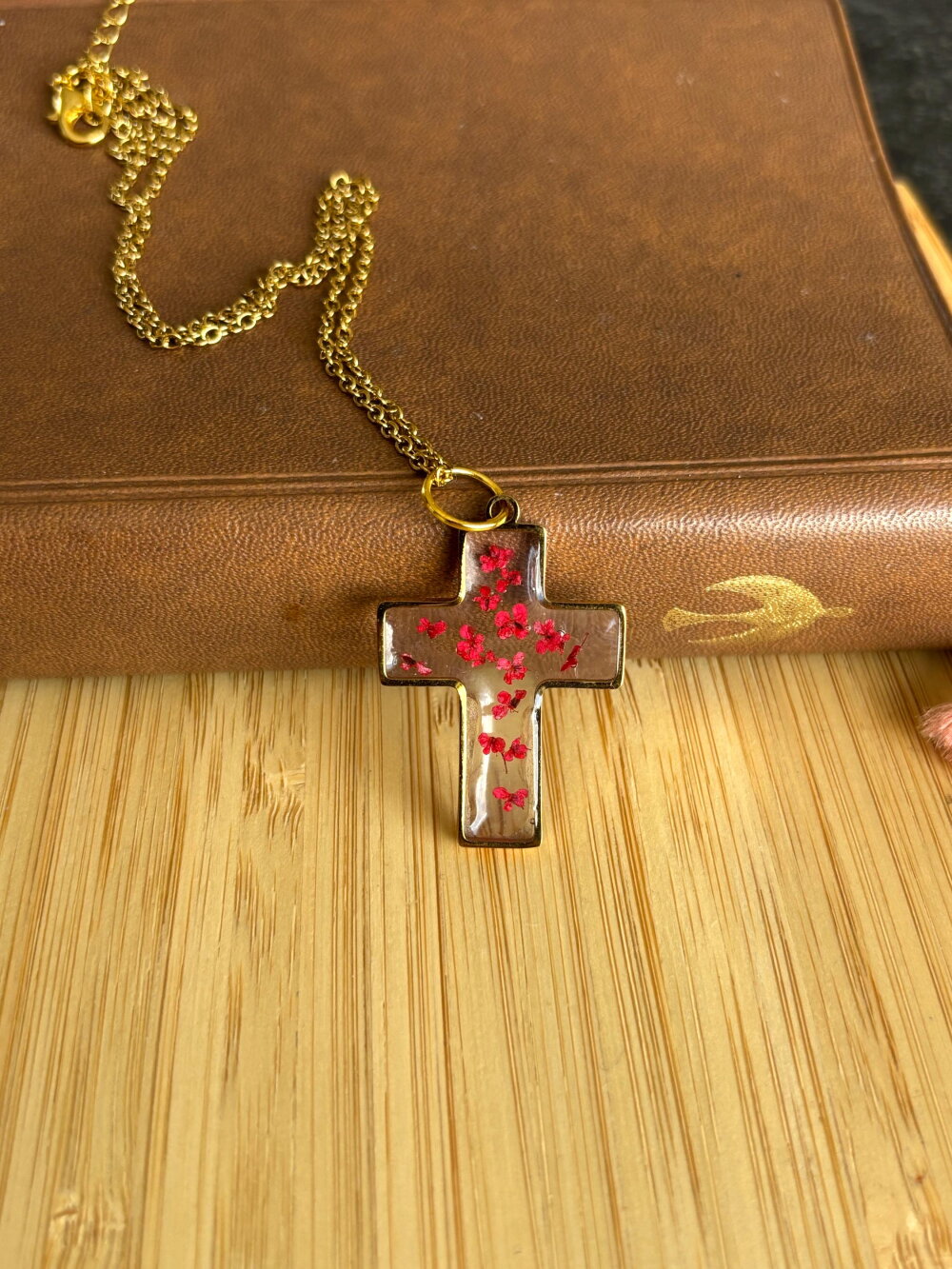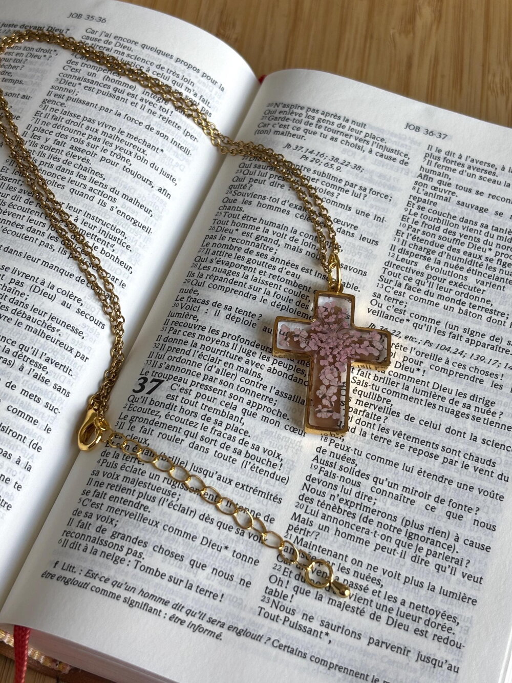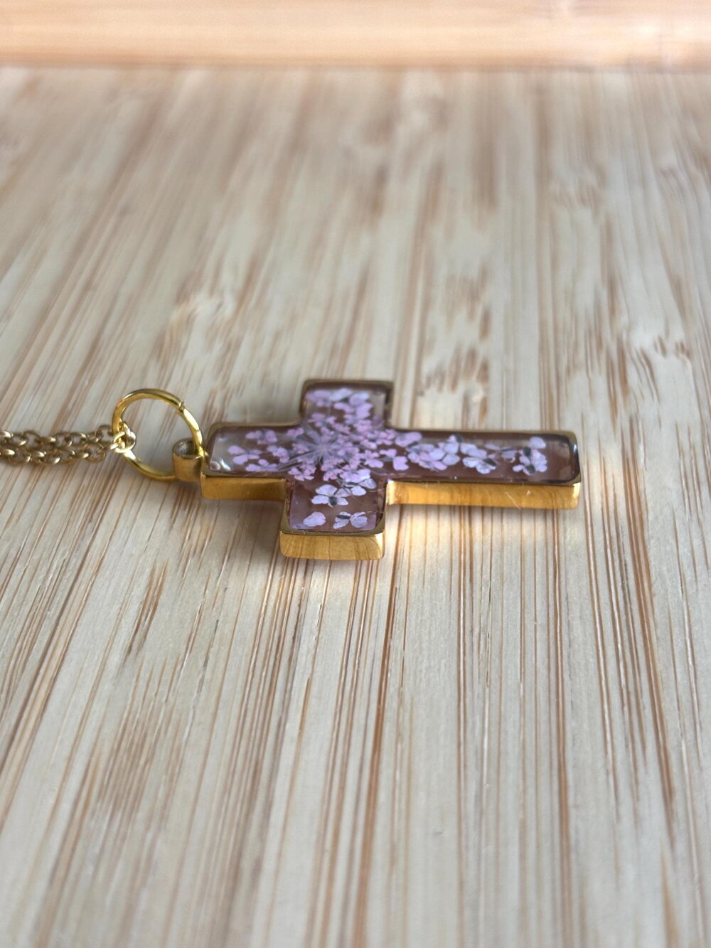 Ajoutez une touche de poésie et de spiritualité à votre look avec ce pendentif croix en résine, réalisé à la main avec de véritable fleurs séchées.