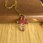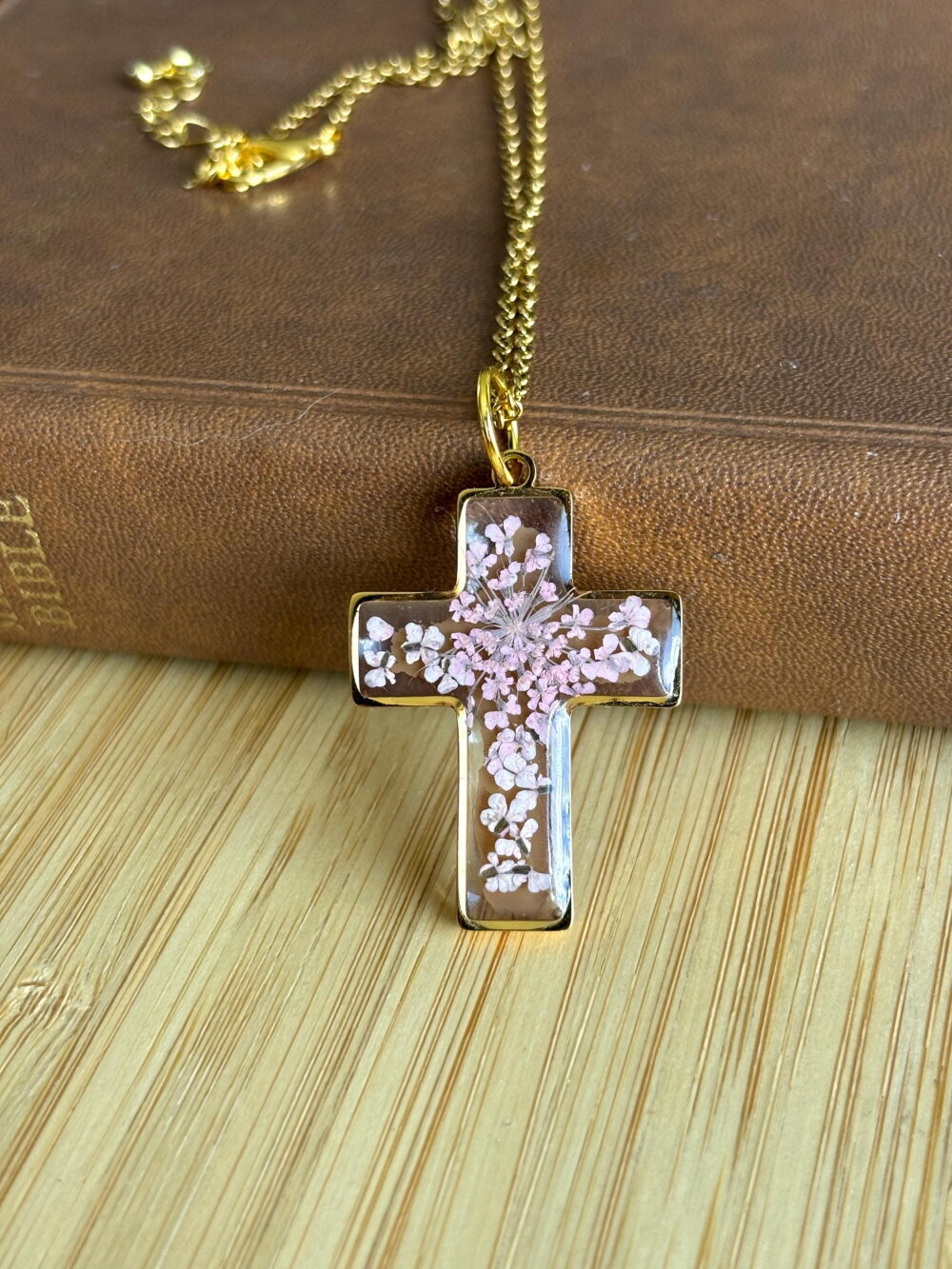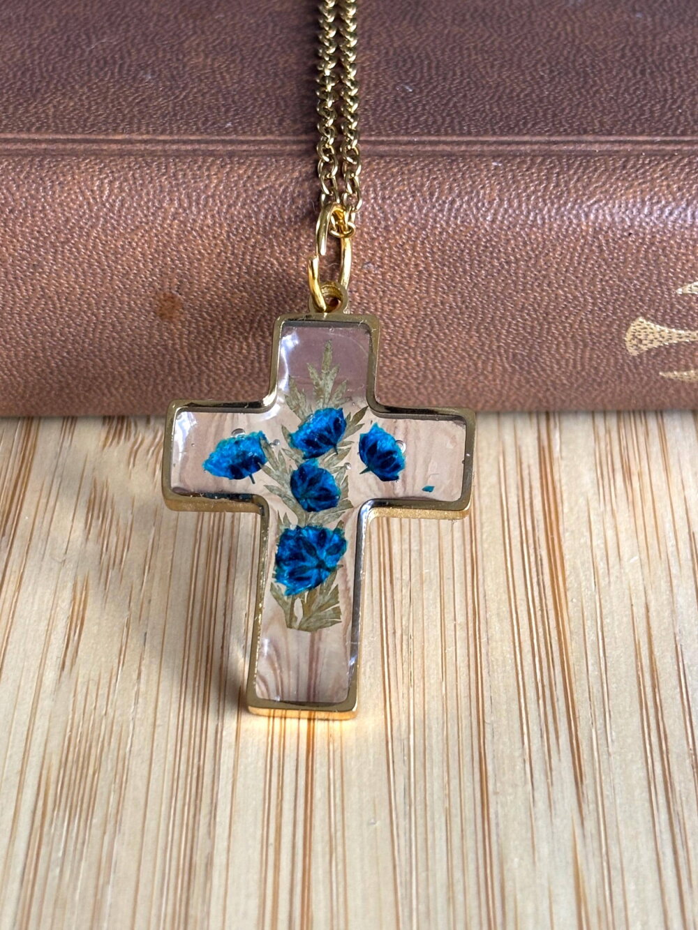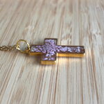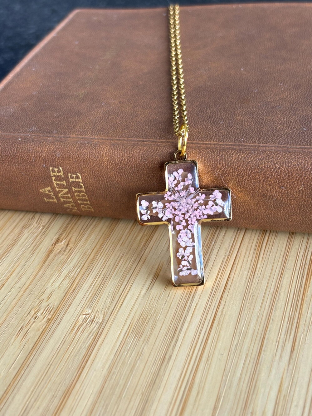 Ajoutez une touche de poésie et de spiritualité à votre look avec ce pendentif croix en résine, réalisé à la main avec de véritable fleurs séchées.