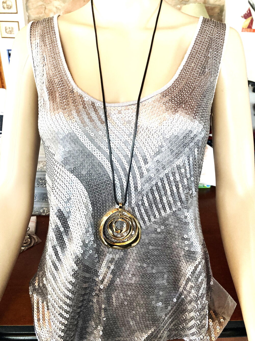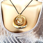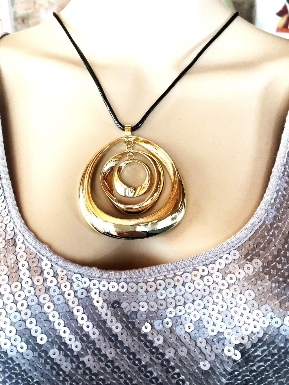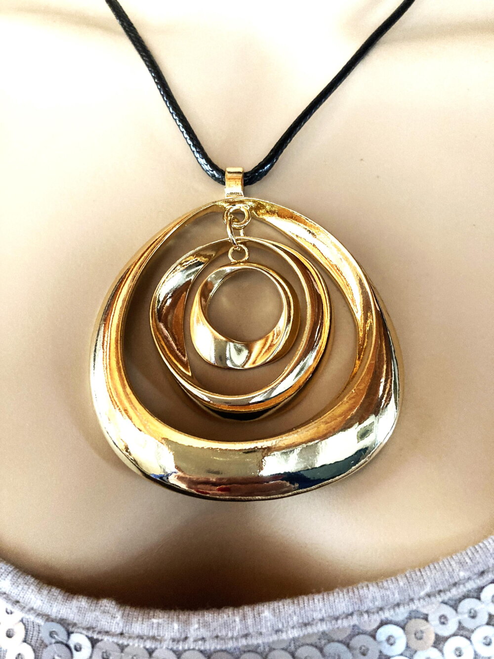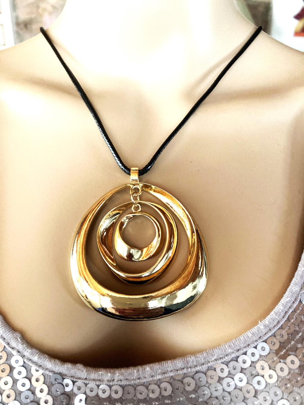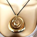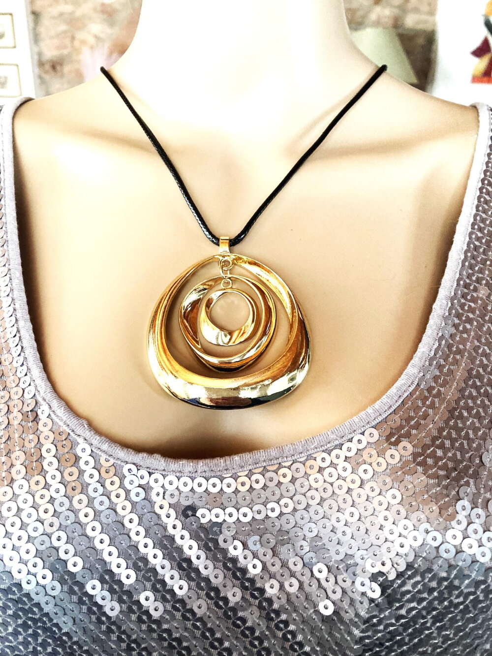Très beau pendentif, moderne, en métal doré sur collier cordon réglable en coton noir. Bijou femme.