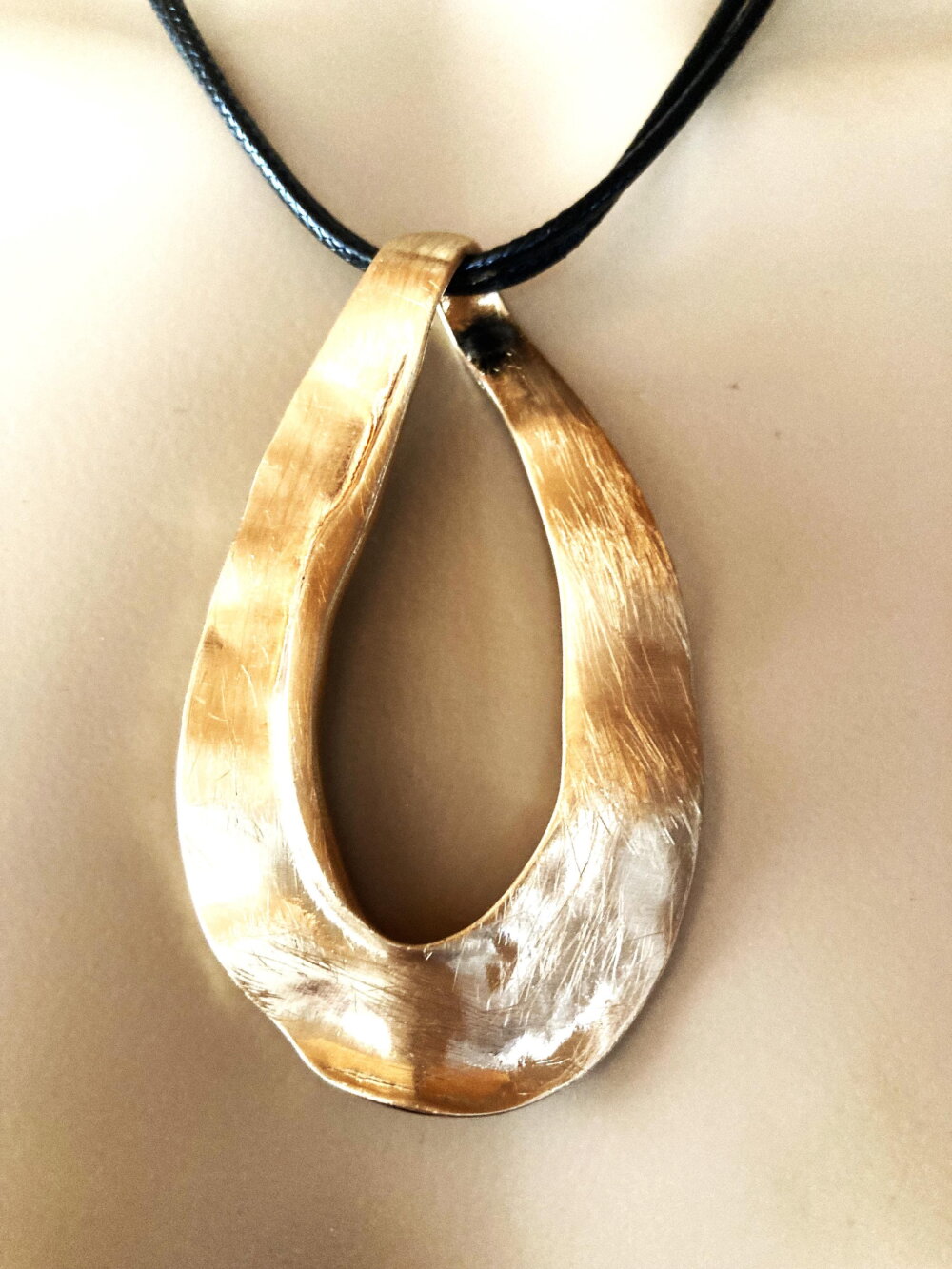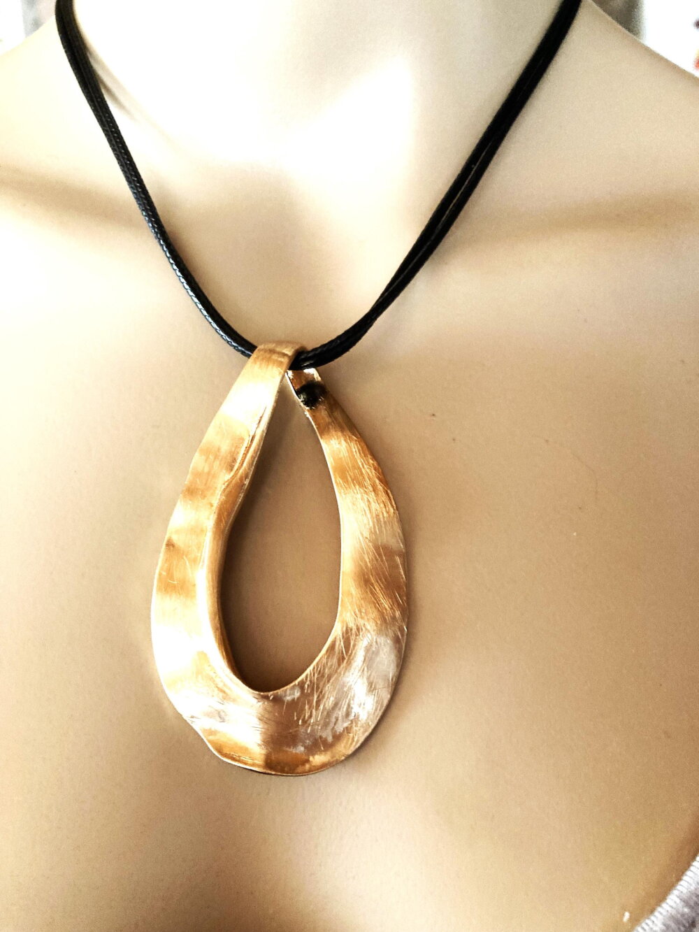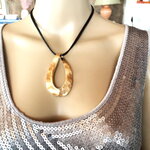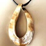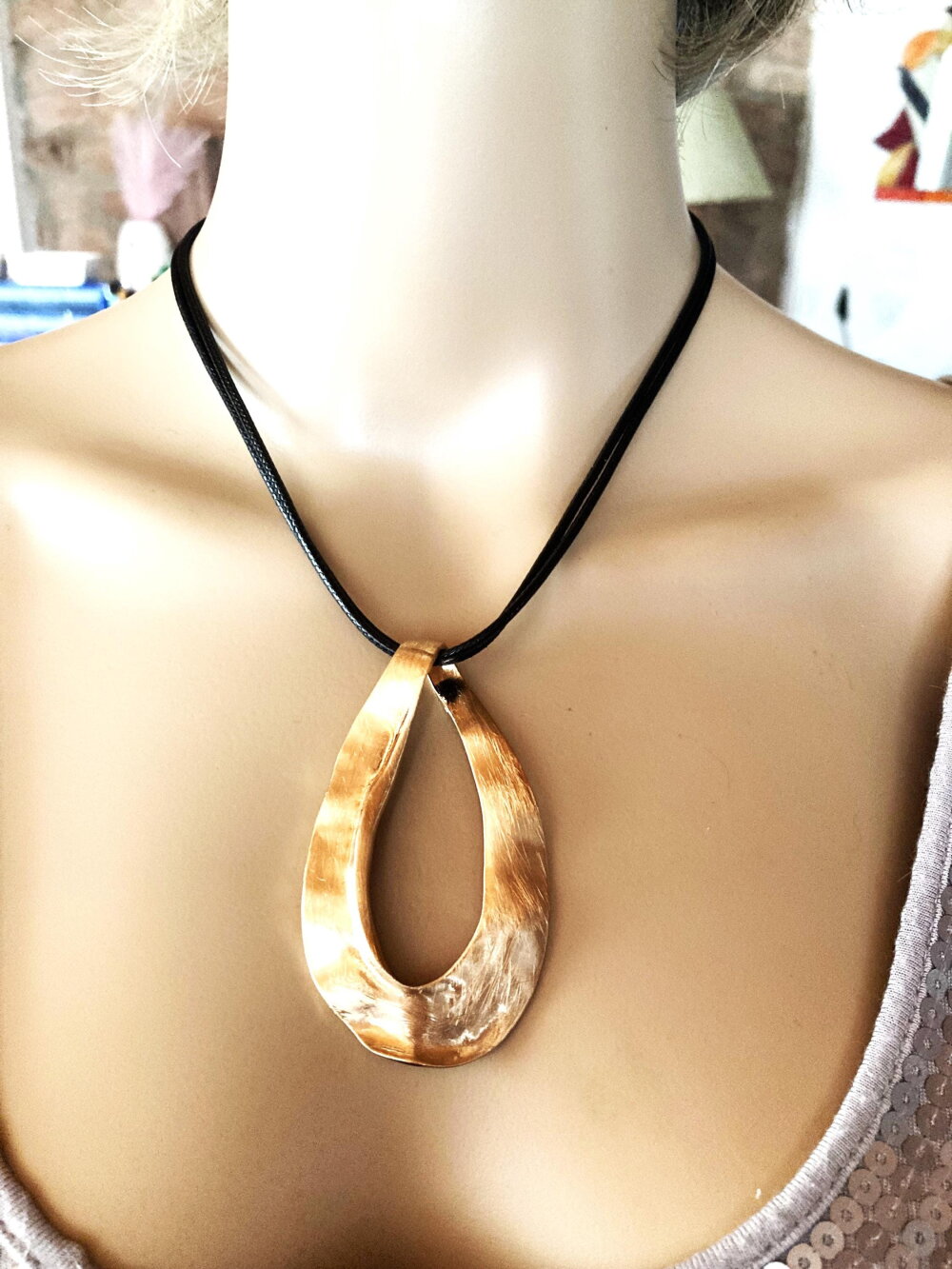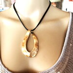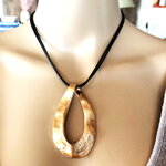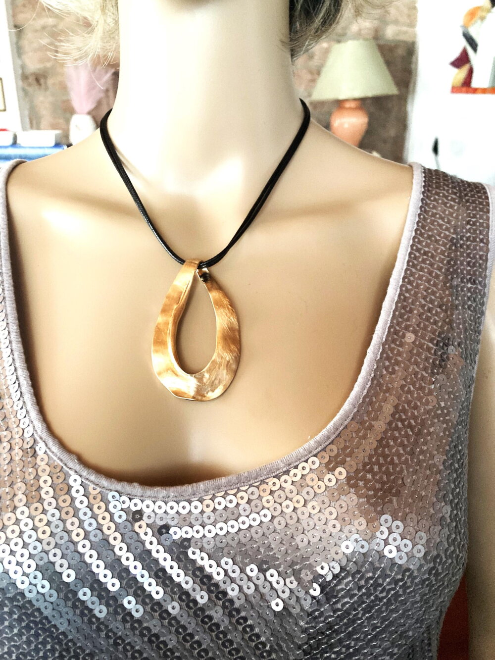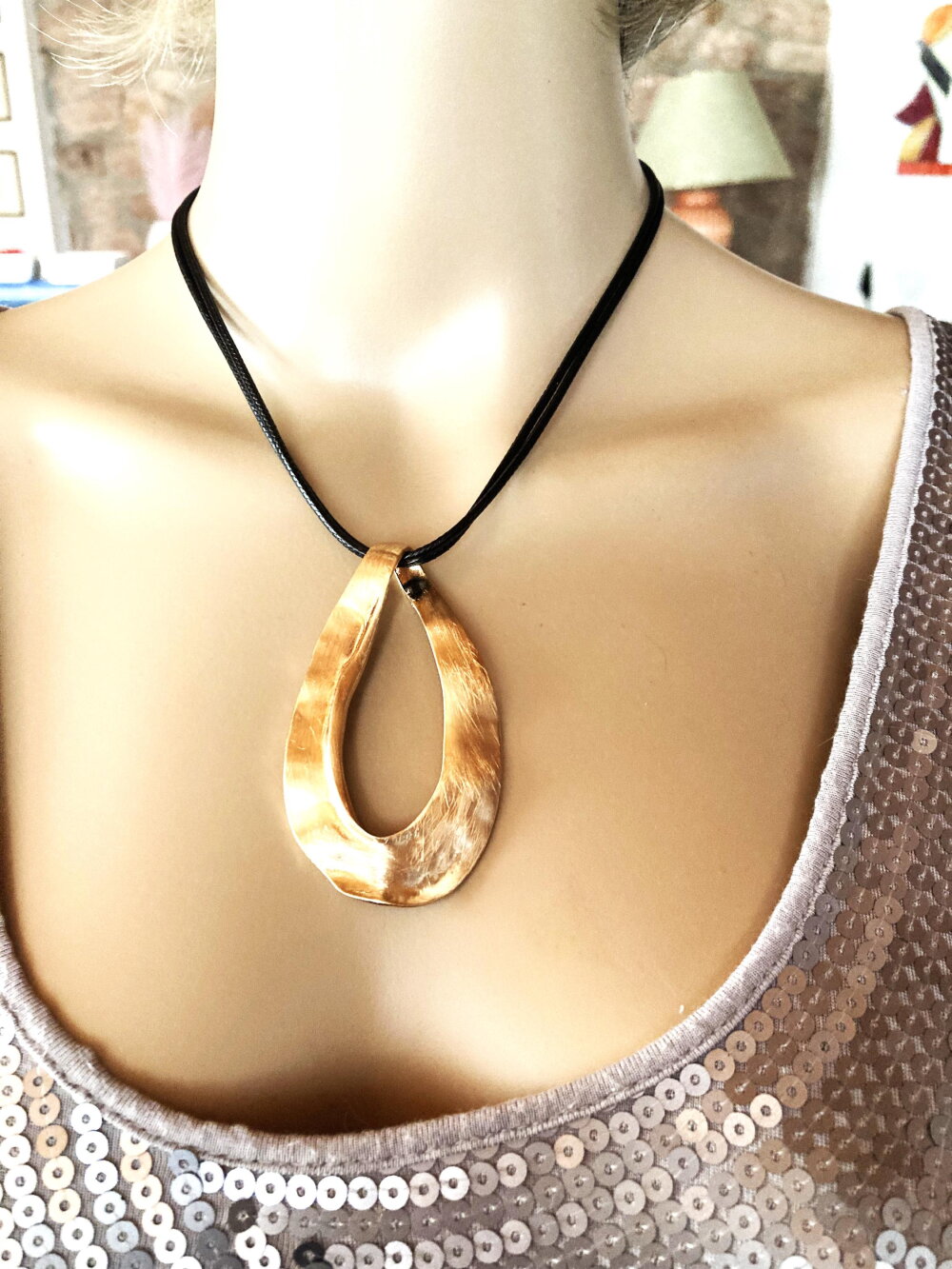 Très beau pendentif, moderne, en métal doré sur collier double cordon réglable en coton noir. Bijou femme.