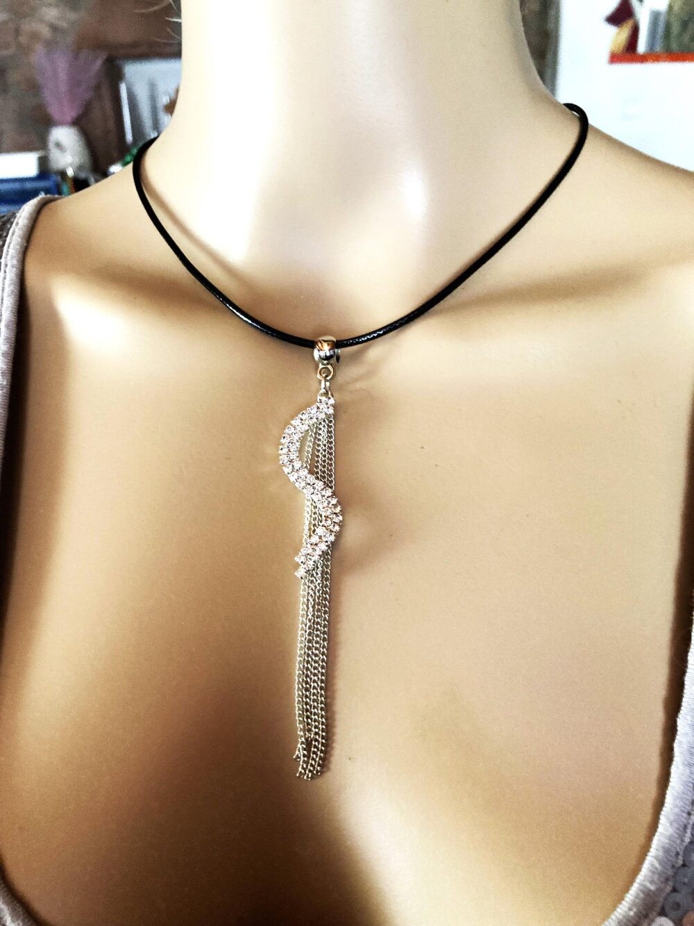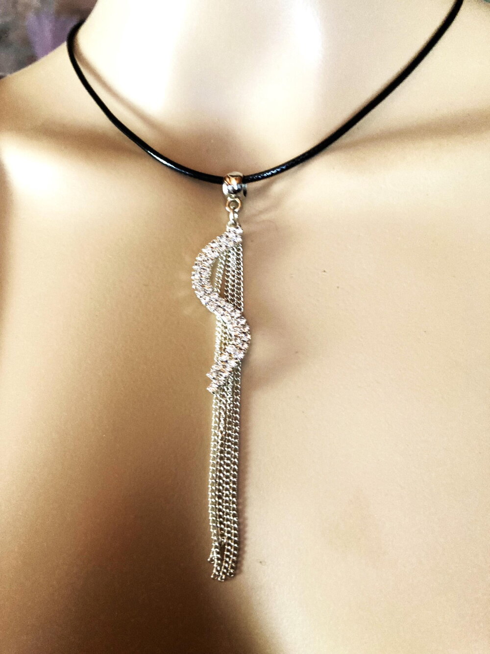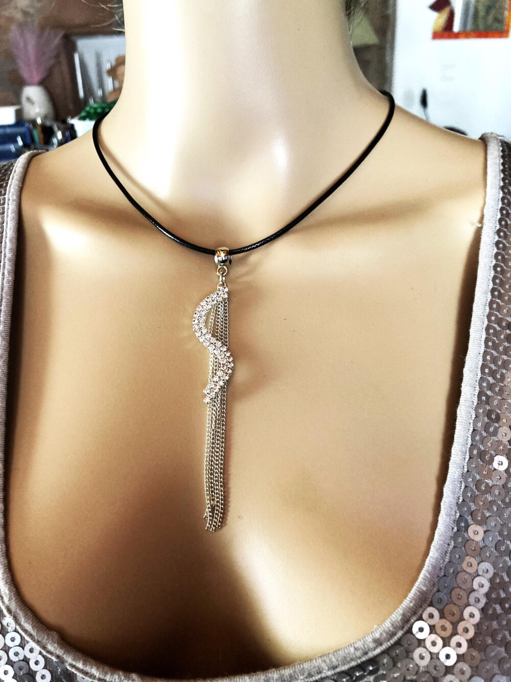 Pendentif élégant fin en métal argenté sur collier cordon en coton ciré noir. Peut facilement être porté sur une chaîne en argent. Bijou femme.