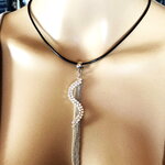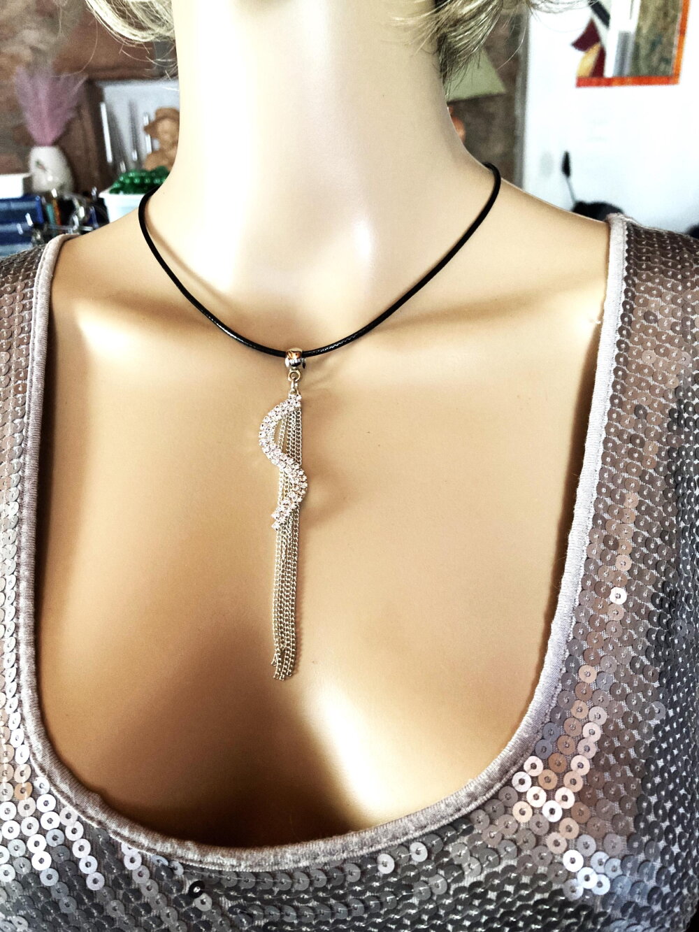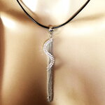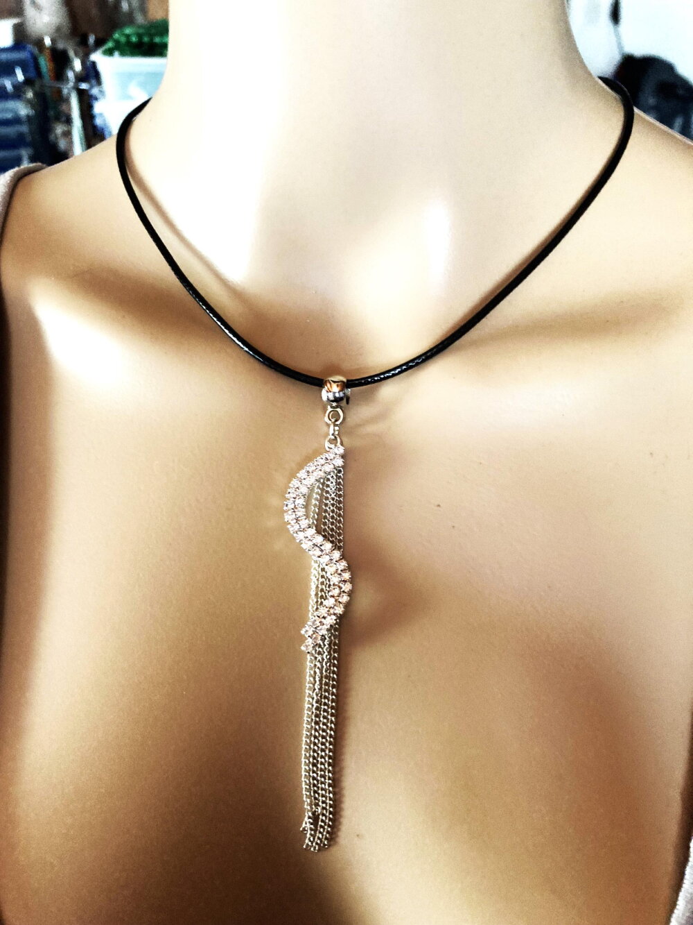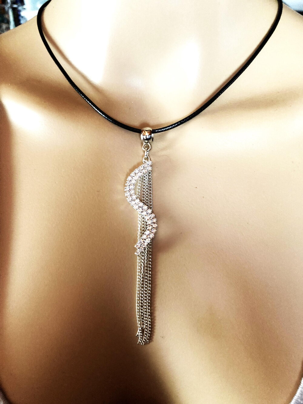 Pendentif élégant fin en métal argenté sur collier cordon en coton ciré noir. Peut facilement être porté sur une chaîne en argent. Bijou femme.