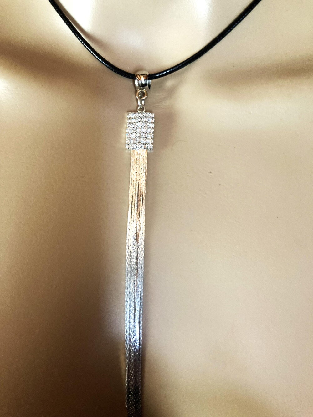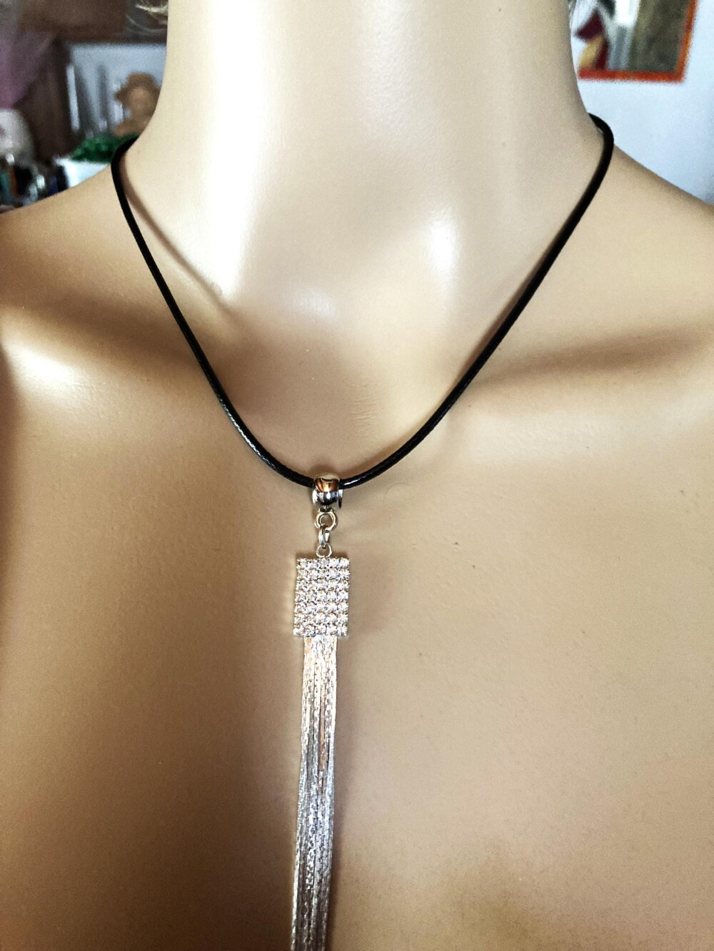Pendentif élégant fin en métal argenté sur collier cordon en coton ciré noir. Peut facilement être porté sur une chaîne en argent. Bijou femme.