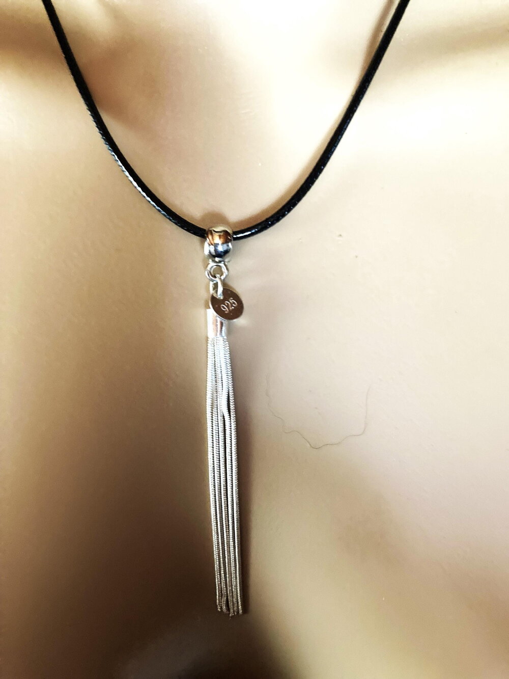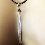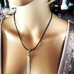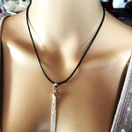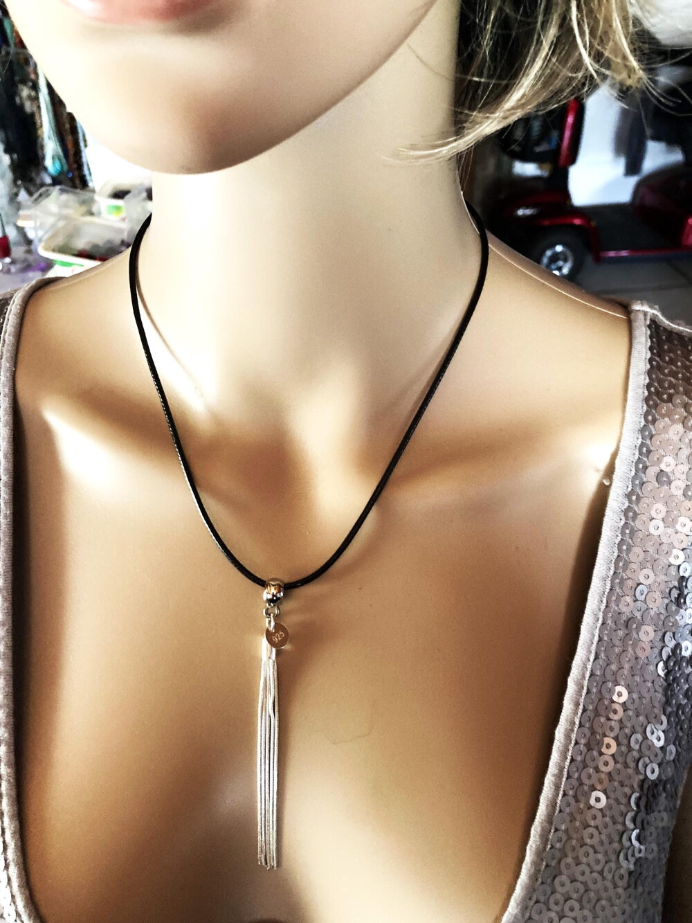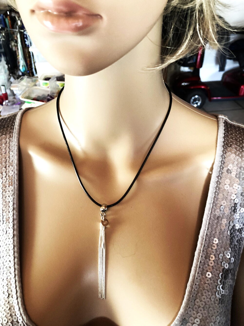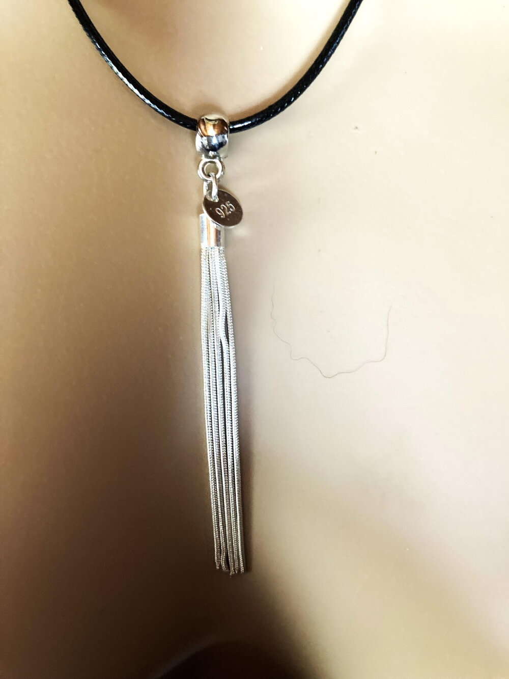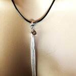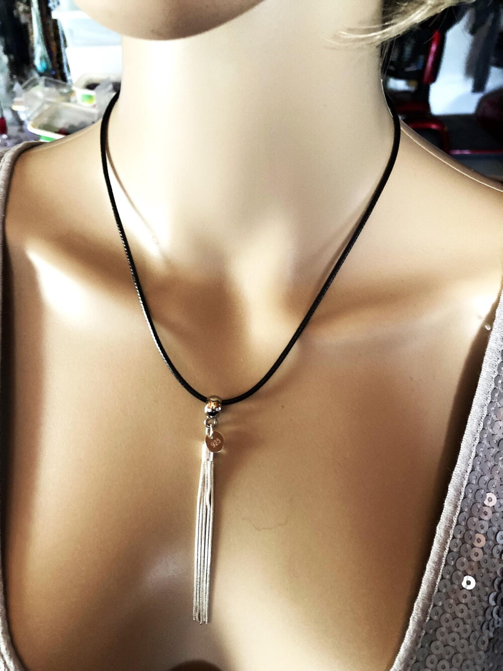 Pendentif élégant fin en métal argenté sur collier cordon en coton ciré noir. Peut facilement être porté sur une chaîne en argent. Bijou femme.