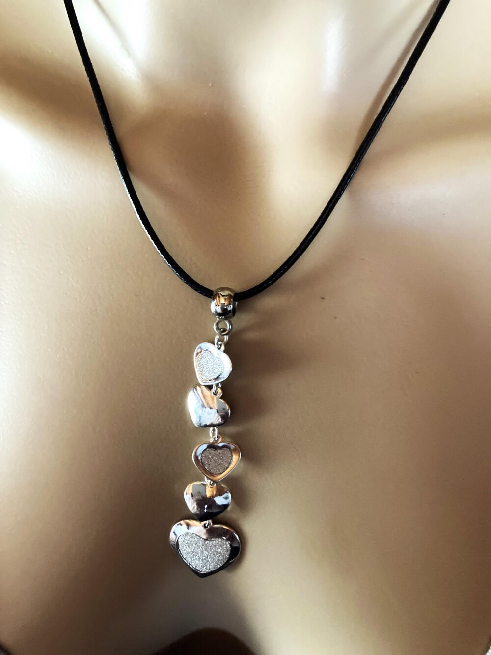 Pendentif élégant fin en métal argenté sur collier cordon en coton ciré noir. Peut facilement être porté sur une chaîne en argent. Bijou femme.