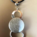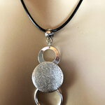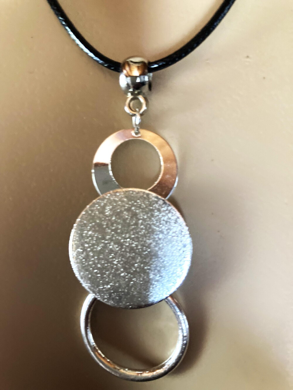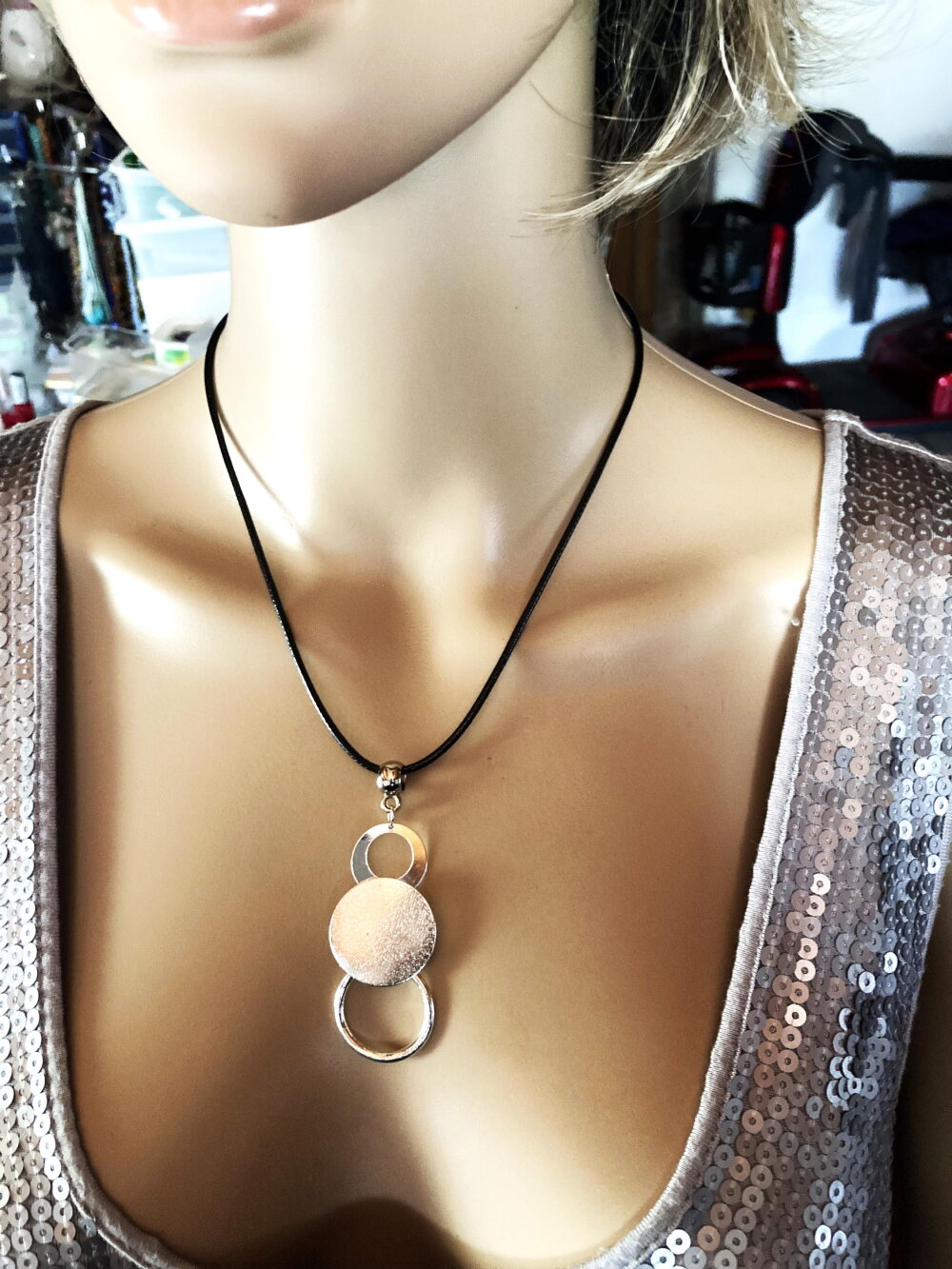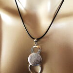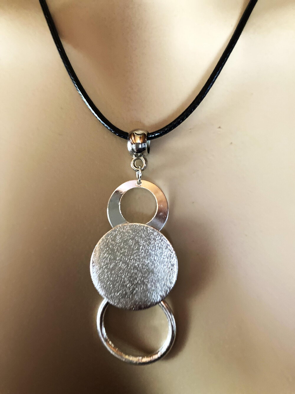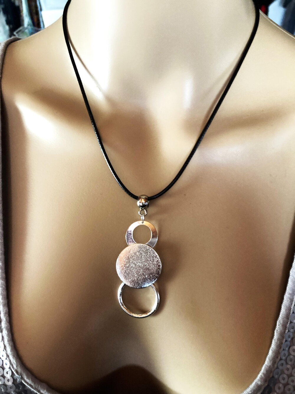 Pendentif élégant fin en métal argenté sur collier cordon en coton ciré noir. Peut facilement être porté sur une chaîne en argent. Bijou femme.
