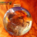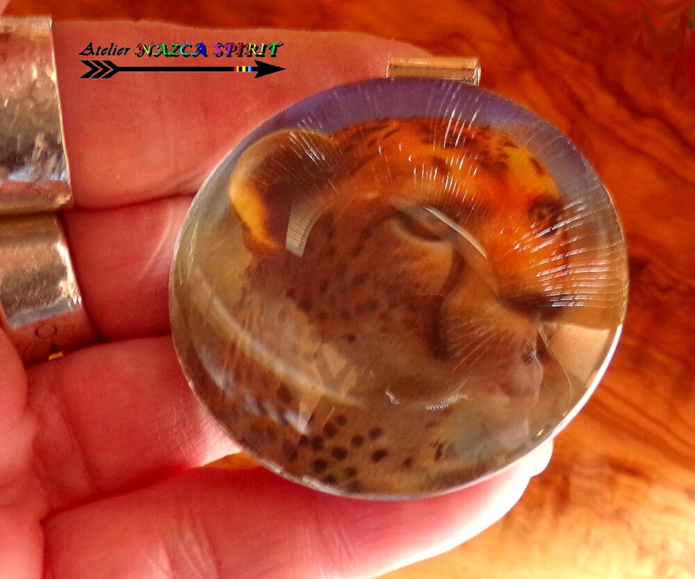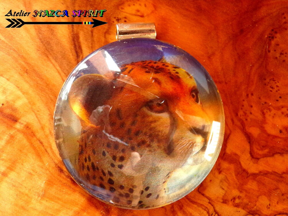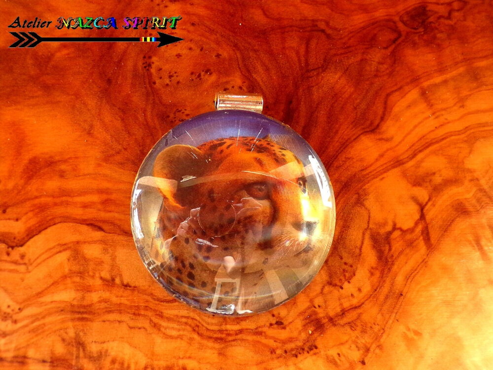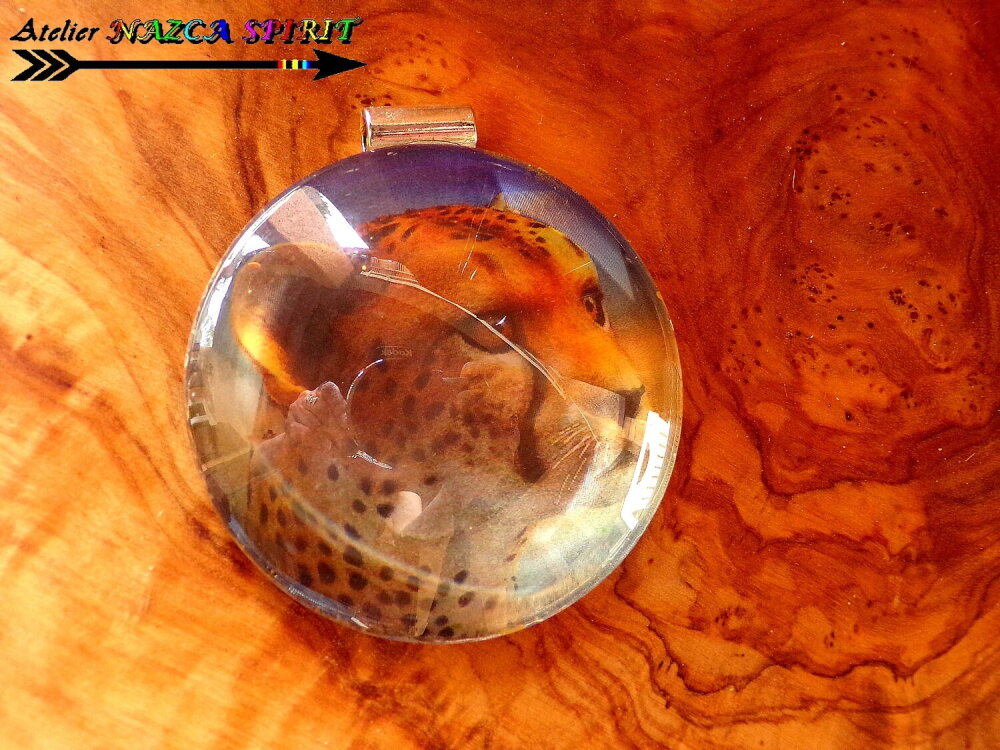 Ici, il s'agit d'un félin, qui en fonction de l'angle de vision de celui qui regarde le pendentif, semble bouger dans le cabochon. Image de très grande qualité !!!!! On a l'impression que le félin bouge et que son regard vous suit. Grâce au cabochon effet loupe, les effets 3D sont encore plus saisissants !