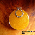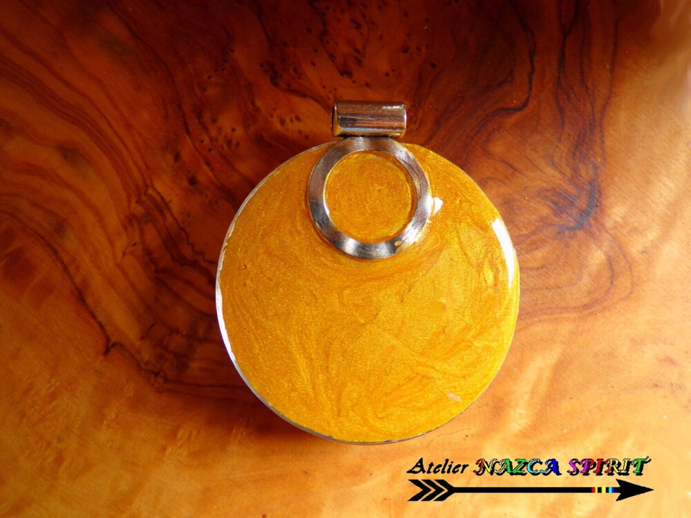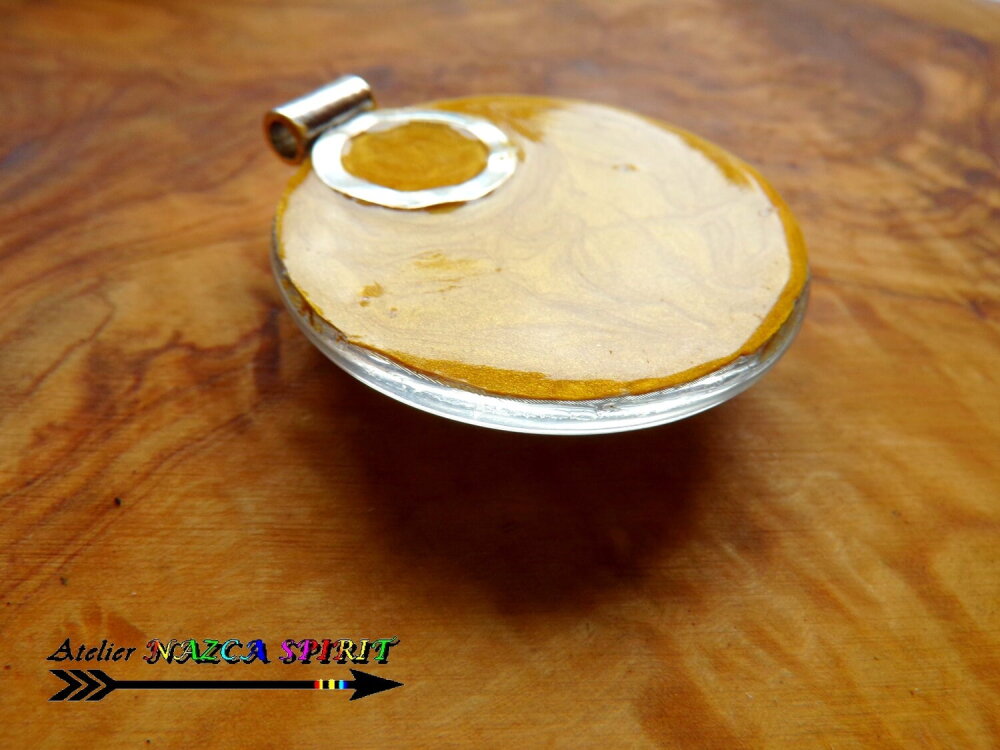Pour apporter à mon pendentif une finition très soignée , j'ai appliqué une couche de résine teintée Or et j'ai fusionné un très belle bélière design en alliage tibétain.