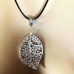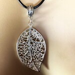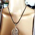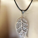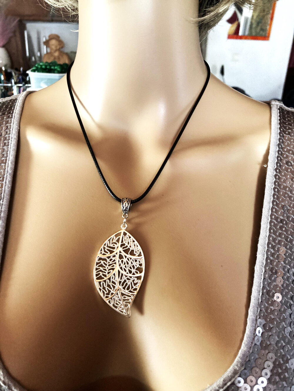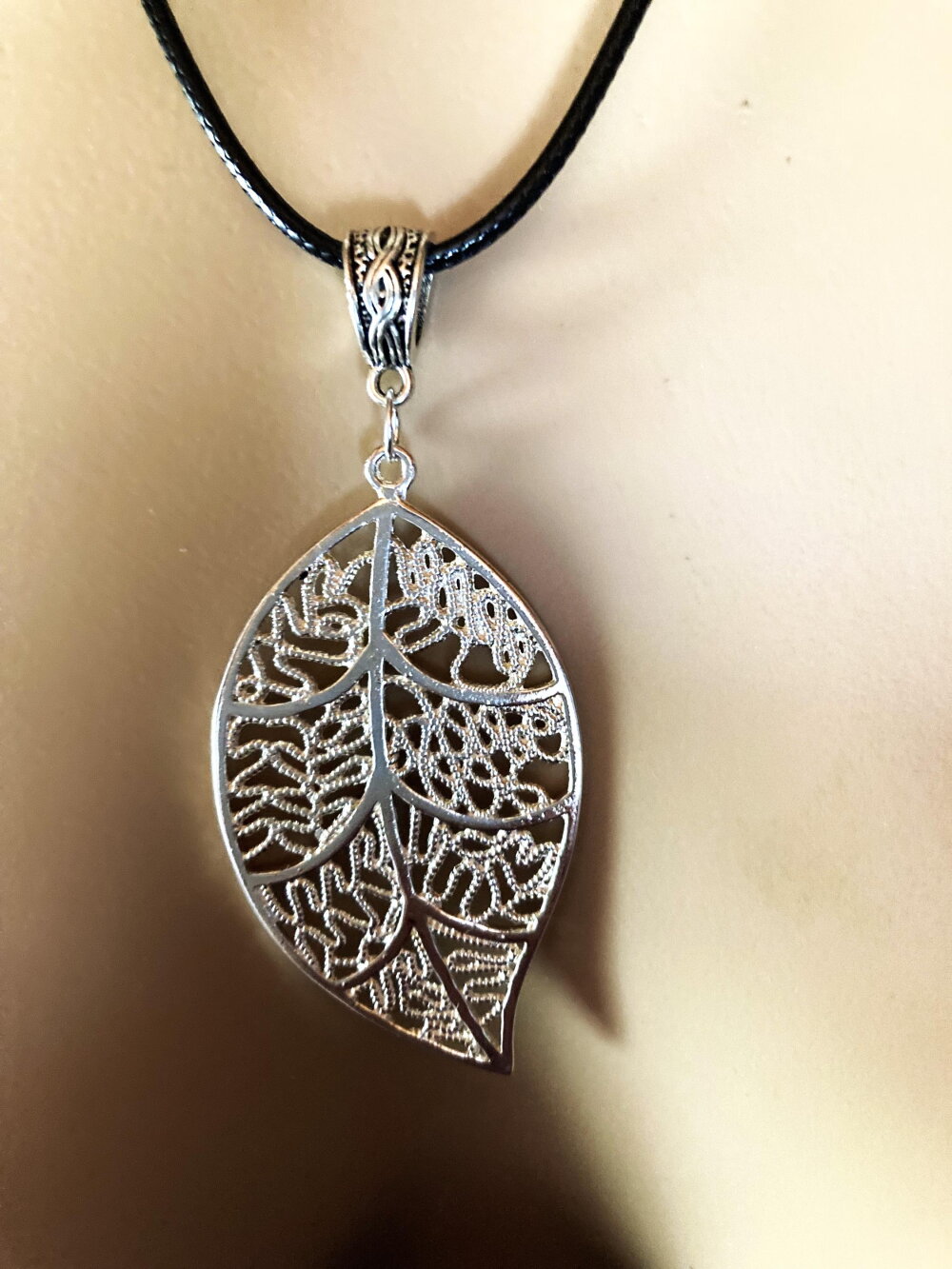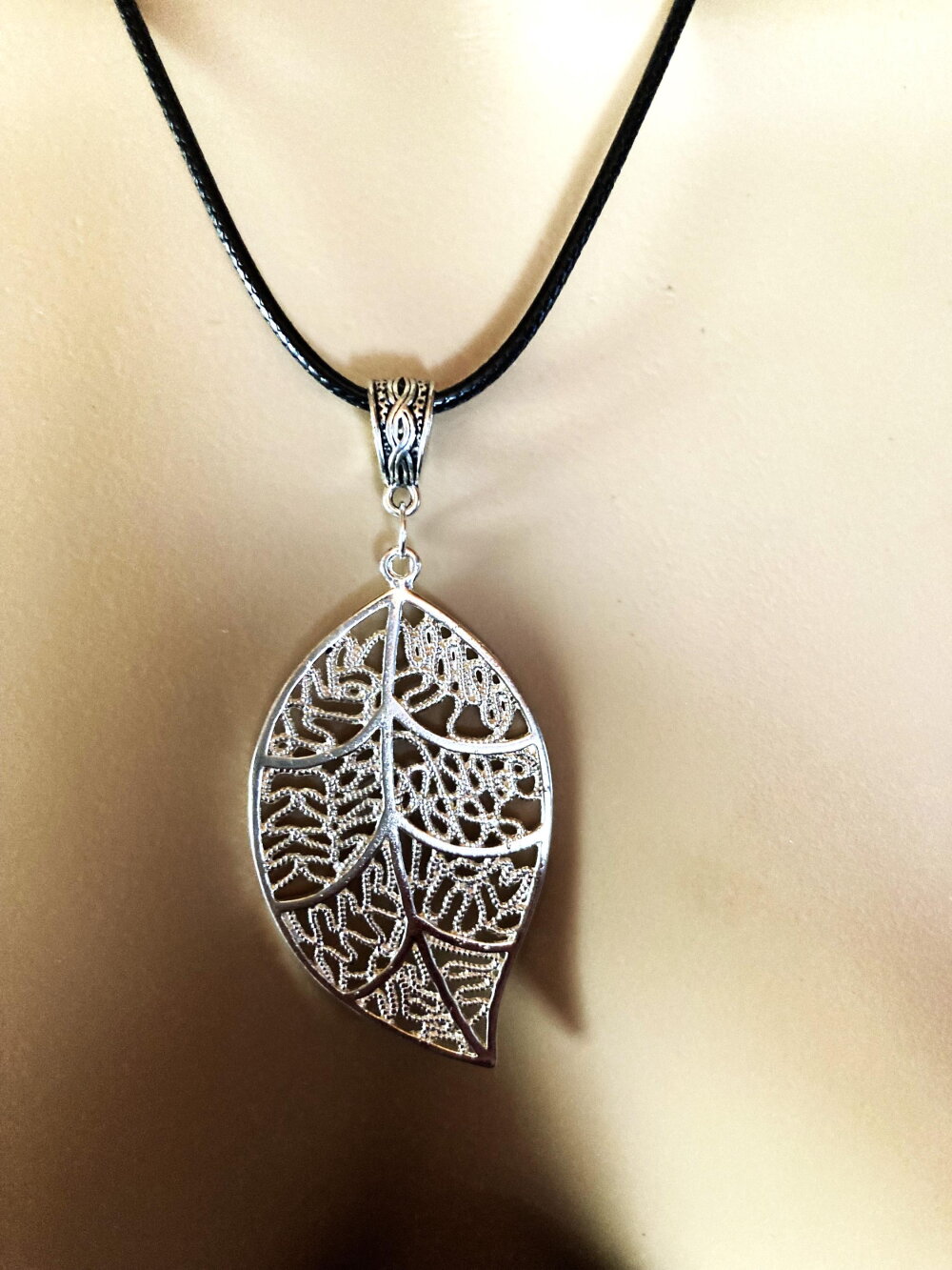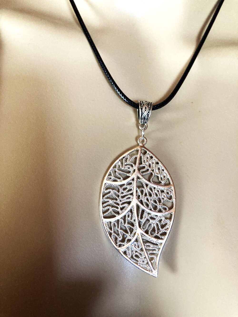 Très beau pendentif feuille ciselé en métal argenté sur collier cordon en coton ciré noir. Bijou femme.