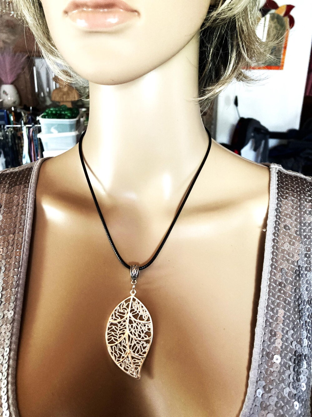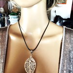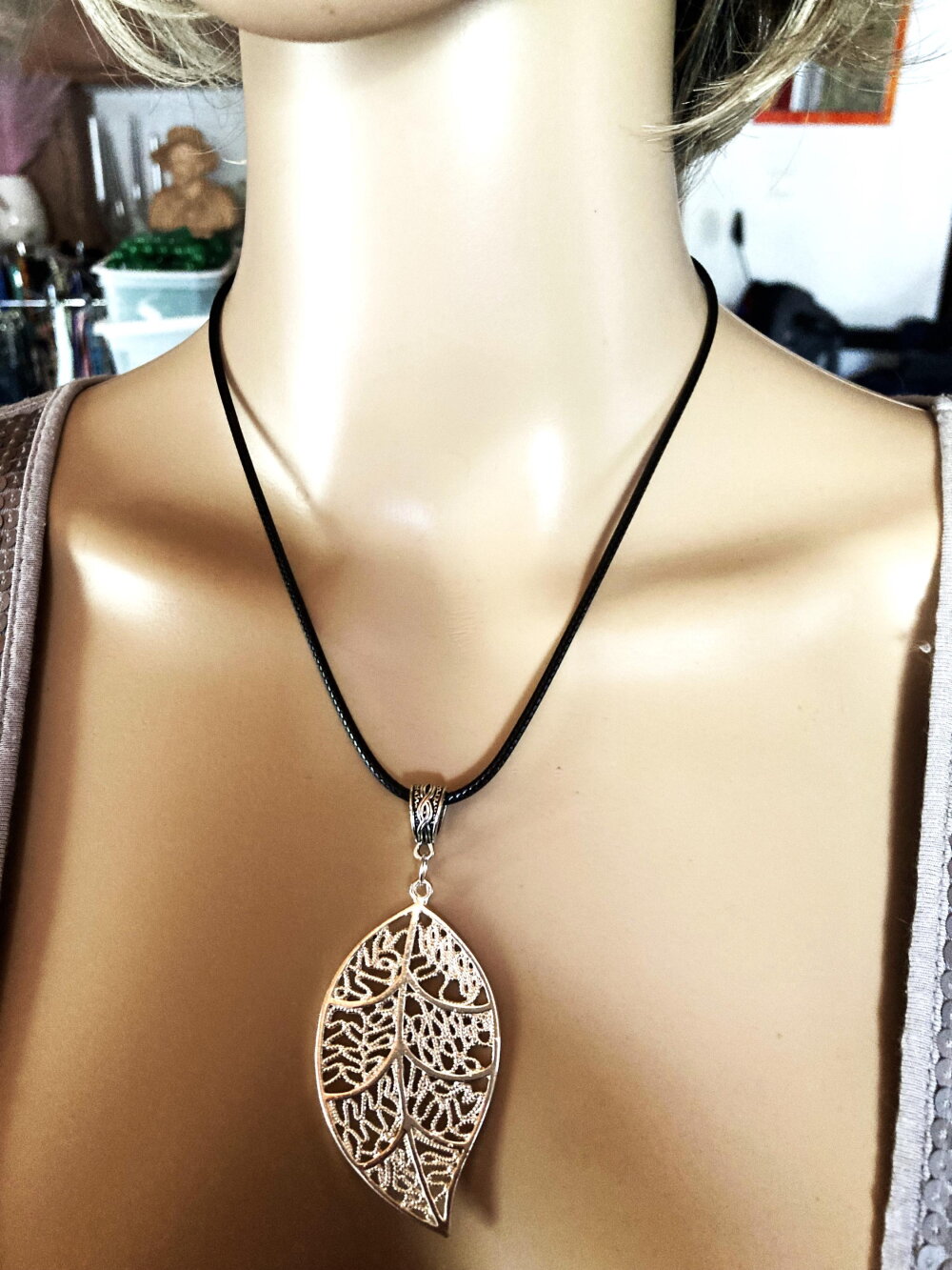 Pendentif feuille sur collier cordon en coton ciré noir 45/50 cm Bijou femme