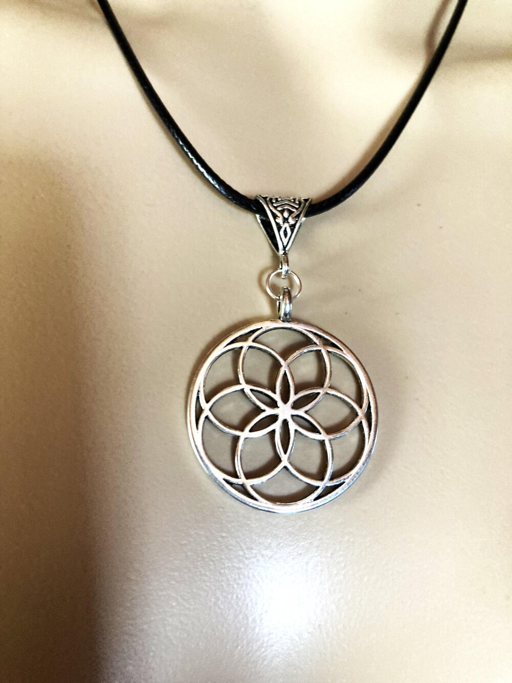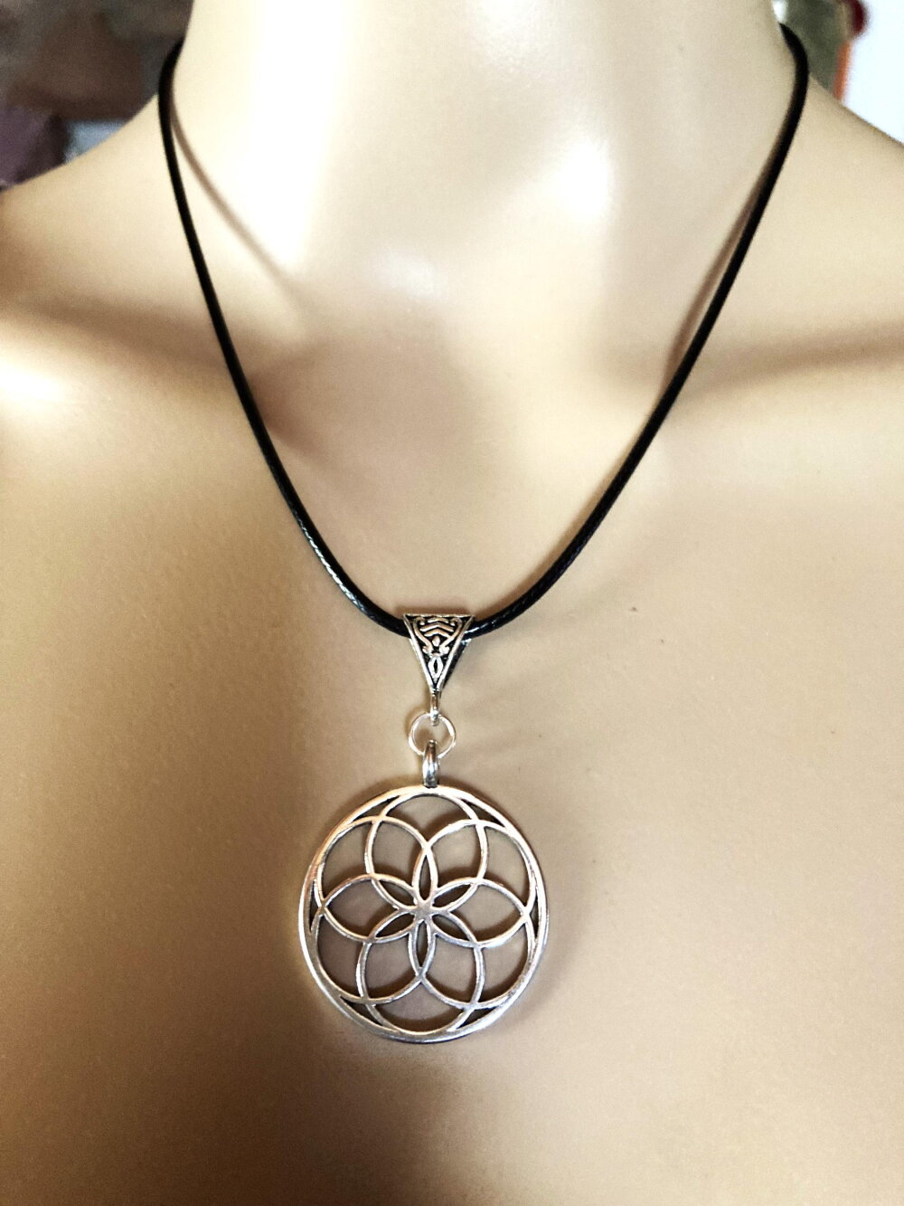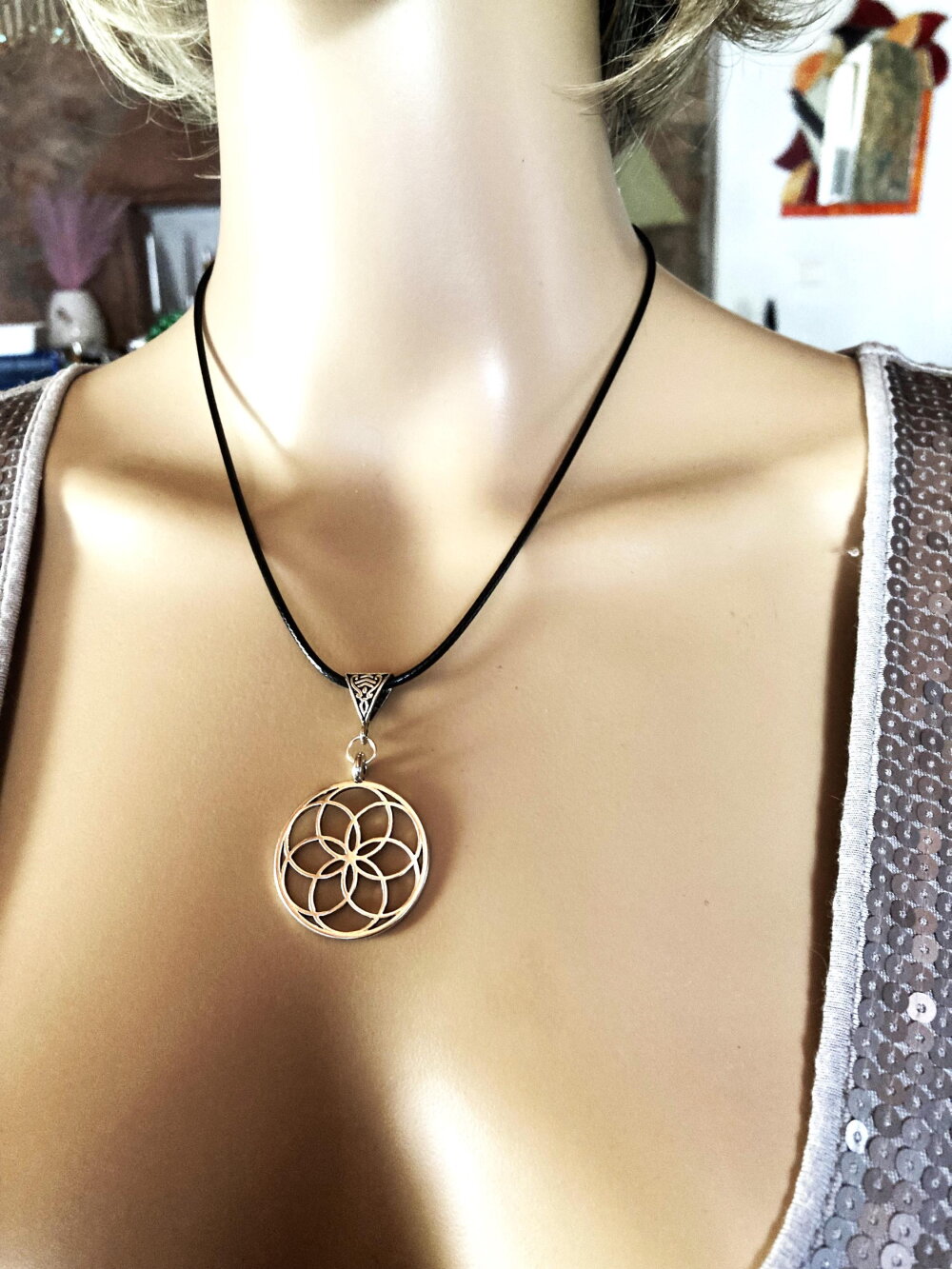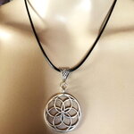 Pendentif fleur de vie en acier inoxydable sur collier cordon en coton ciré noir 45/50 cm Bijou femme