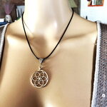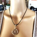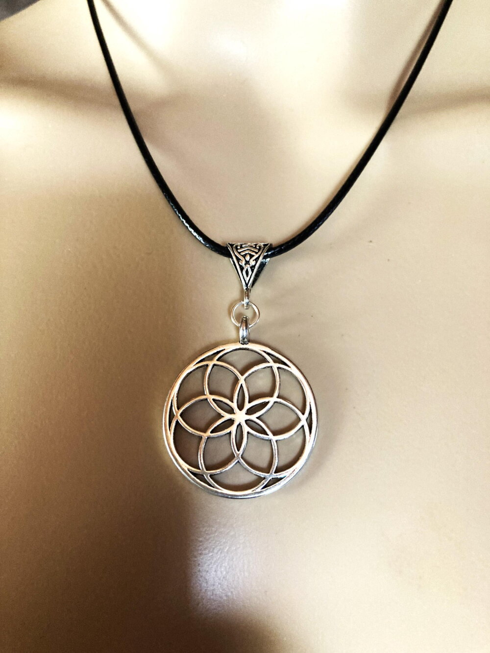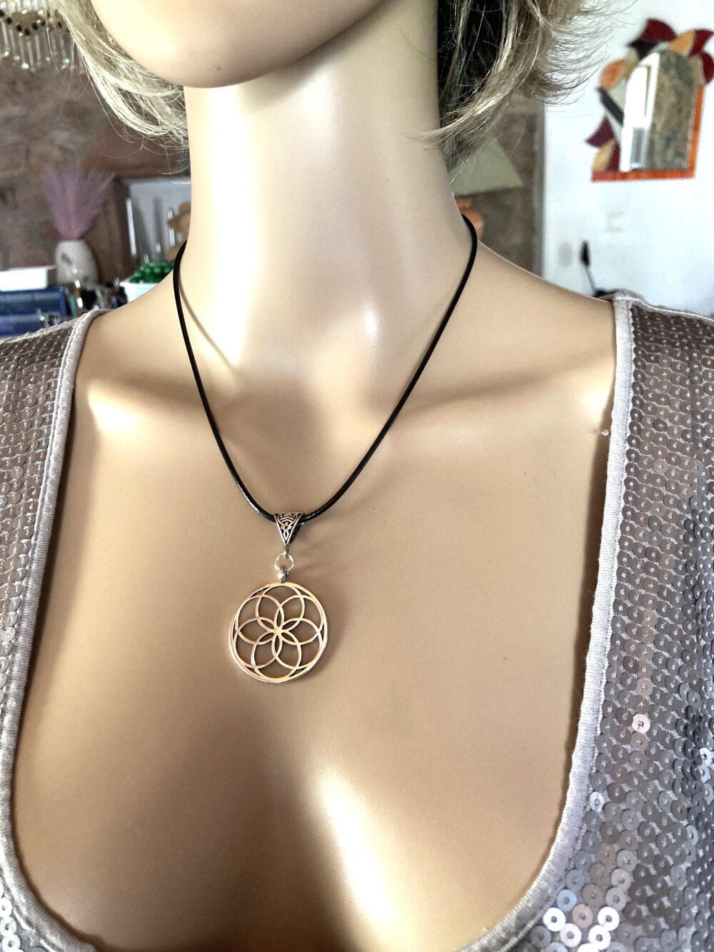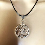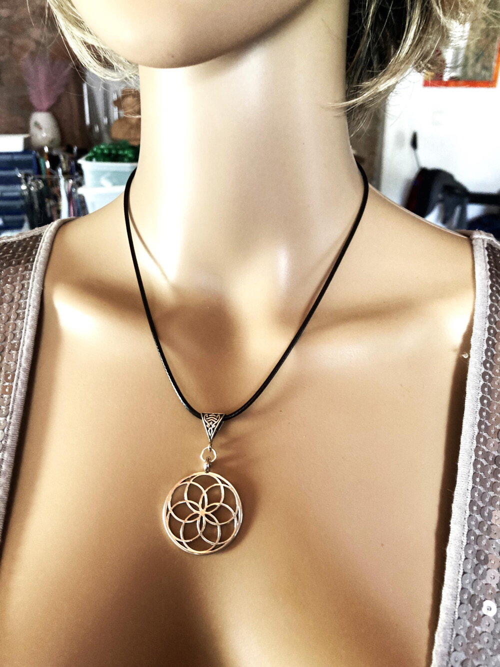 Pendentif fleur de vie en acier inoxydable sur collier cordon en coton ciré noir 45/50 cm Bijou femme