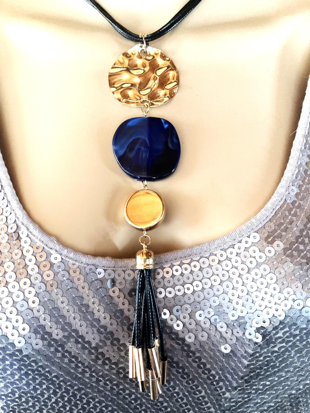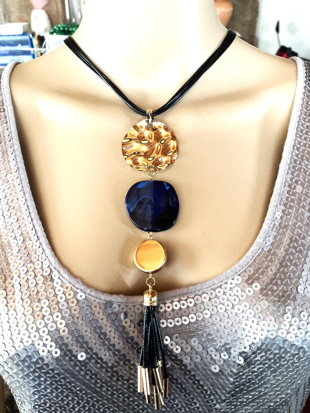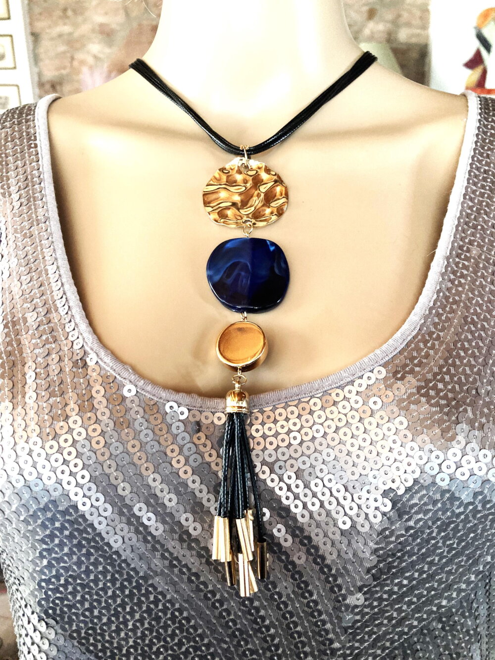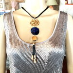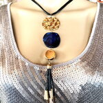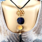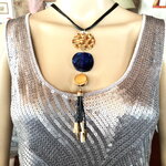 Très beau pendentif doré et bleu en métal martelé doré, pierre plate bleue et pendants noir et métal doré sur collier/sautoir réglable 4 cordons noir. Bijou femme.