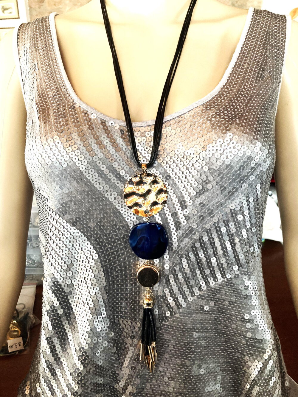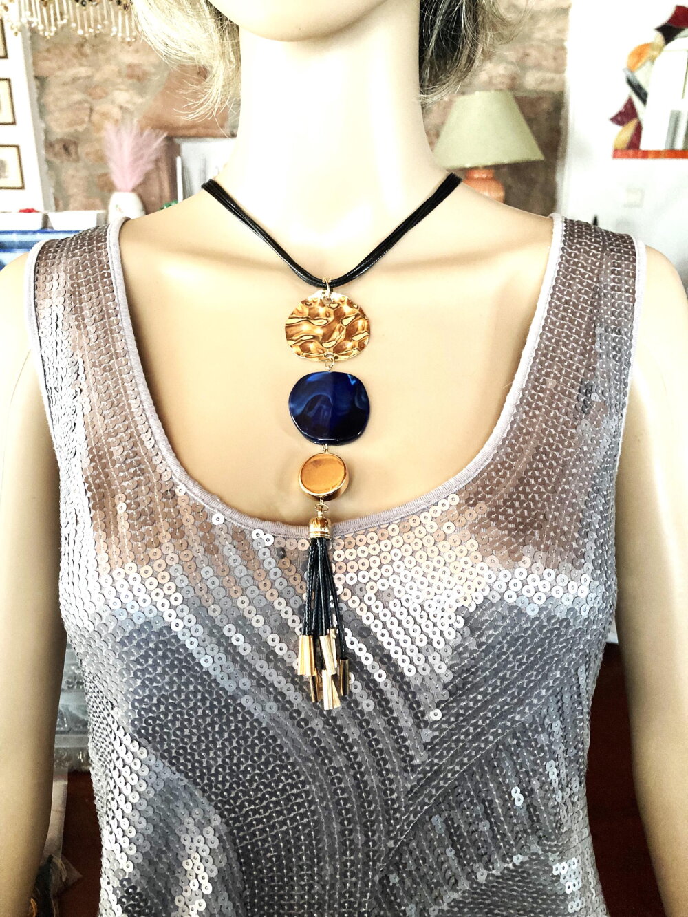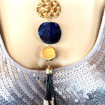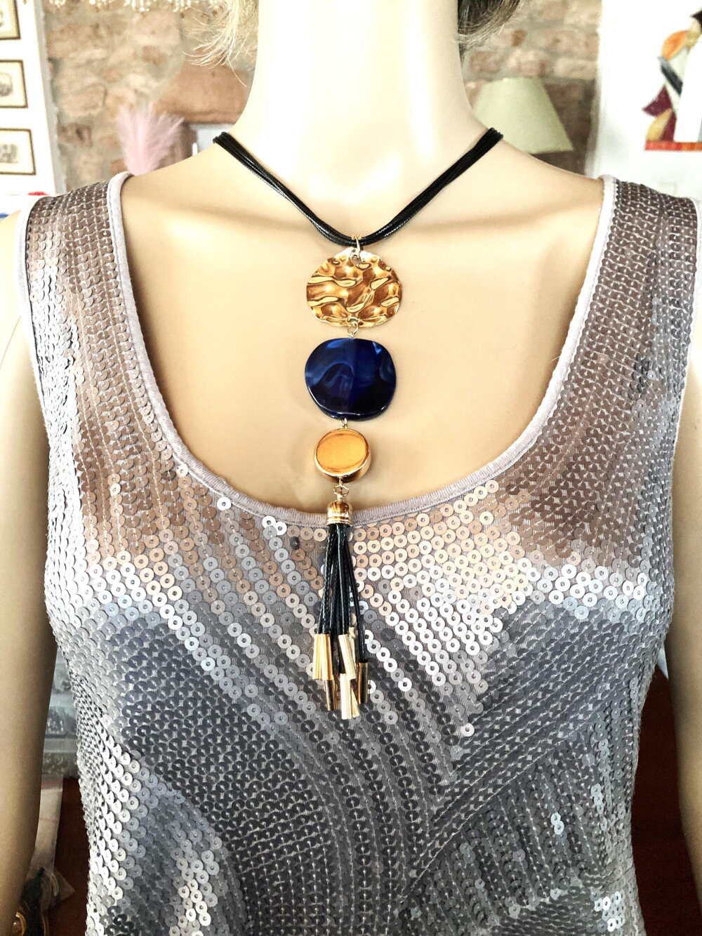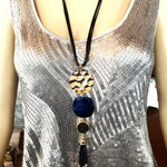 Très beau pendentif doré et bleu en métal martelé doré, pierre plate bleue et pendants noir et métal doré sur collier/sautoir réglable 4 cordons noir. Bijou femme.