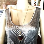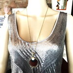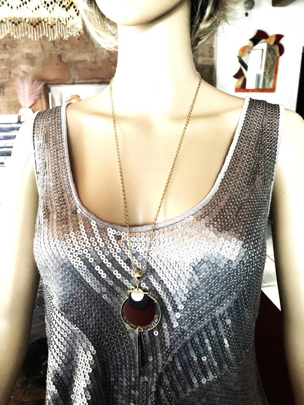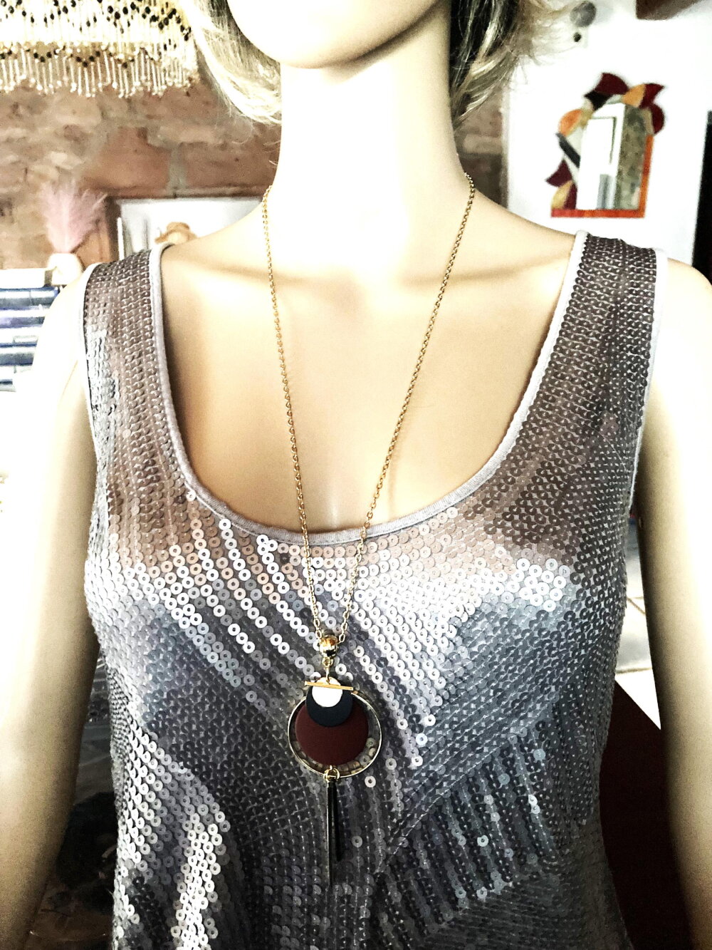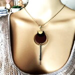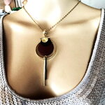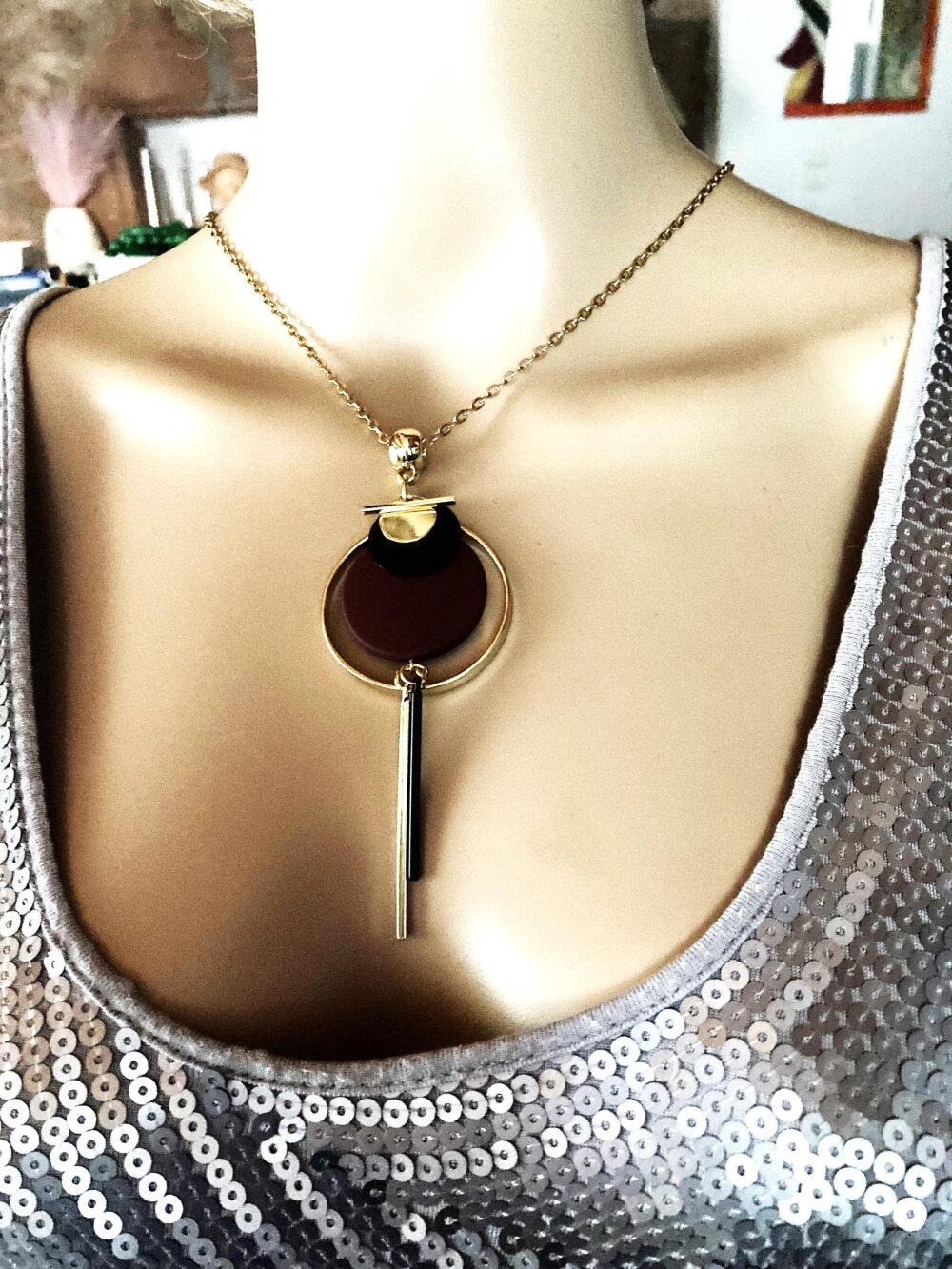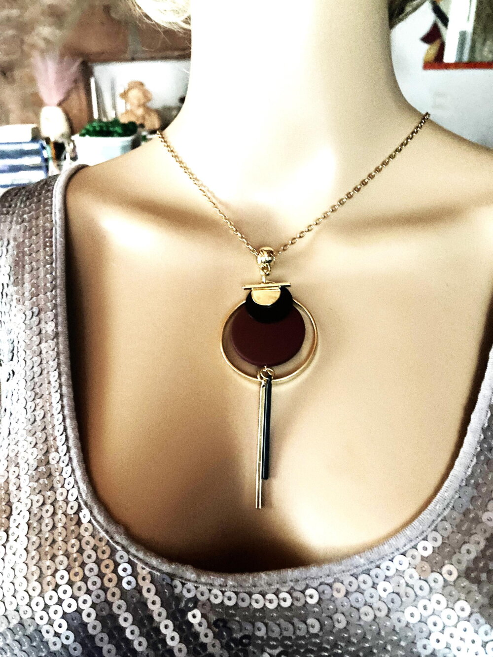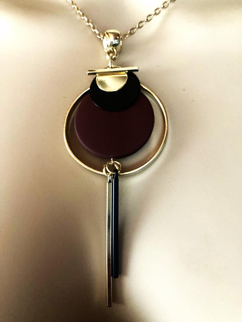 Très beau pendentif doré et bordeaux , sur collier/sautoir chaîne dorée . Bijou femme.