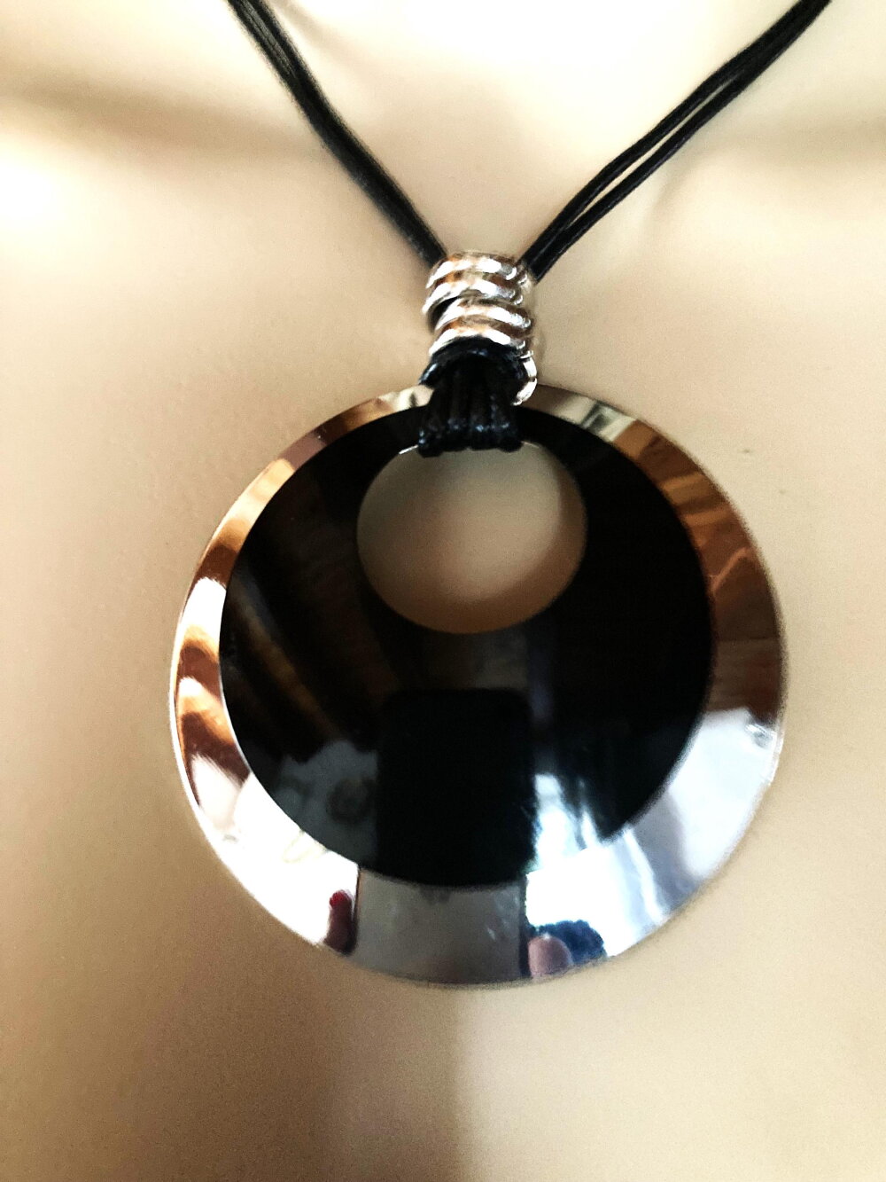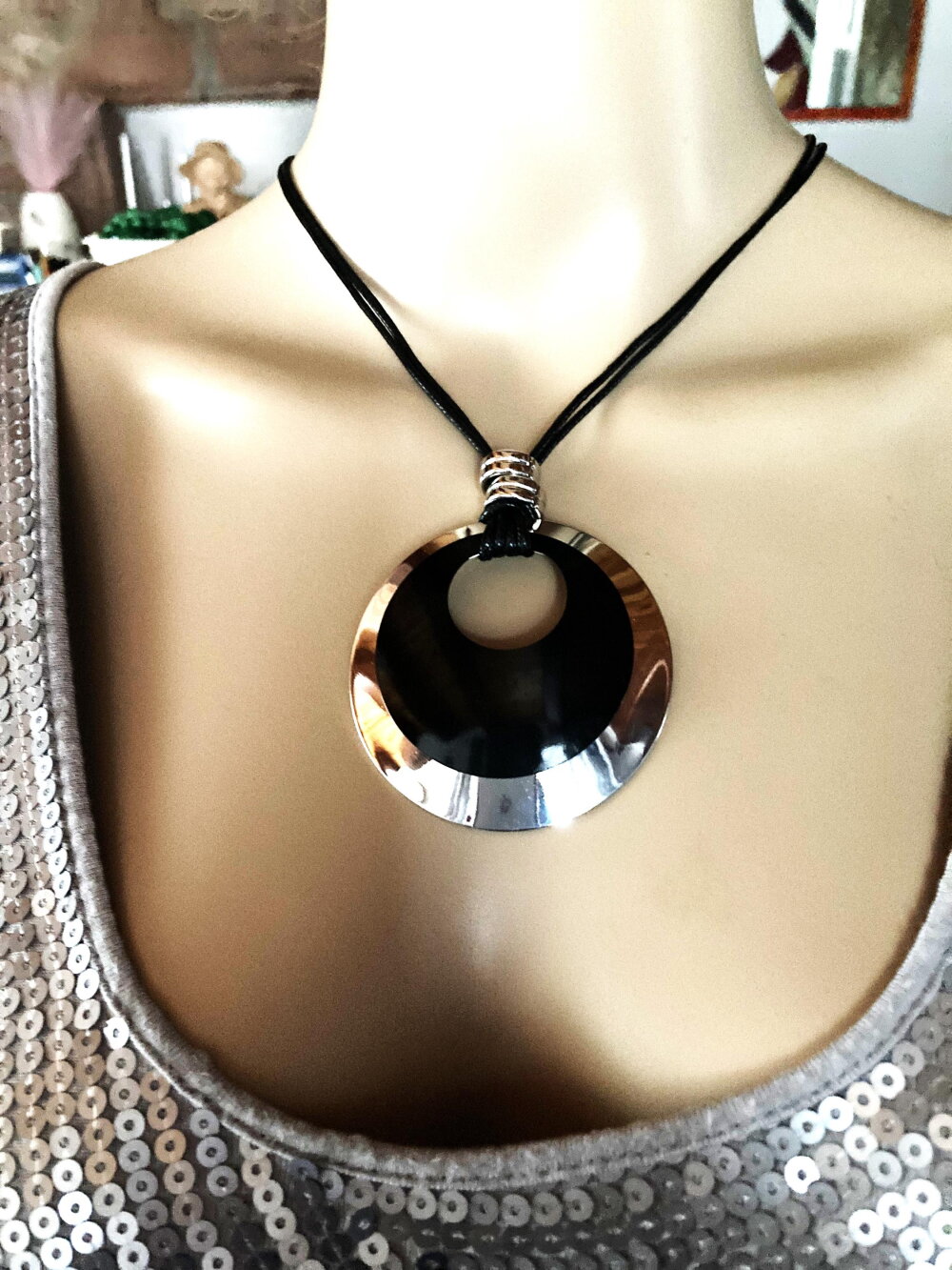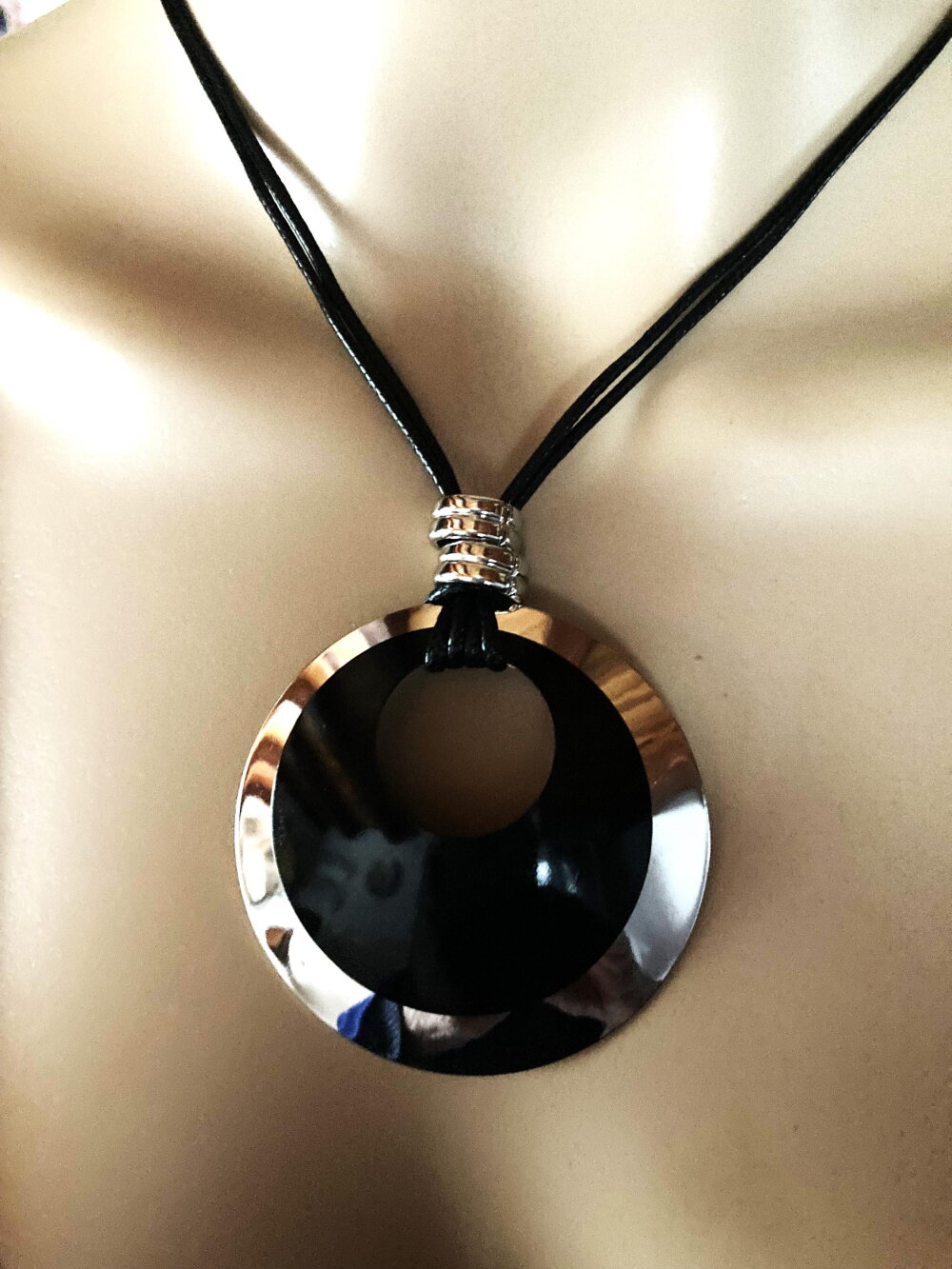 Très beau pendentif en métal argenté et noir, sur collier/sautoir réglable 2 cordons noir. Bijou femme.