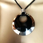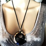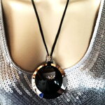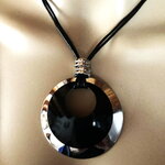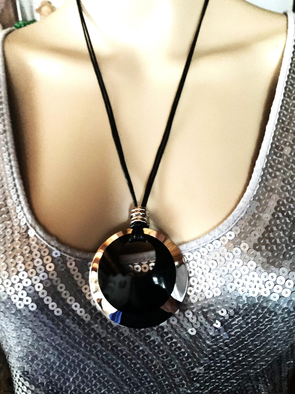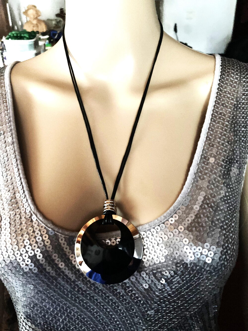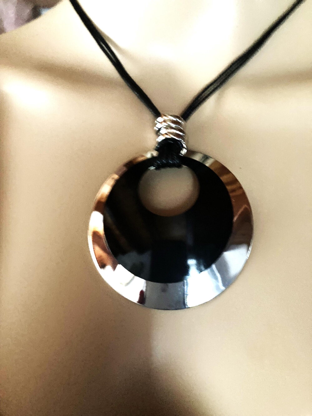 Très beau pendentif en métal argenté et noir, sur collier/sautoir réglable 2 cordons noir. Bijou femme.