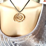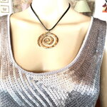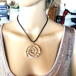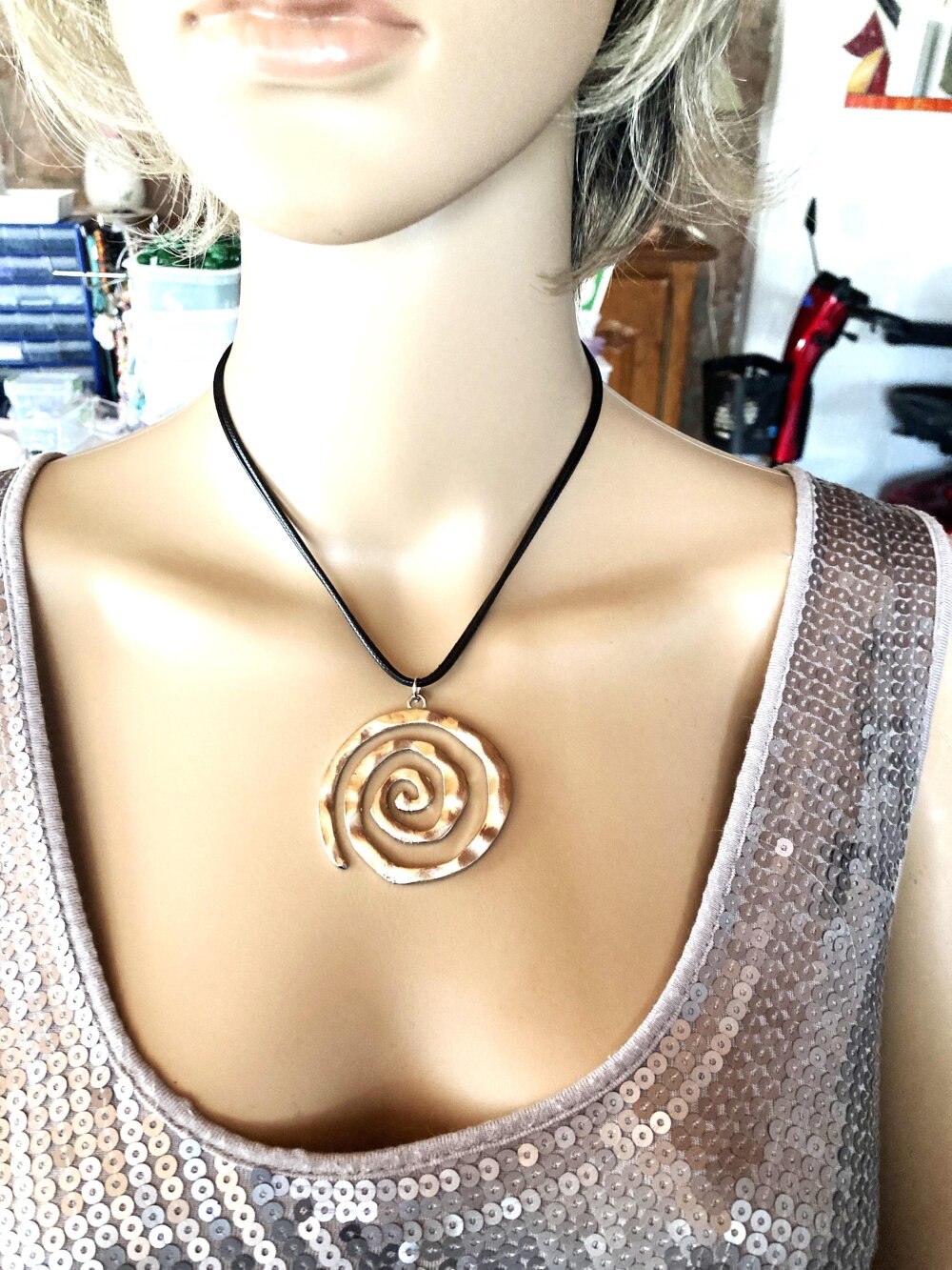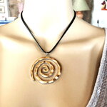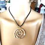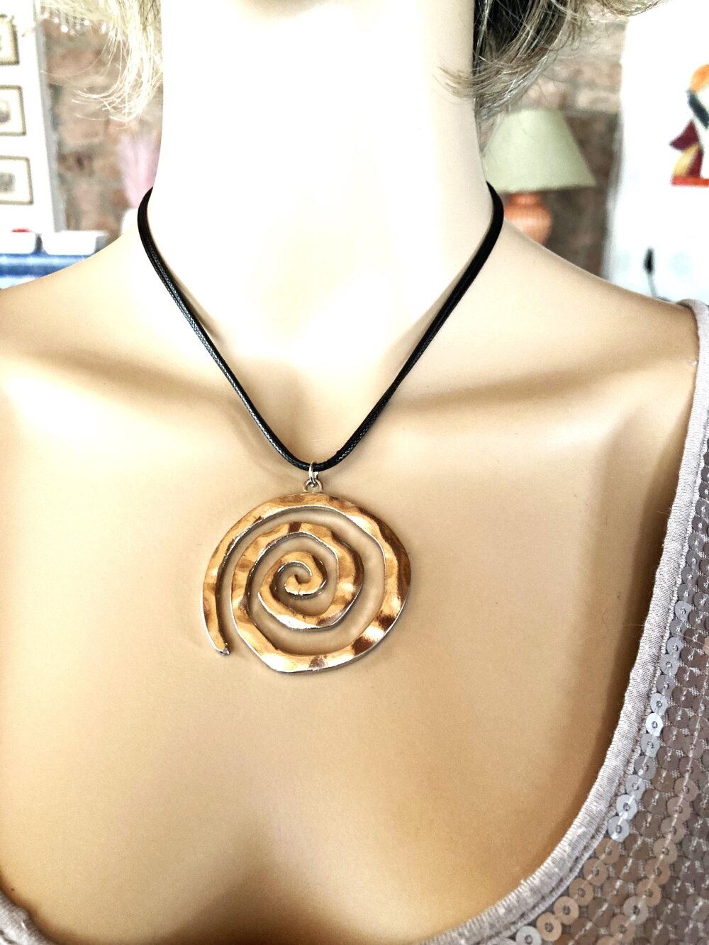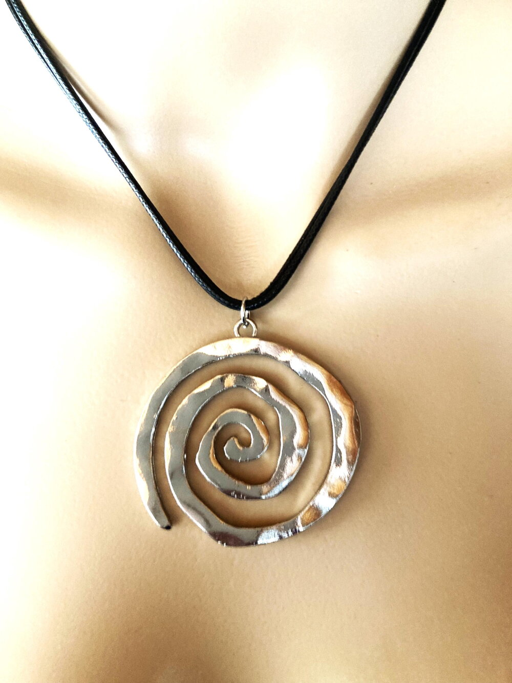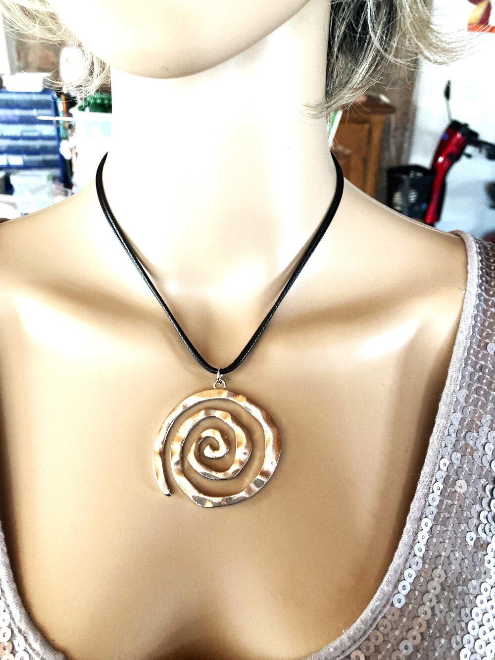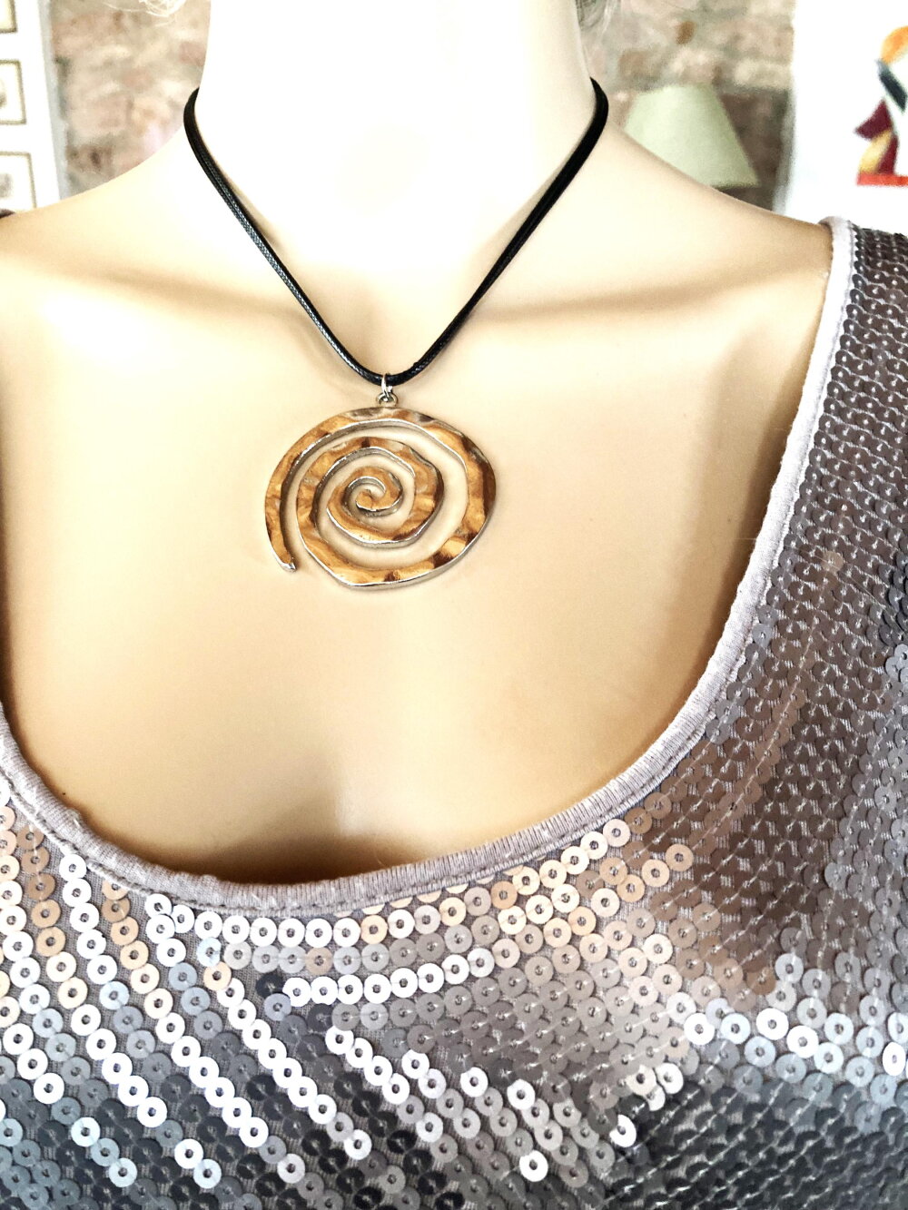 Très beau pendentif original en métal martelé argenté sur collier double cordon en coton noir. Bijou femme.