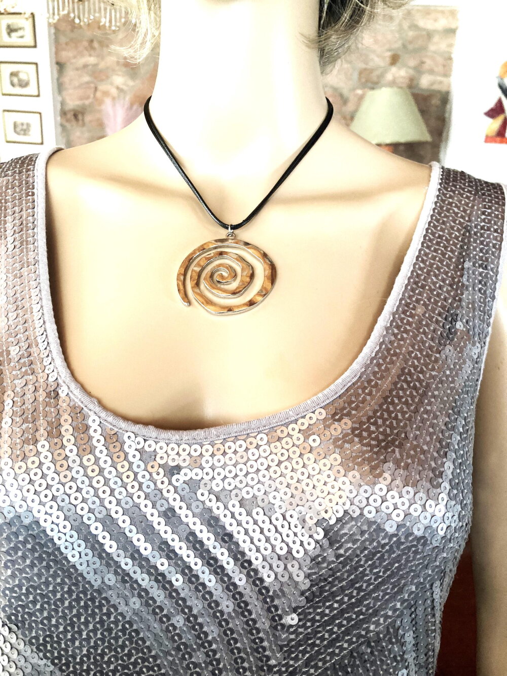 Pendentif original en métal argenté martelé sur collier double cordon en coton noir 40/45 cm Bijou femme