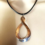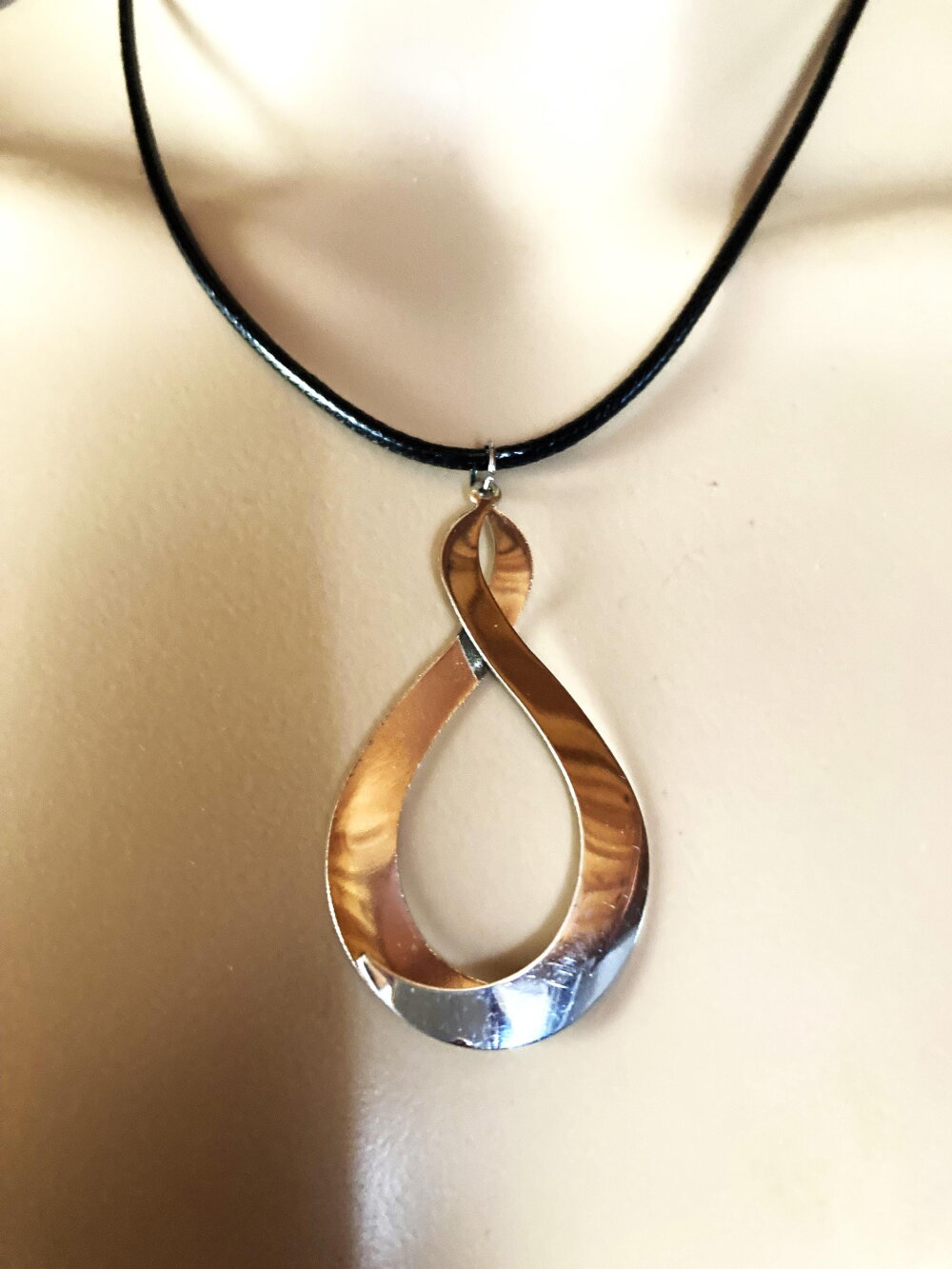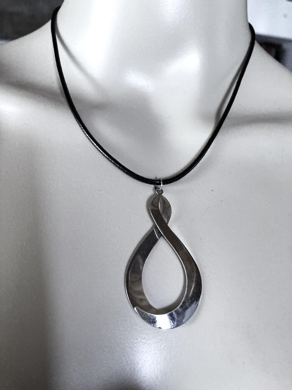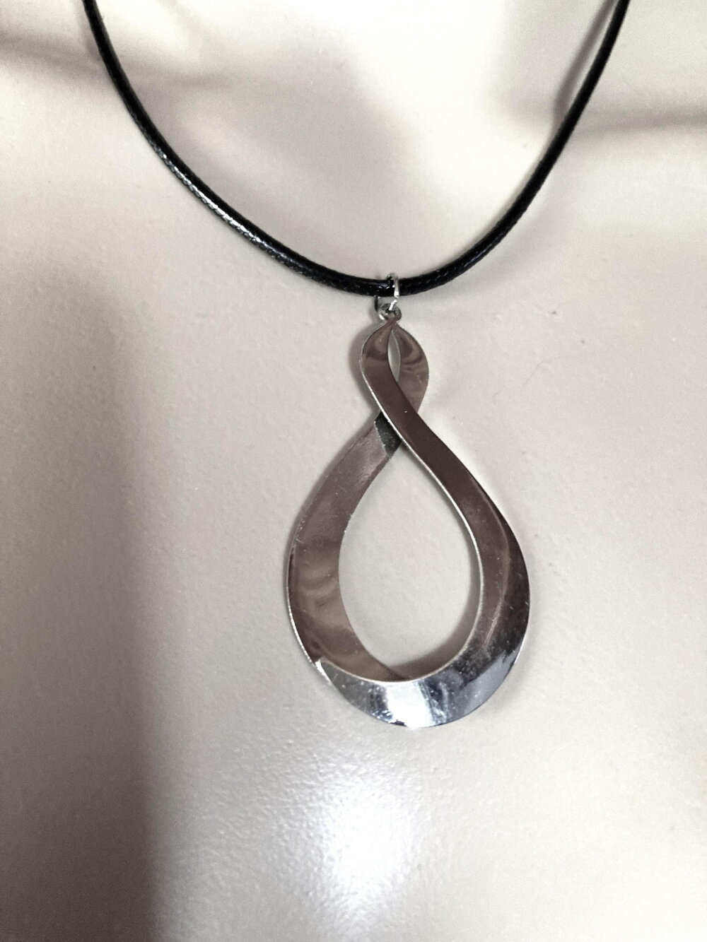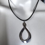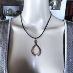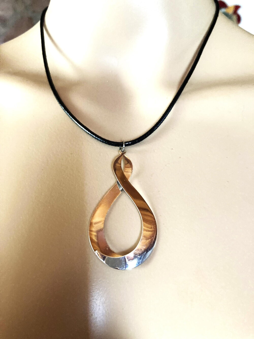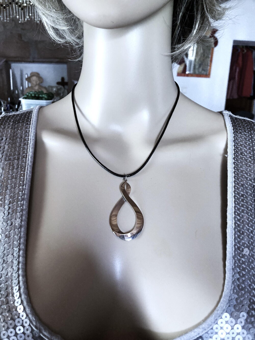 Très beau pendentif fin original en métal argenté sur collier cordon en coton ciré noir. Bijou femme.