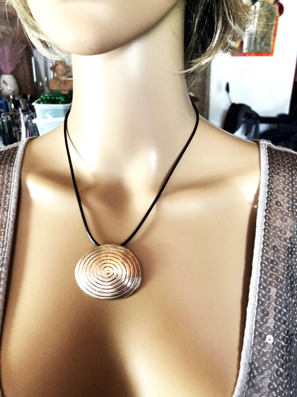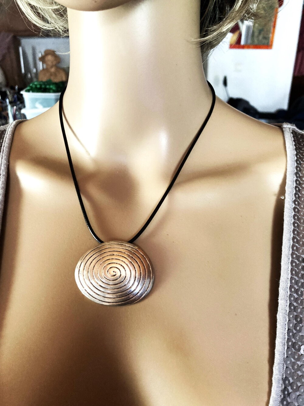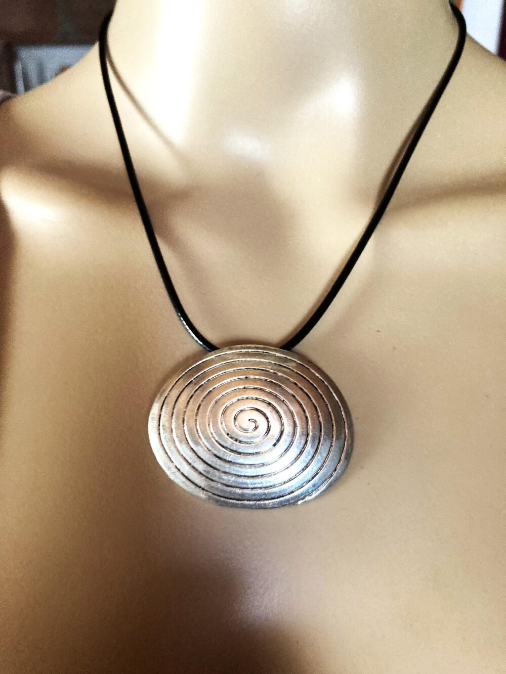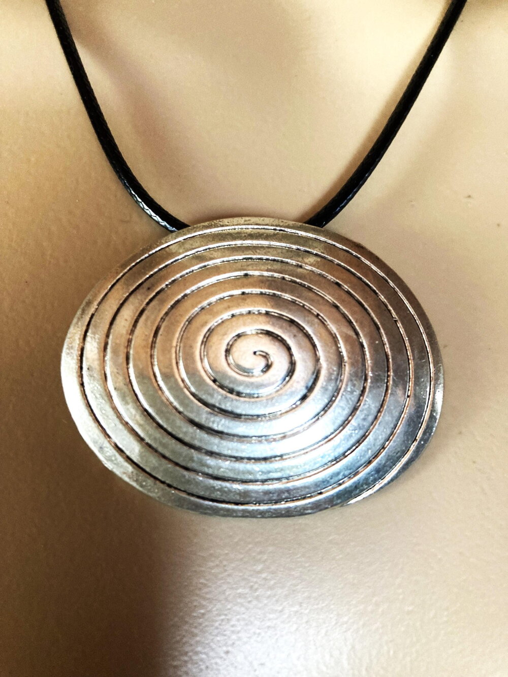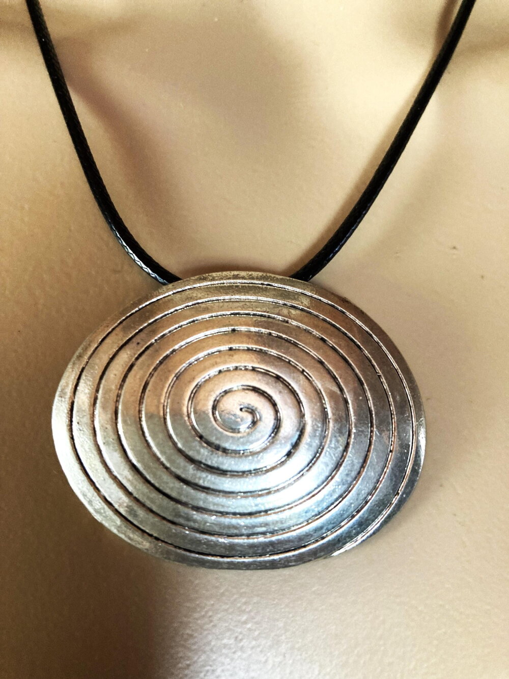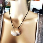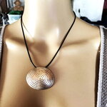 Pendentif original oval en métal sur collier cordon en coton ciré noir 45/50 cm Bijou femme