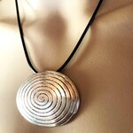 Très beau pendentif original en métal argenté sur collier cordon en coton ciré noir. Bijou femme.