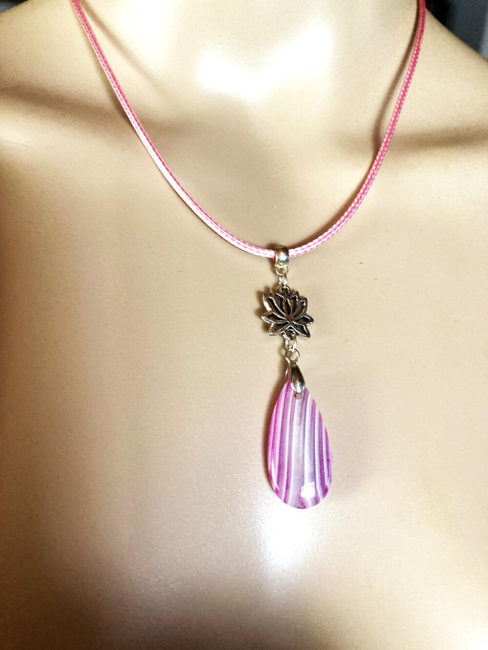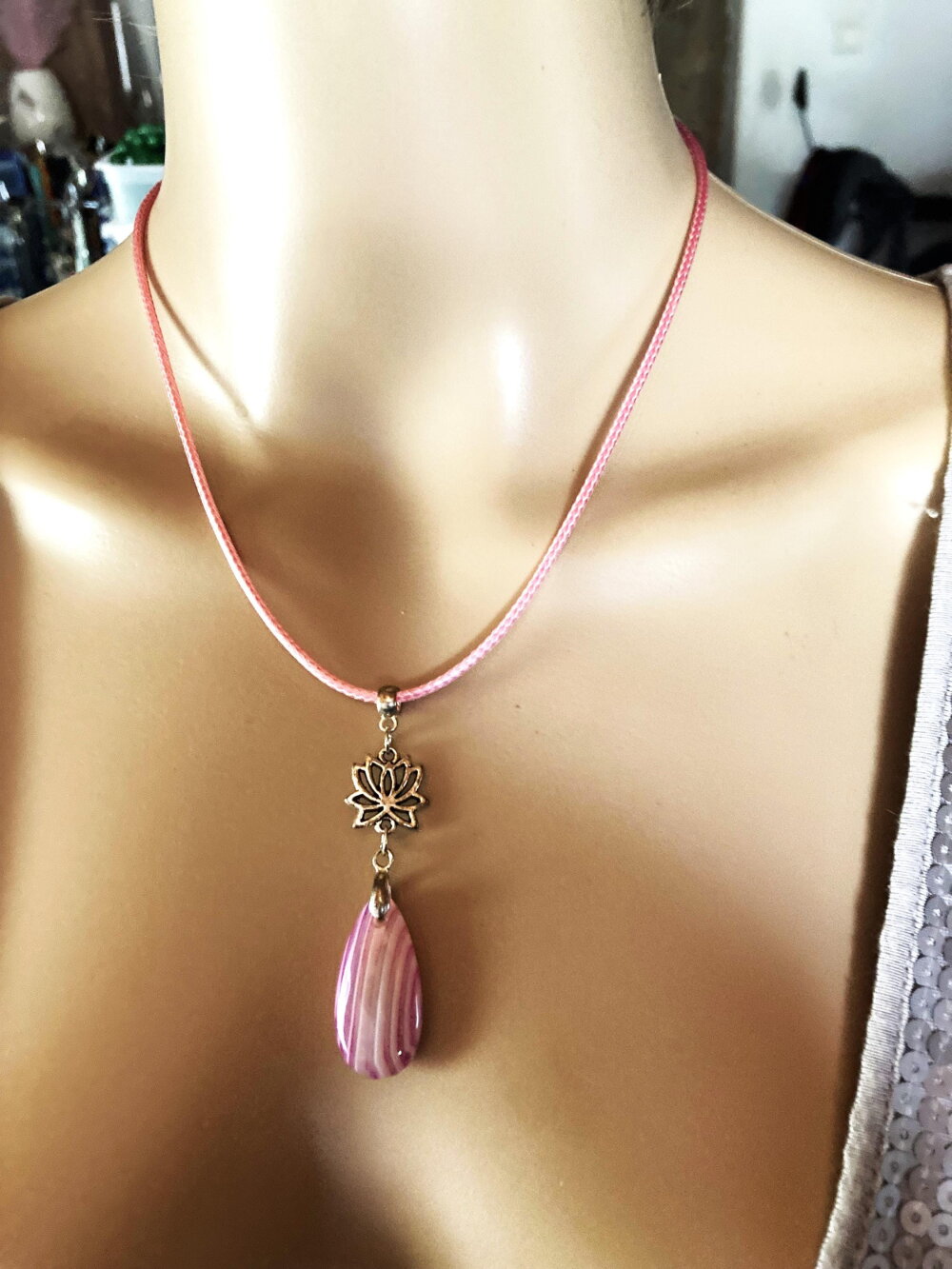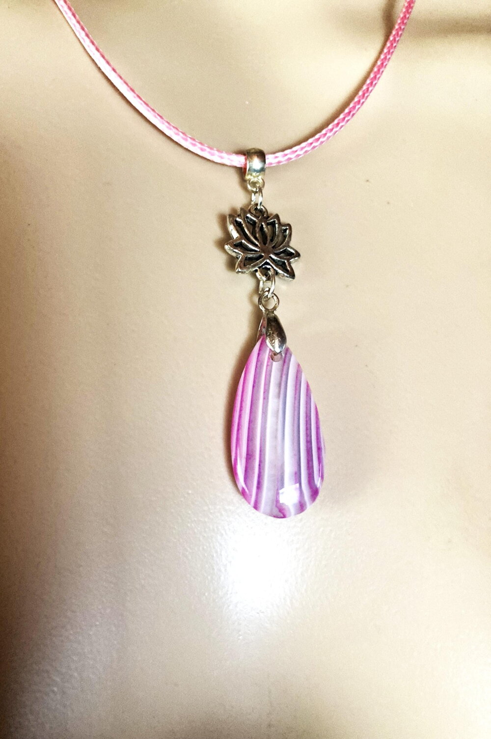 Pendentif pierre en agate rose rayé et fleur de lotus sur collier cordon rose ou noir. Bijou femme.