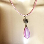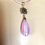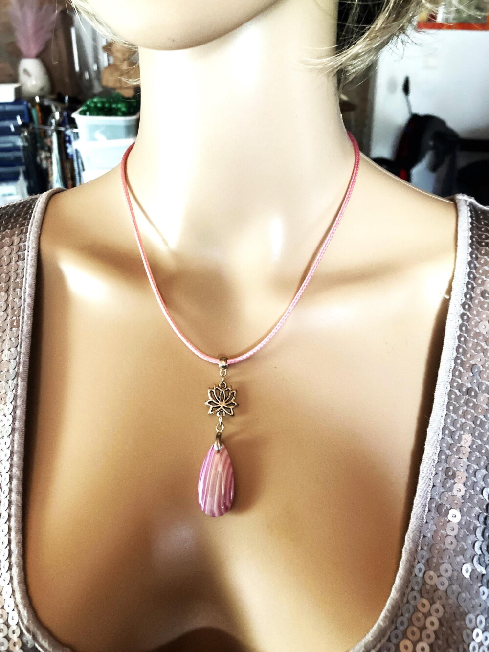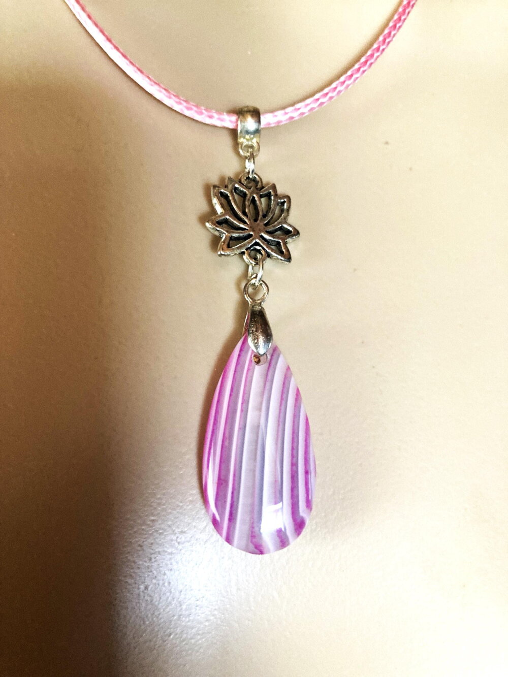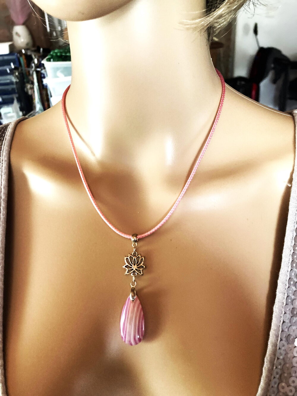 Pendentif pierre en agate rose rayé et fleur de lotus sur collier cordon rose ou noir. Bijou femme.