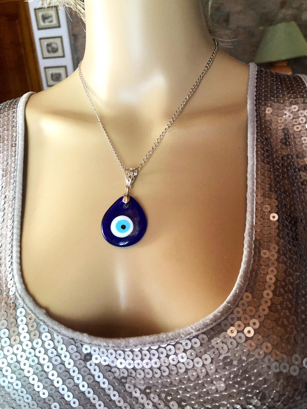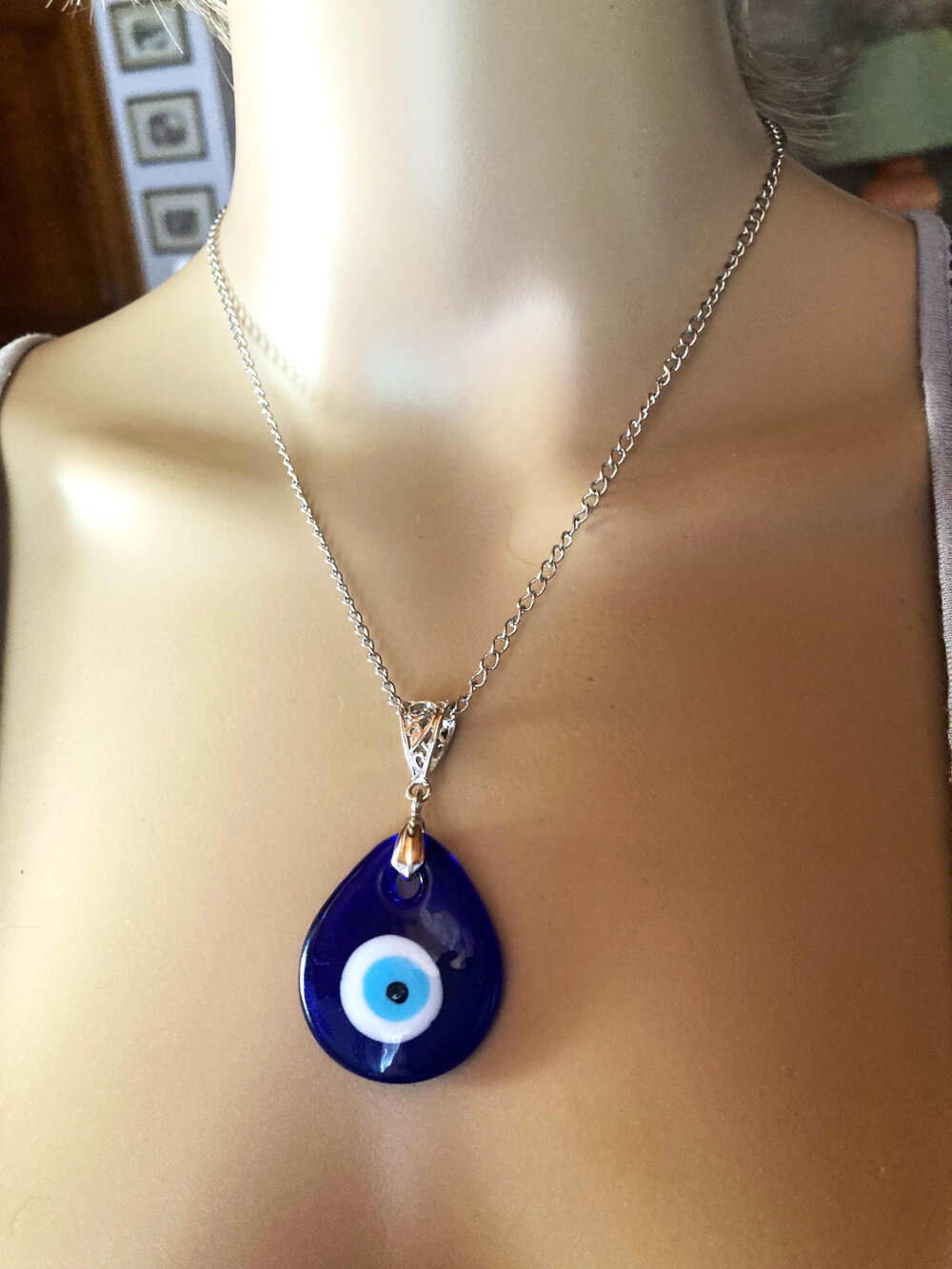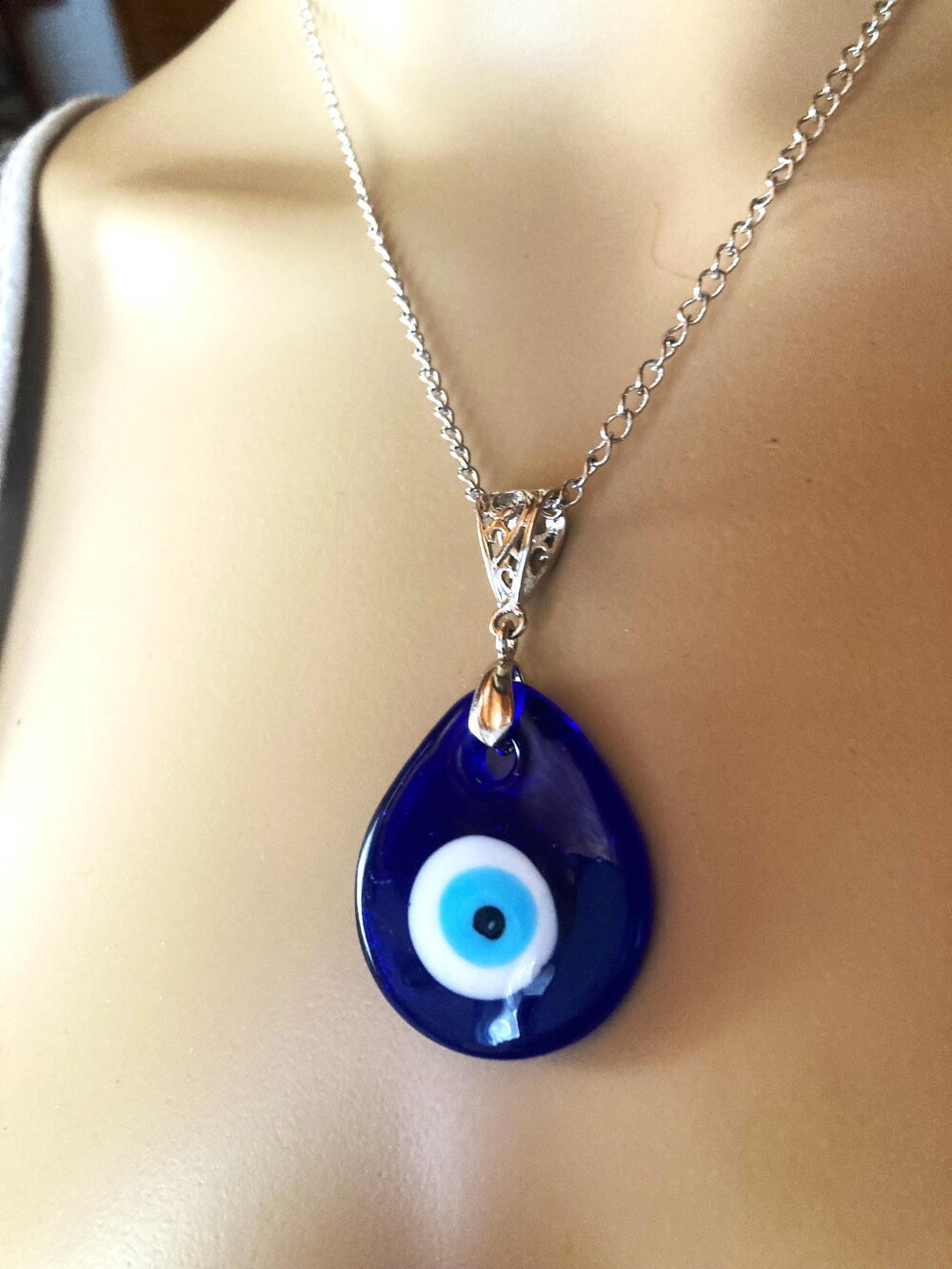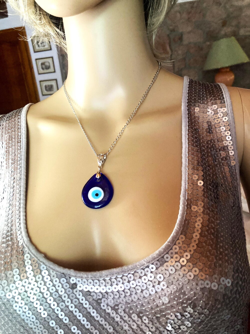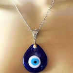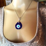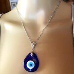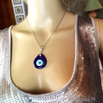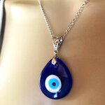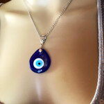 Pendentif porte bonheur, grec, en verre forme poire, tendance. Bijou homme femme.