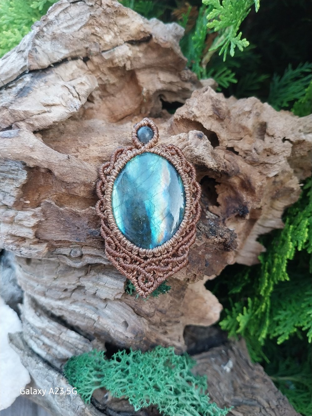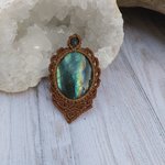 Ce pendentif met en lumière un cabochon de labradorite naturelle, délicatement enveloppé en micro-macramé réalisé à la main avec un fil marron terre. Le pendentif est monter sur un cordon torsadé avec coulissant pour ajuster la longueur.