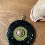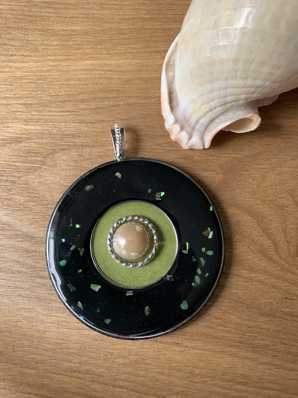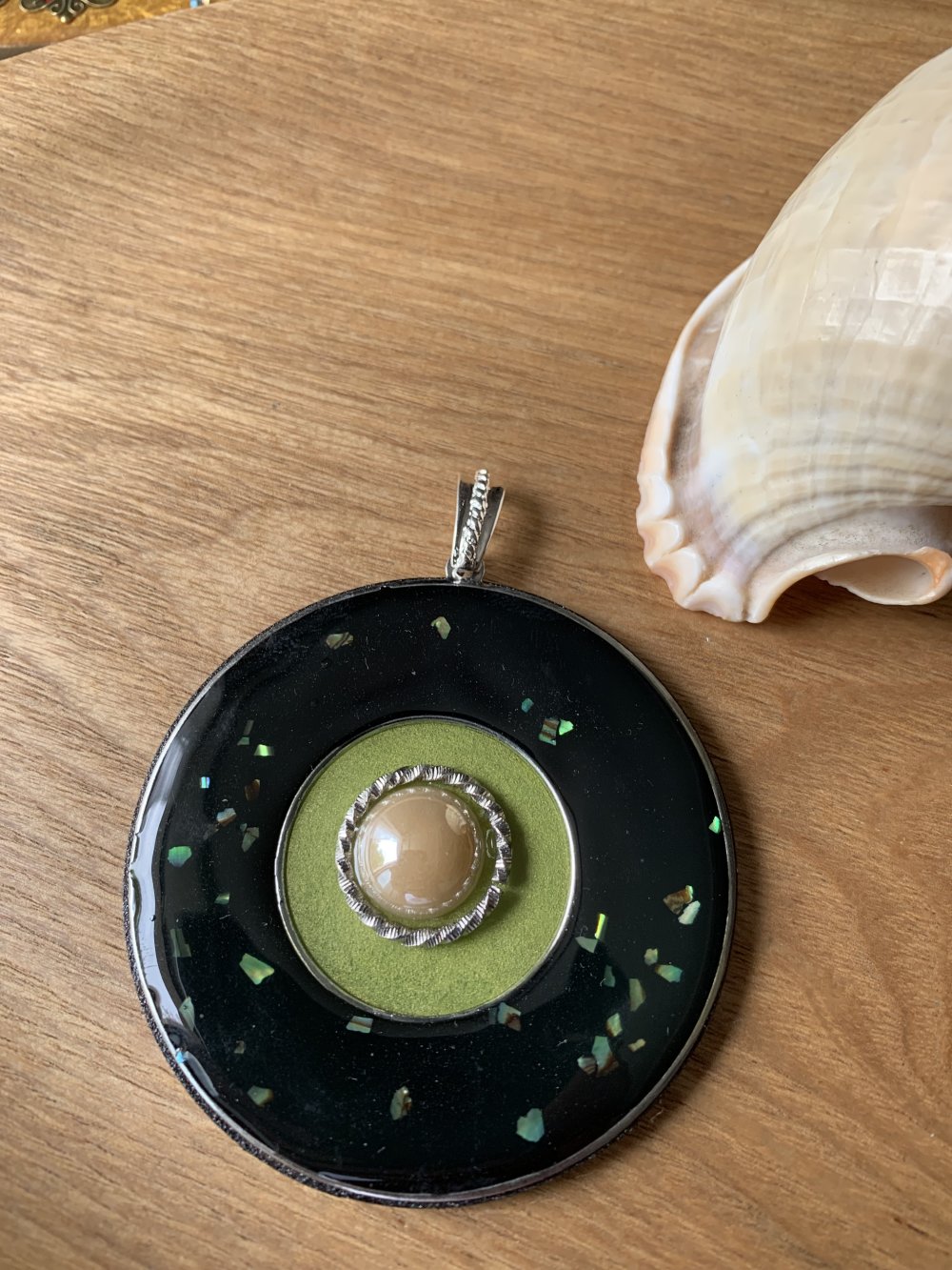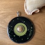 Gros pendentif 63 mm en bois résine,peint décorer et résiner ,