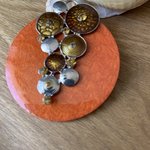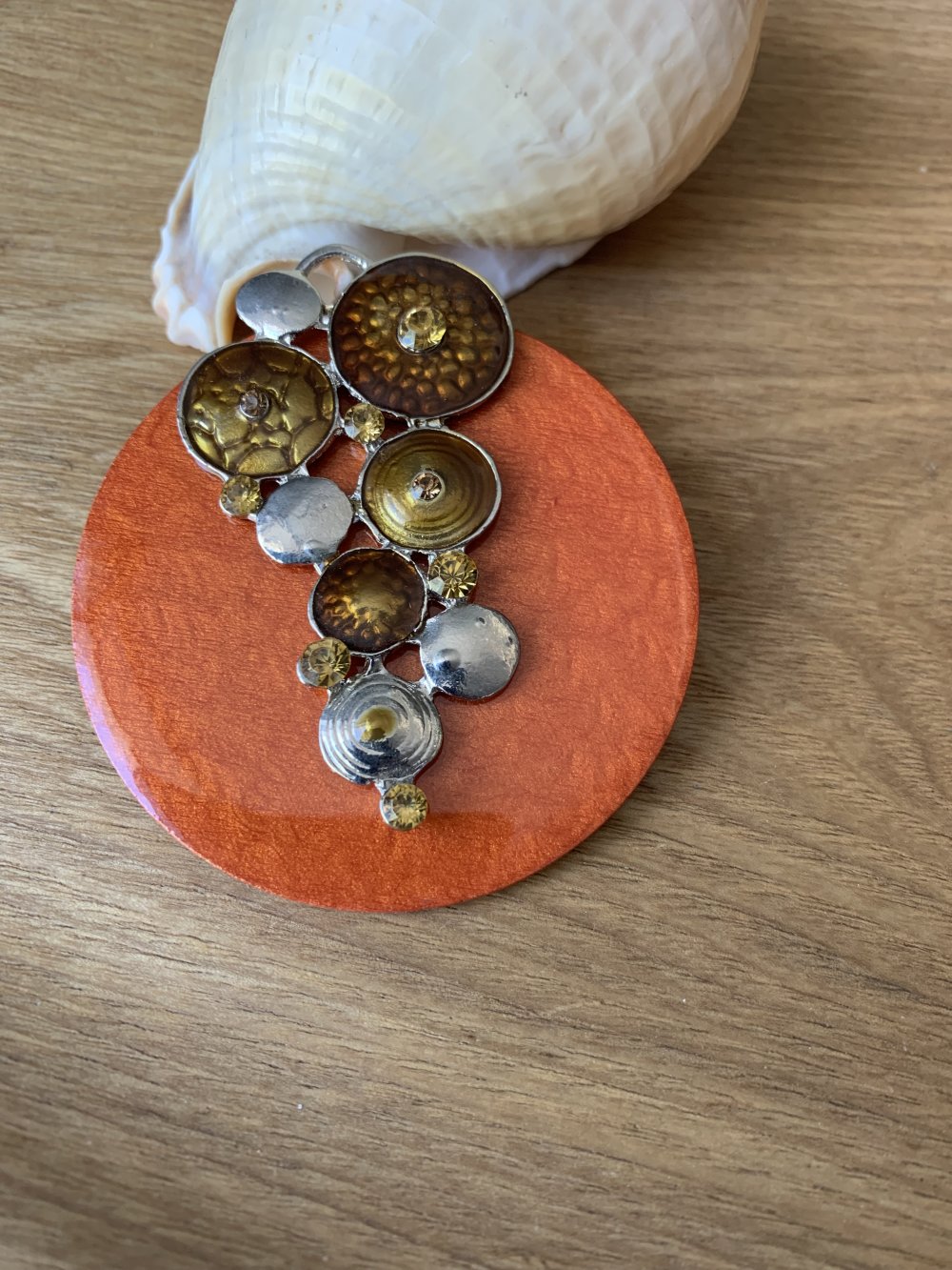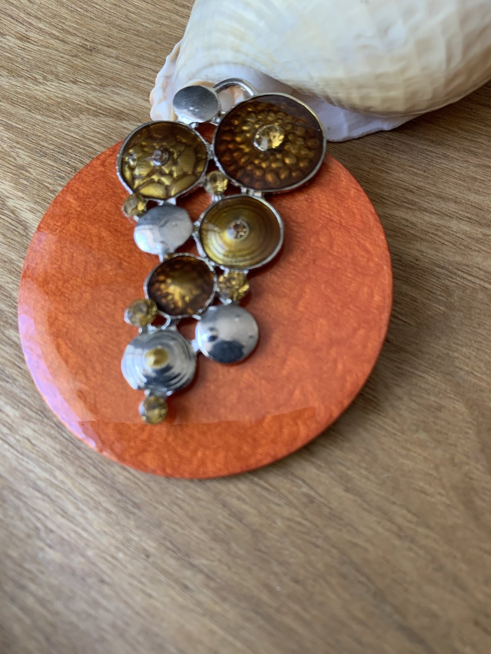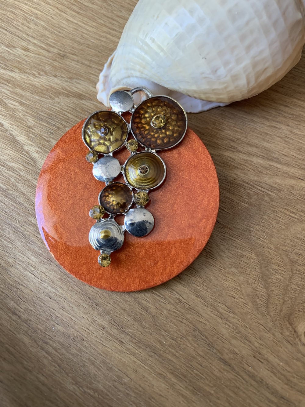 Gros pendentif camaïeu orangé ,support en bois de 60 mm,peint ,décorer (acier ,émail,) ,et résiner en couche épaisse pour un effet optimal au fini brill