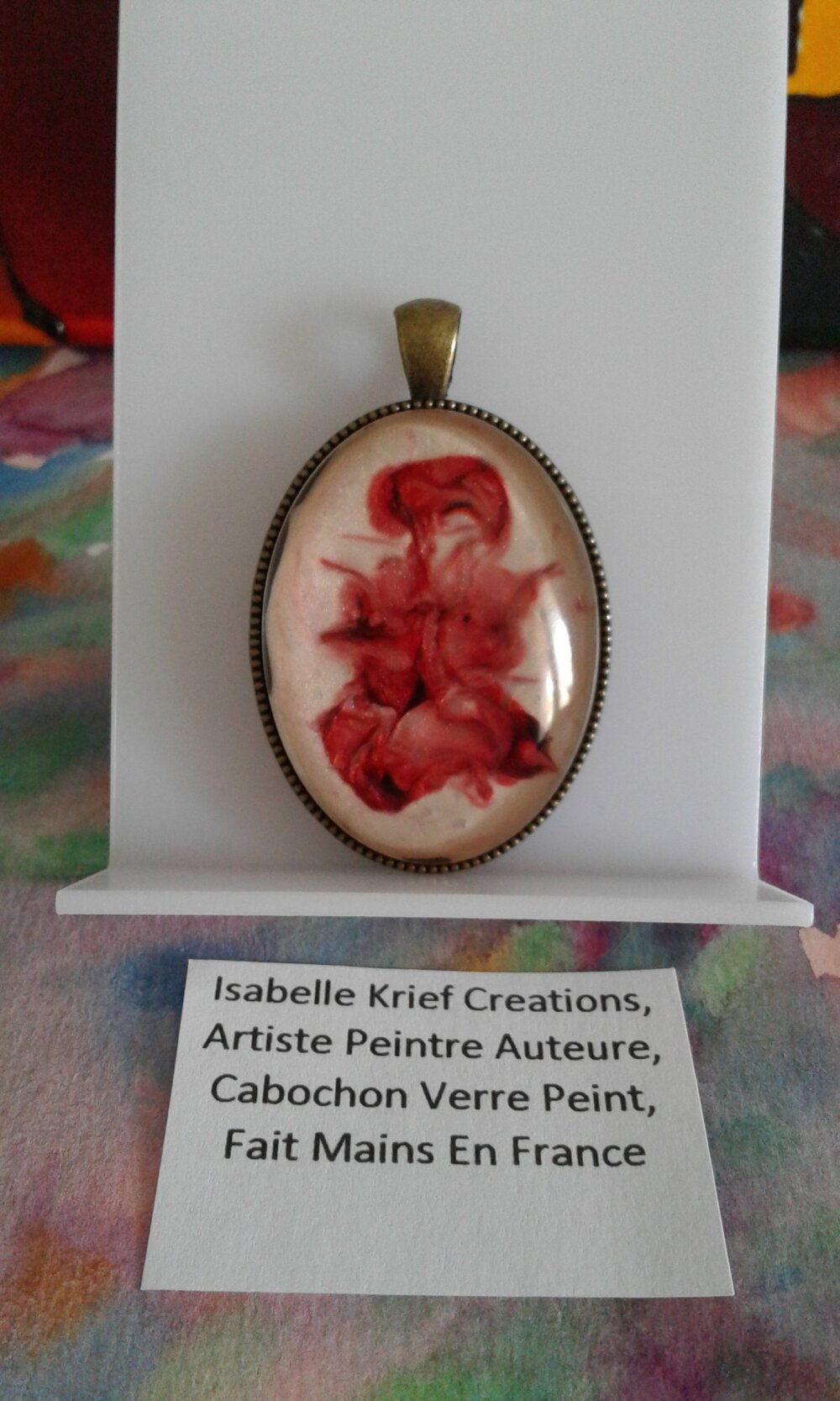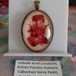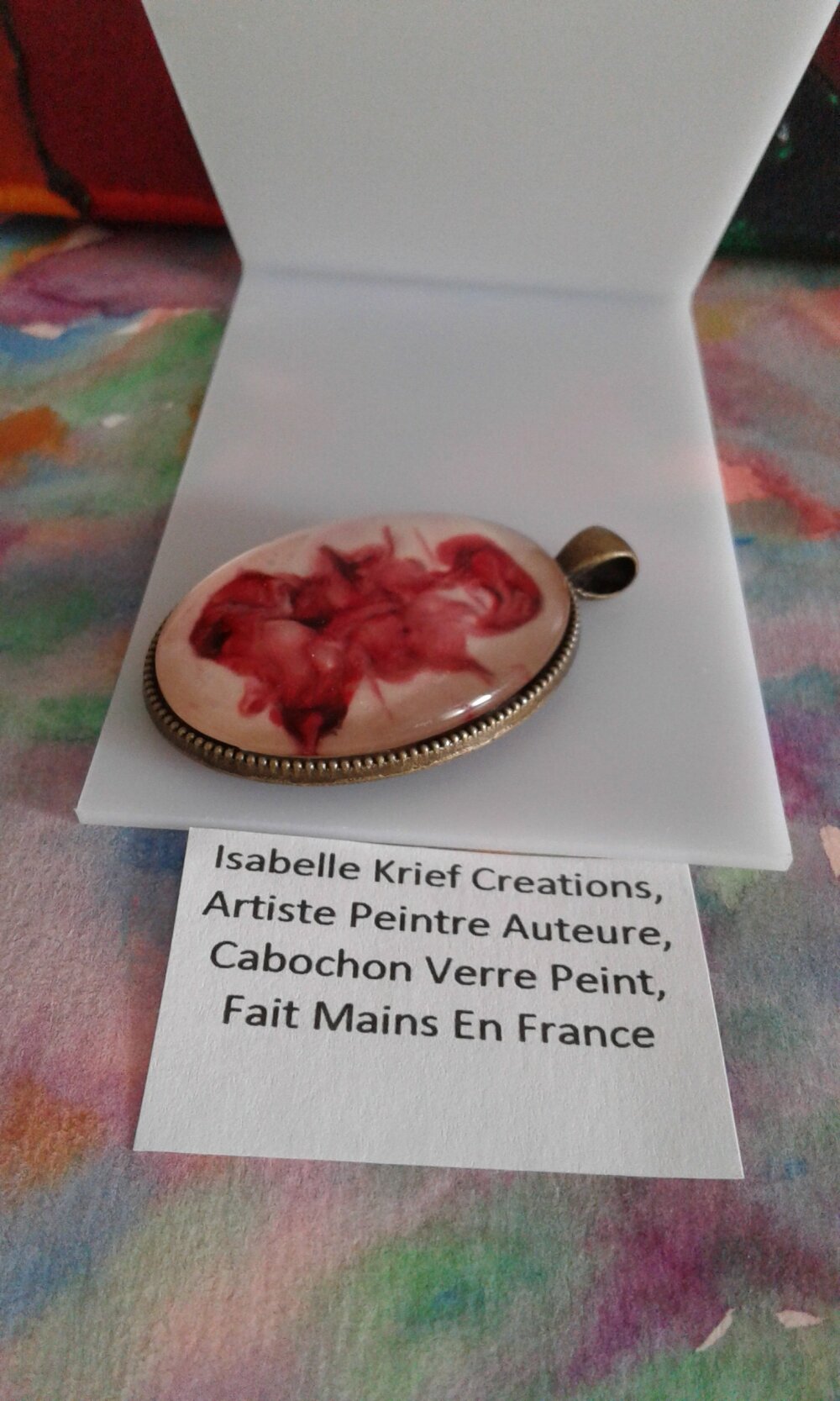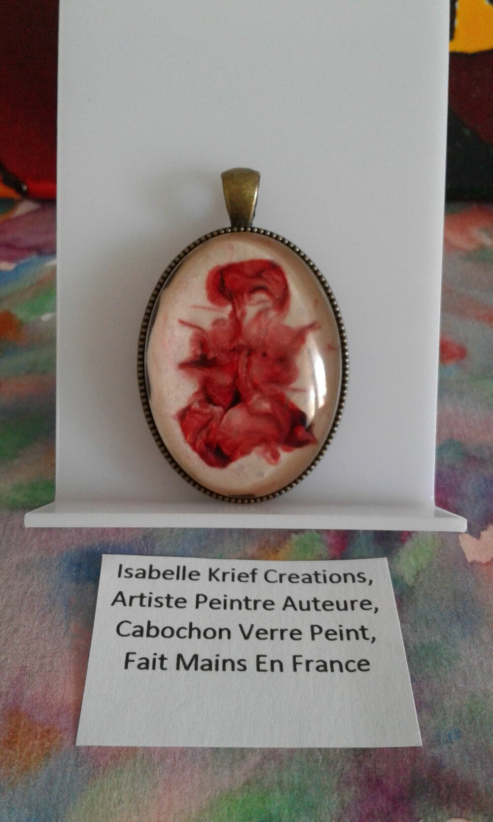 peint artiste francaise,pendentif laiton, hibou chouette,cabochon oval 30x40mm,rouge nacre blanc,art nouveau abstrait,cadeau fete anniversaire noel,fait mains en france,boho bobo gothique punk,victorien baroque rococo,art brut contemporain,bijou peint,bijou fantastique unique ooak,isabelle krief creations,fourniture bijou collier sautoir,