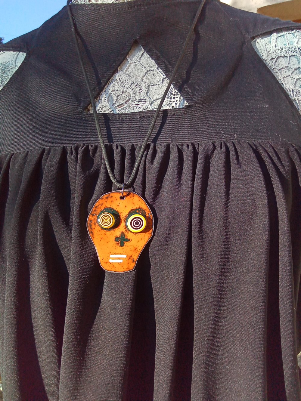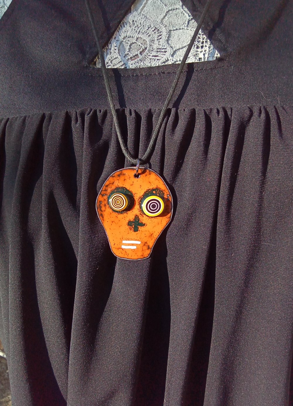 L'Inspiration est venue de la forme d'une petite coquille Saint-Jacques (le dessus). A la découpe du cuivre, j'ai reconnu une autre forme, une Tête de Mort.