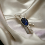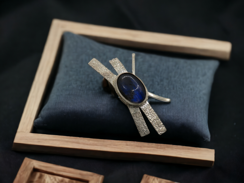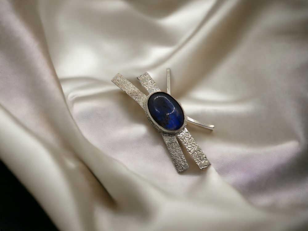 Un pendentif graphique en argent massif, serti d’une labradorite naturelle aux reflets bleus. Une pièce unique, faite main, pour celles qui aiment les bijoux qui captent la lumière.