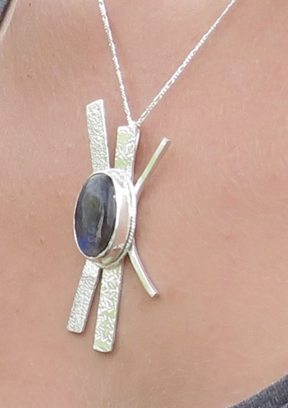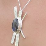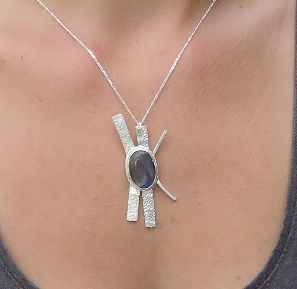 Pendentif contemporain en argent massif, entièrement façonné à la main, mettant en valeur une labradorite naturelle aux reflets profonds et changeants.