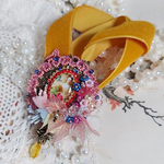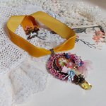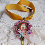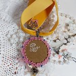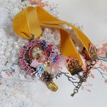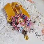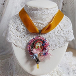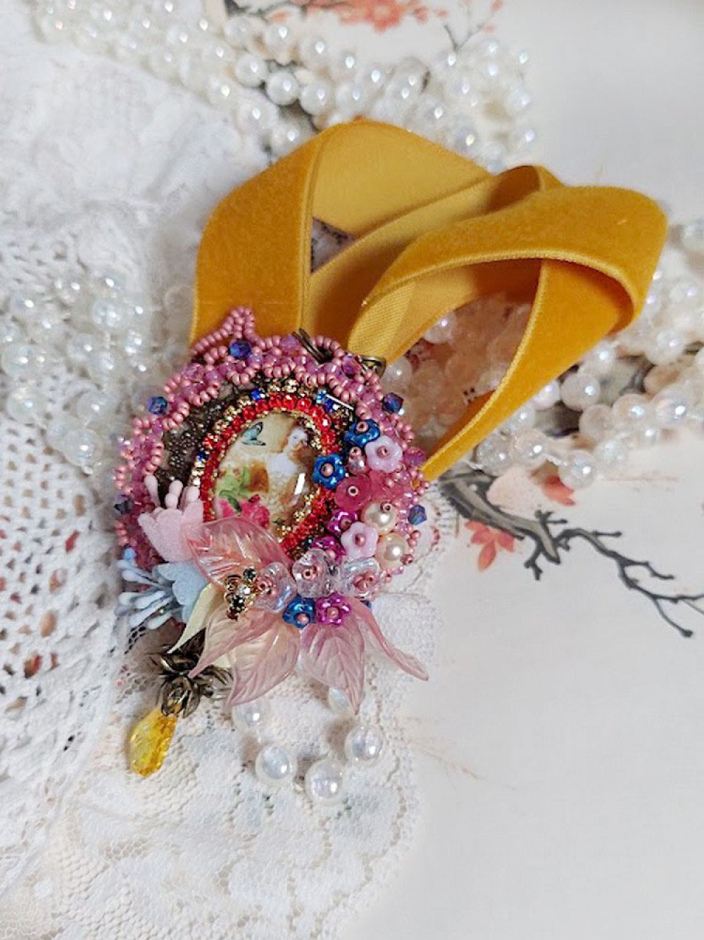 Pendentif Belle Classe brodé avec estampe, cabochon verre avec une femme en robe victorienne à laquelle s’ajoute strass, clochettes, fleurs velours floquées, ruban, étamines, goutte, perles nacrées et toupies Cristal Swarovski