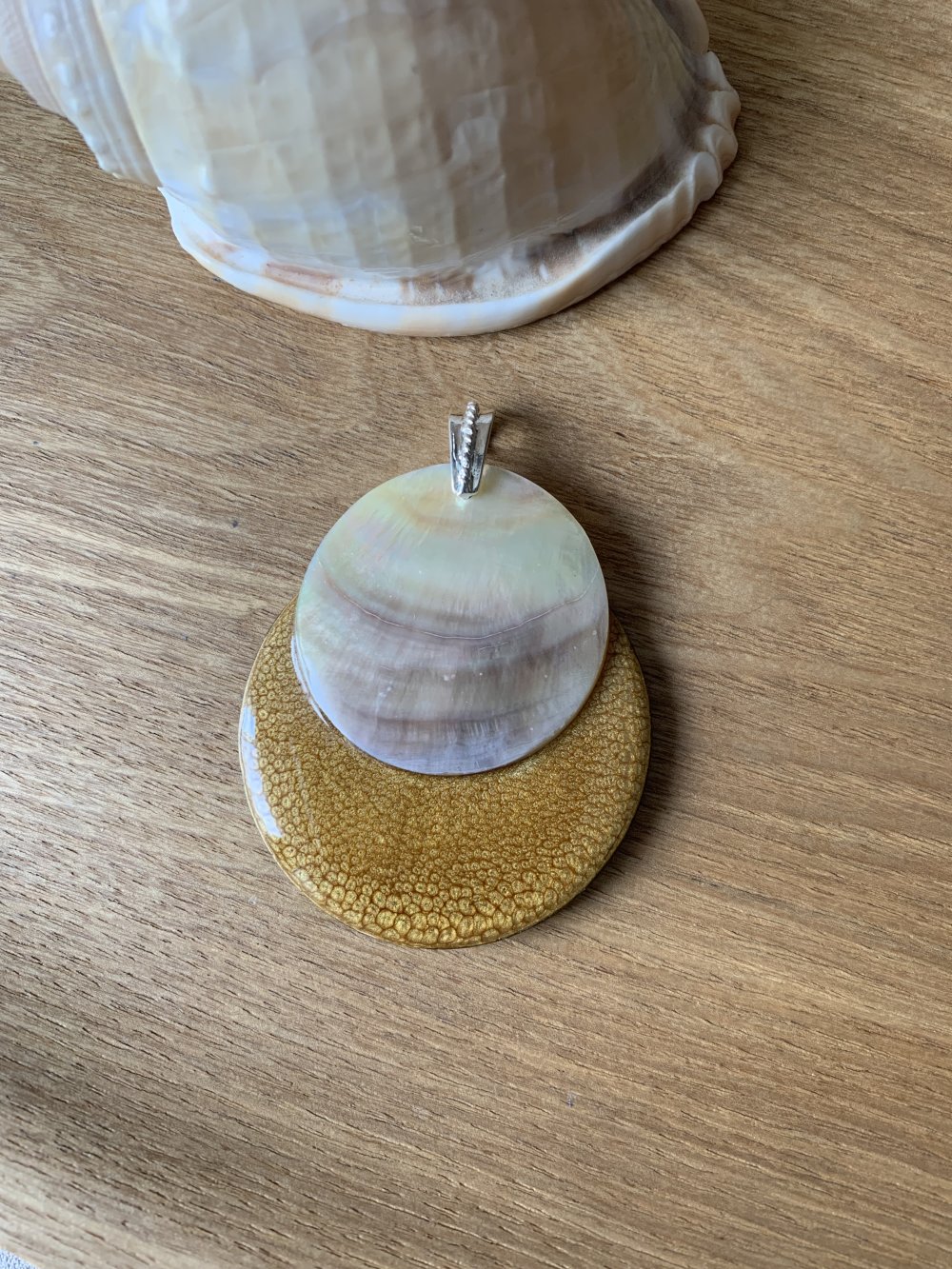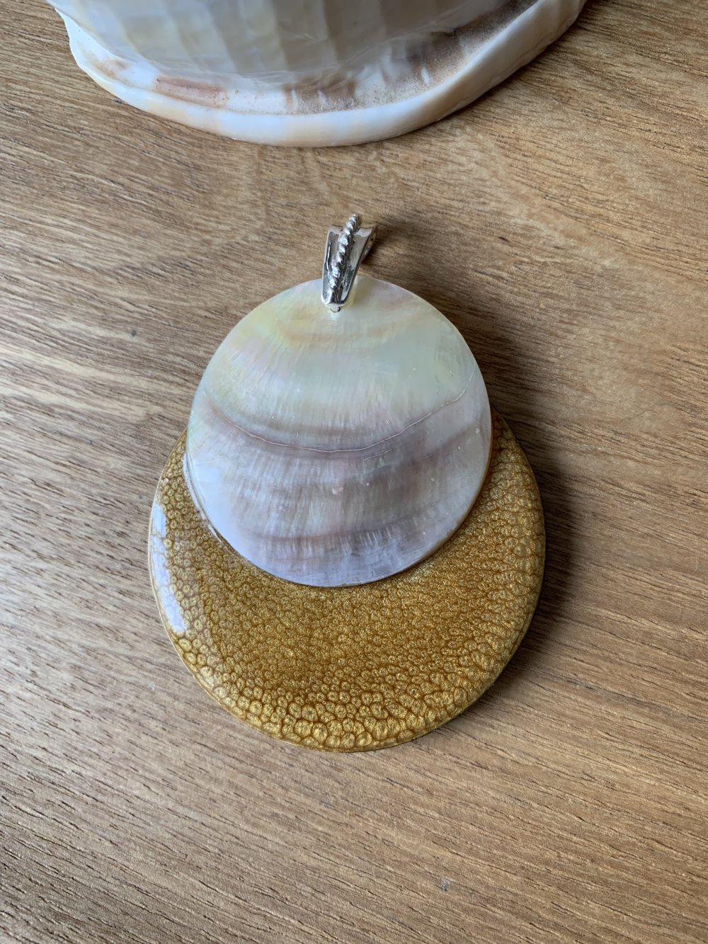 Pendentif pour créations bijoux,en bois et nacre de coquillage 50 mm