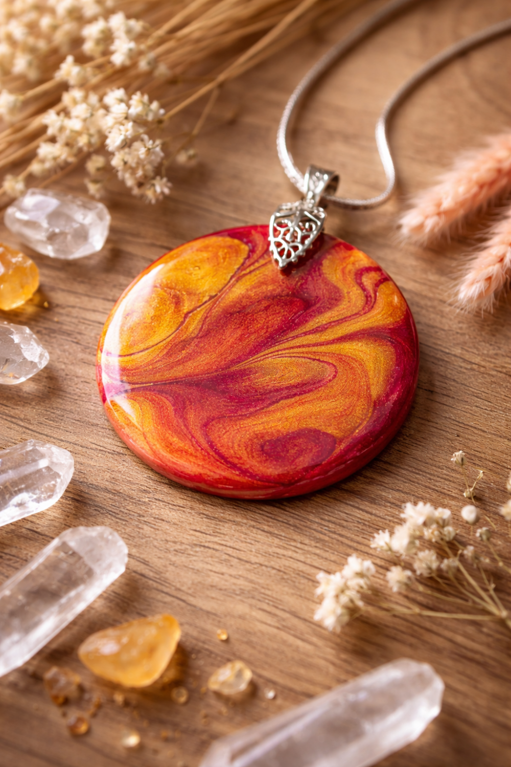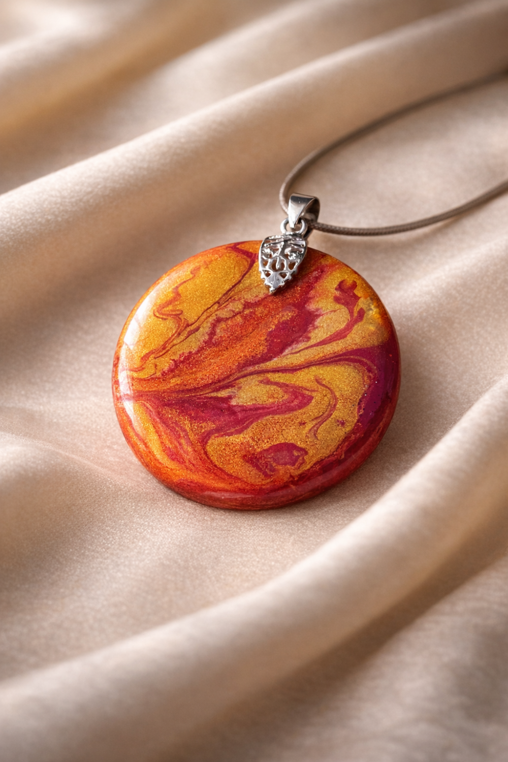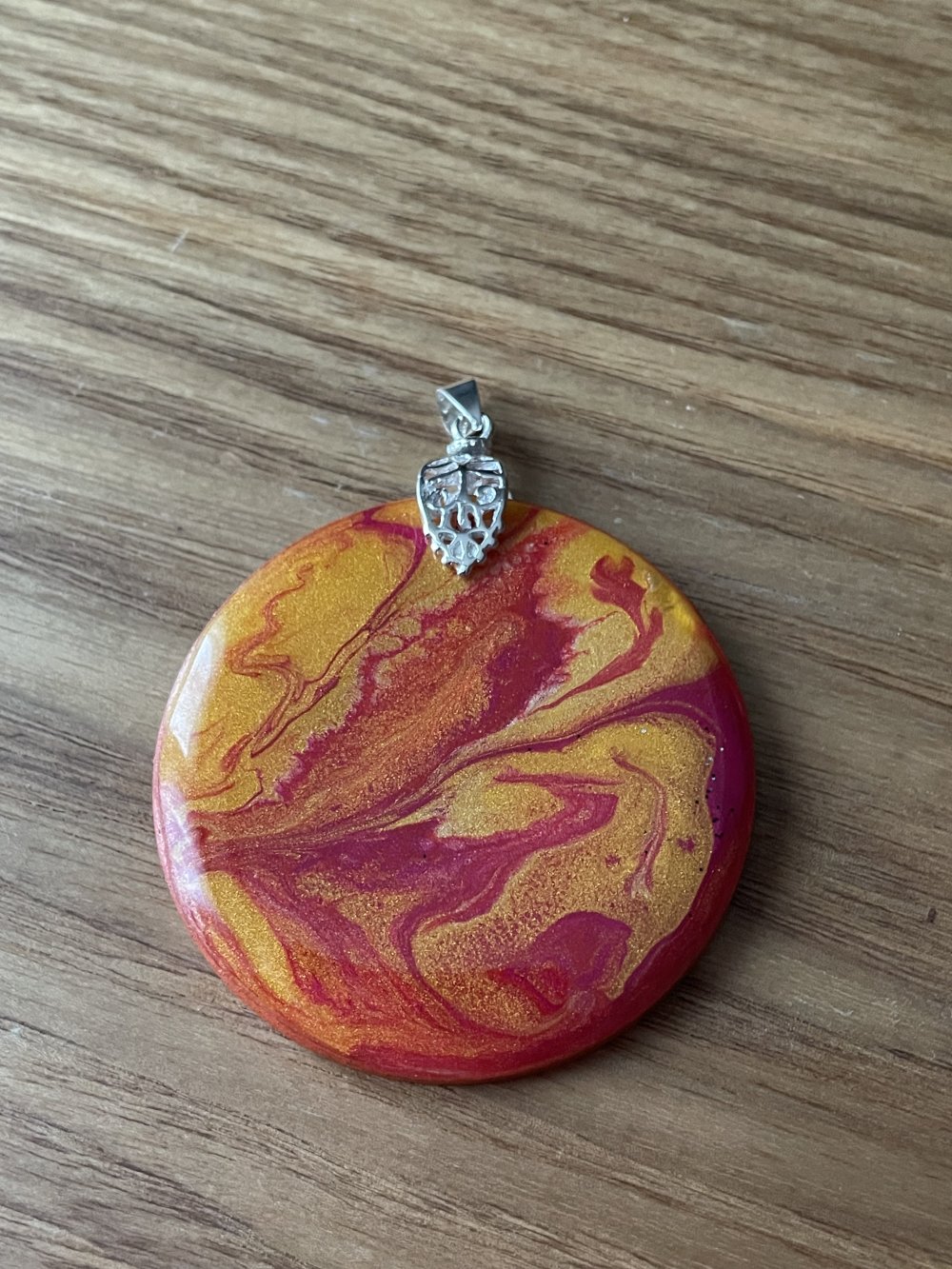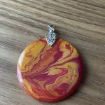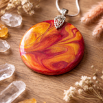 Création pendentif mélange fluide de couleurs orangé sur bois résiner fait main de 50 mm