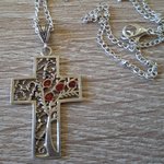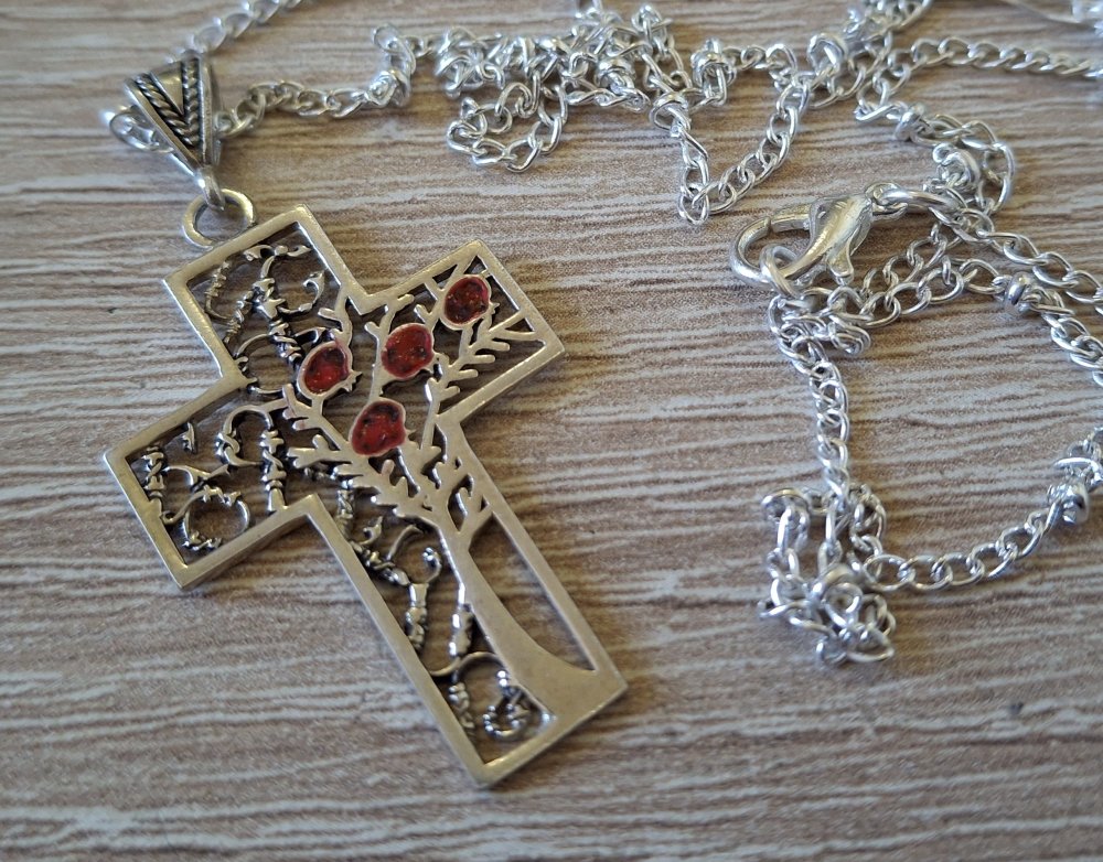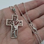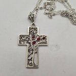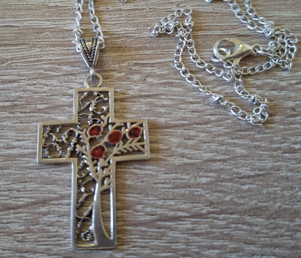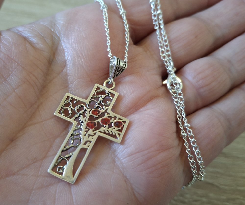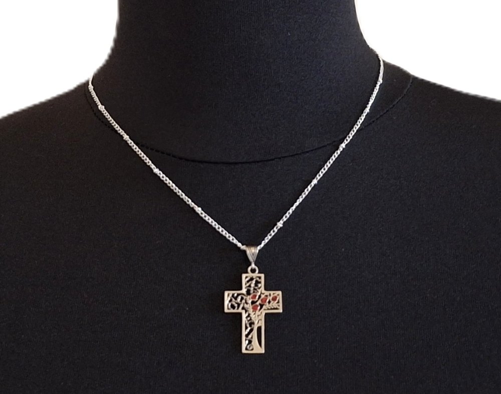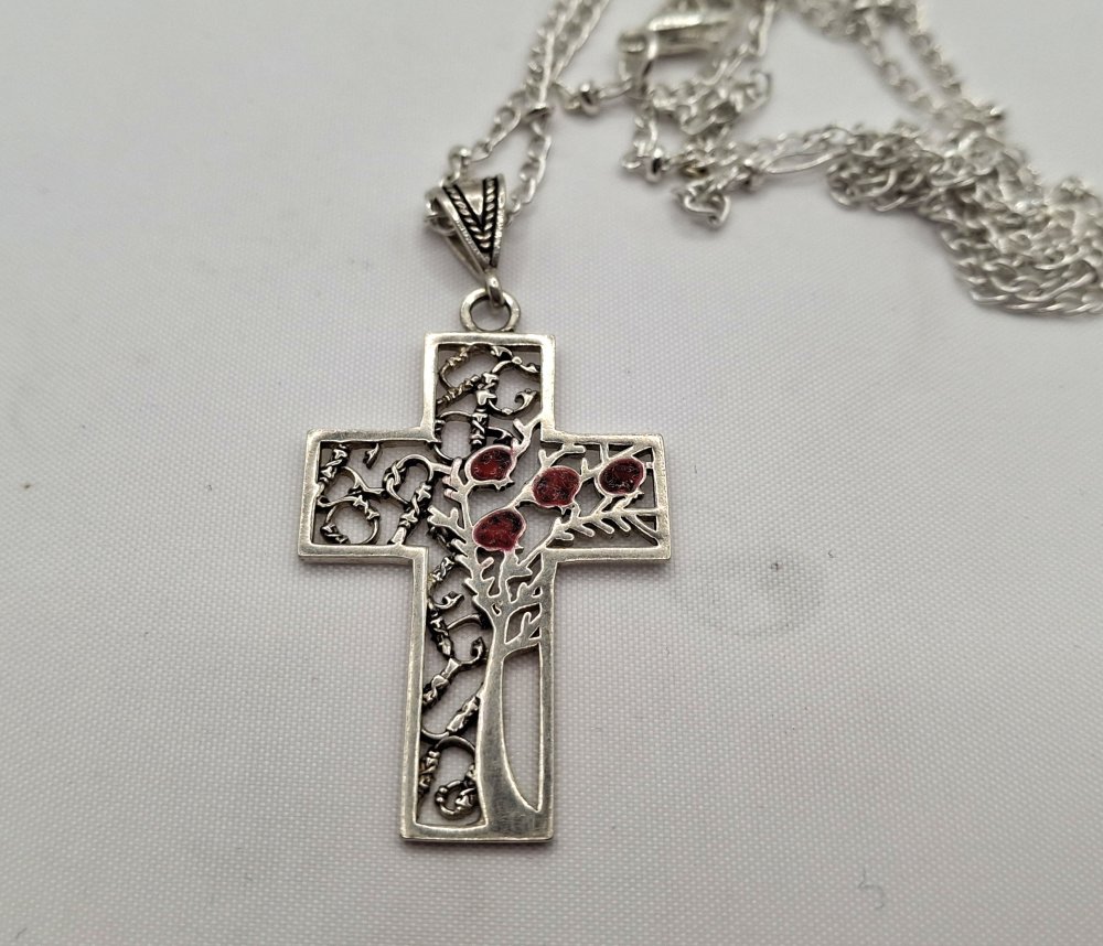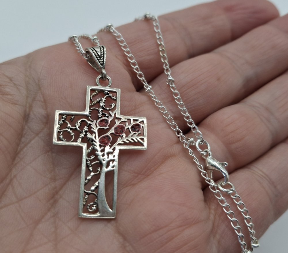 Pendentif Croix Arménienne en Argent Sterling – Arbre de Vie avec Grenade & Zircon Rouge