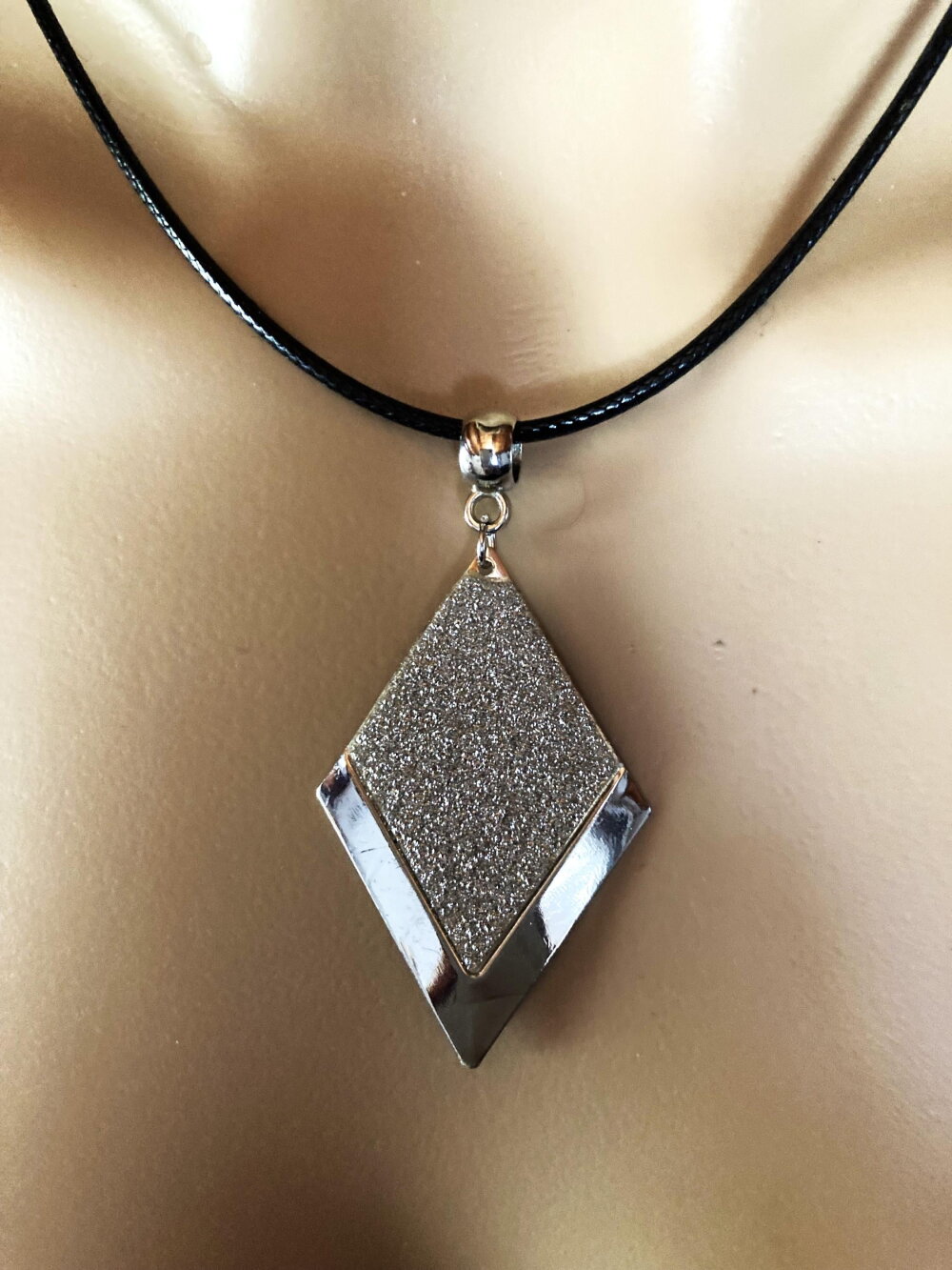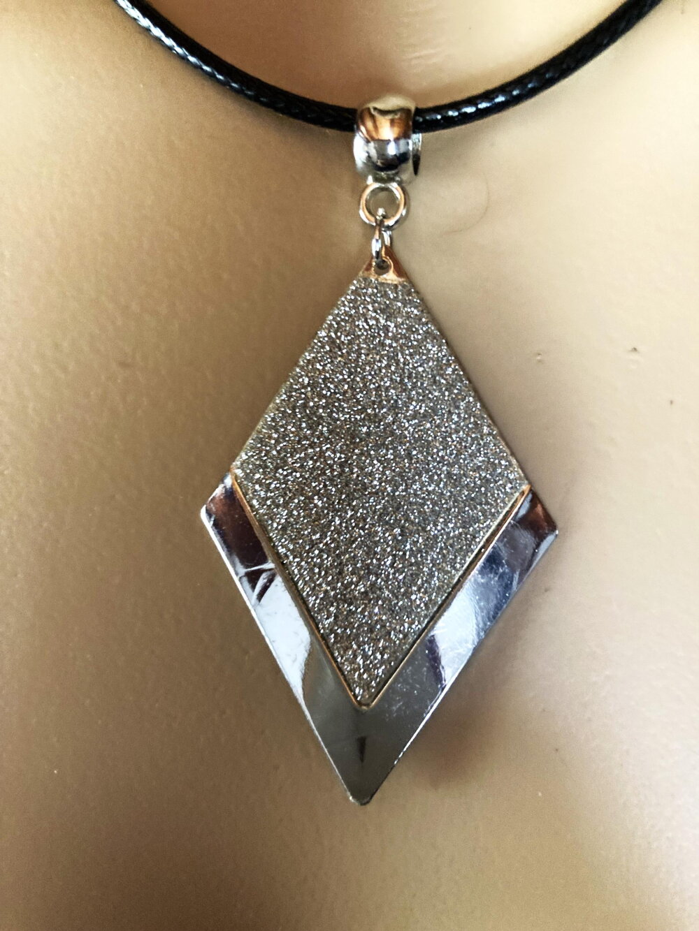 Pendentif élégant fin en métal argenté sur collier cordon en coton ciré noir. Peut facilement être porté sur une chaîne en argent. Bijou femme.