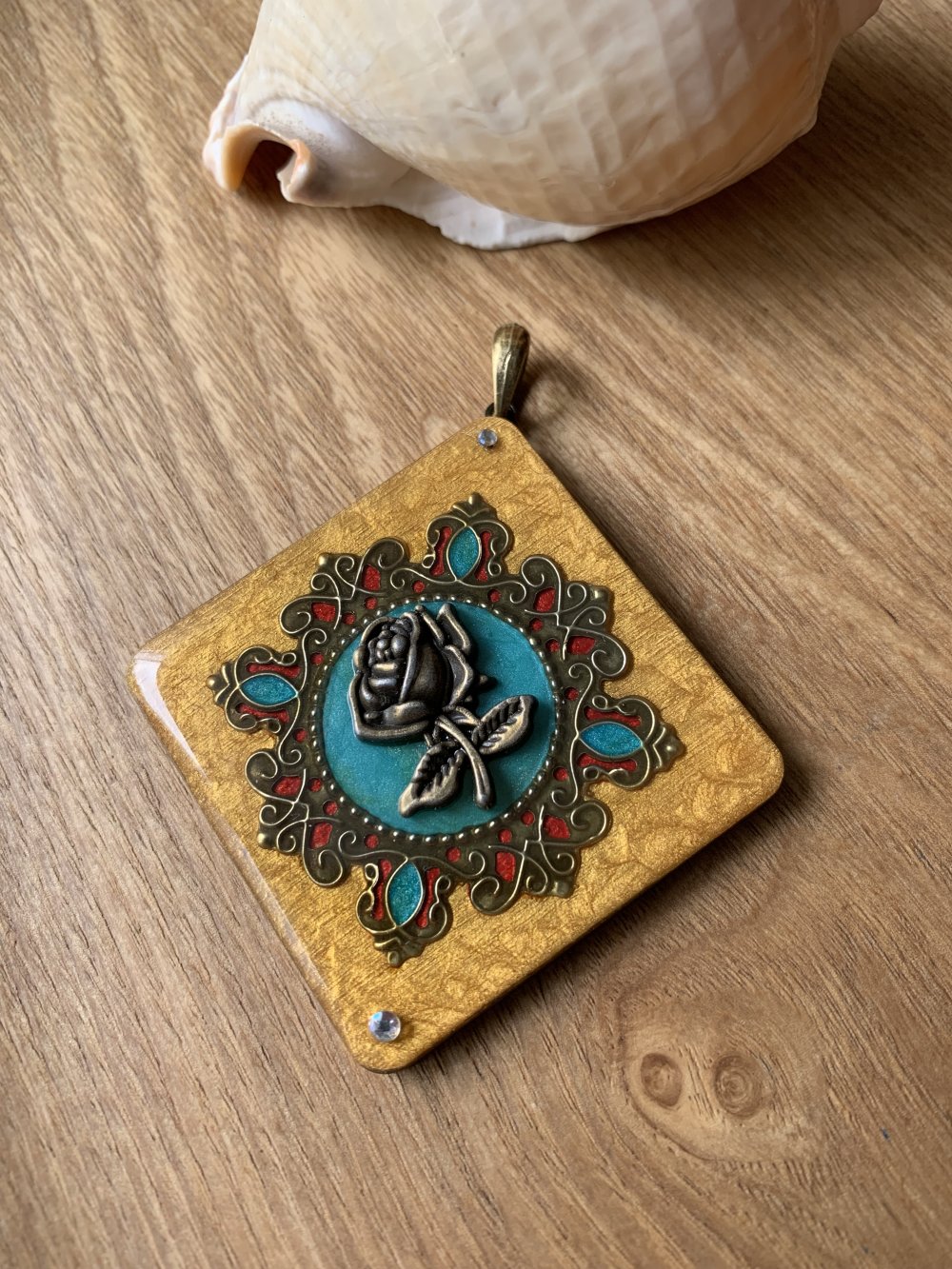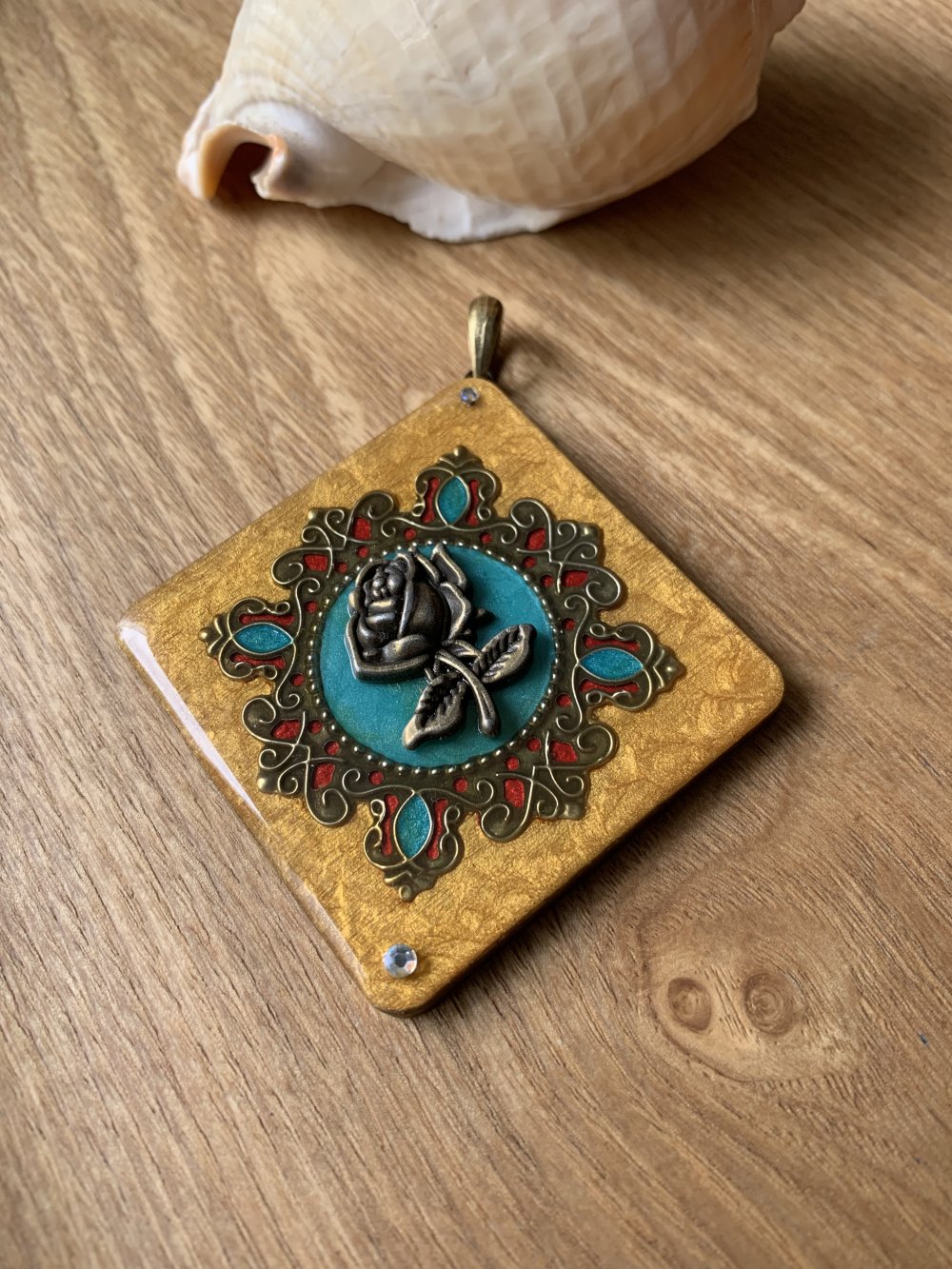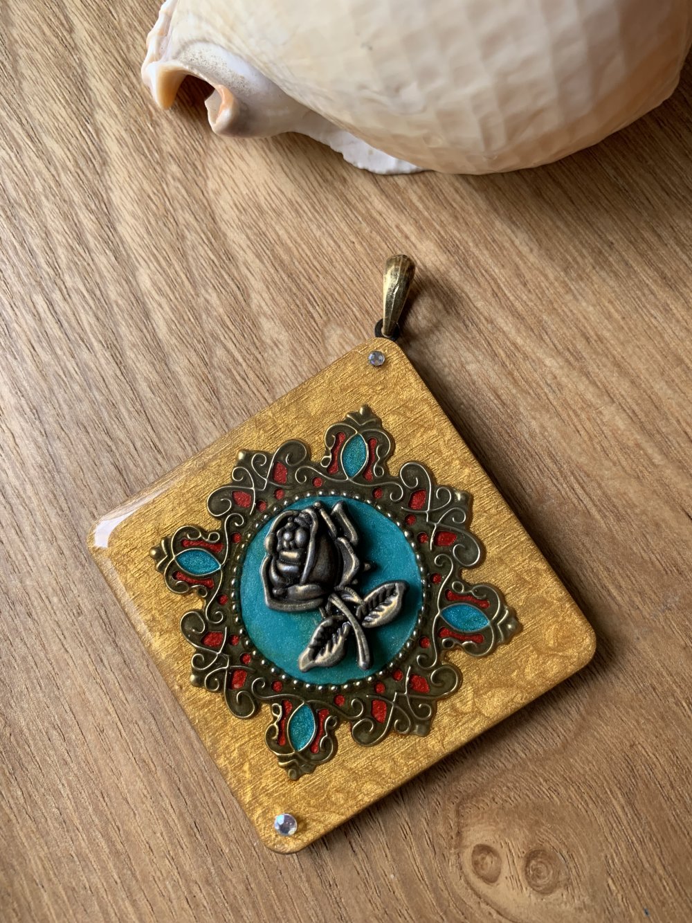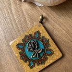 Pendentif en bois carré de 50 x 50 mm ,peint décoré et resiner