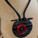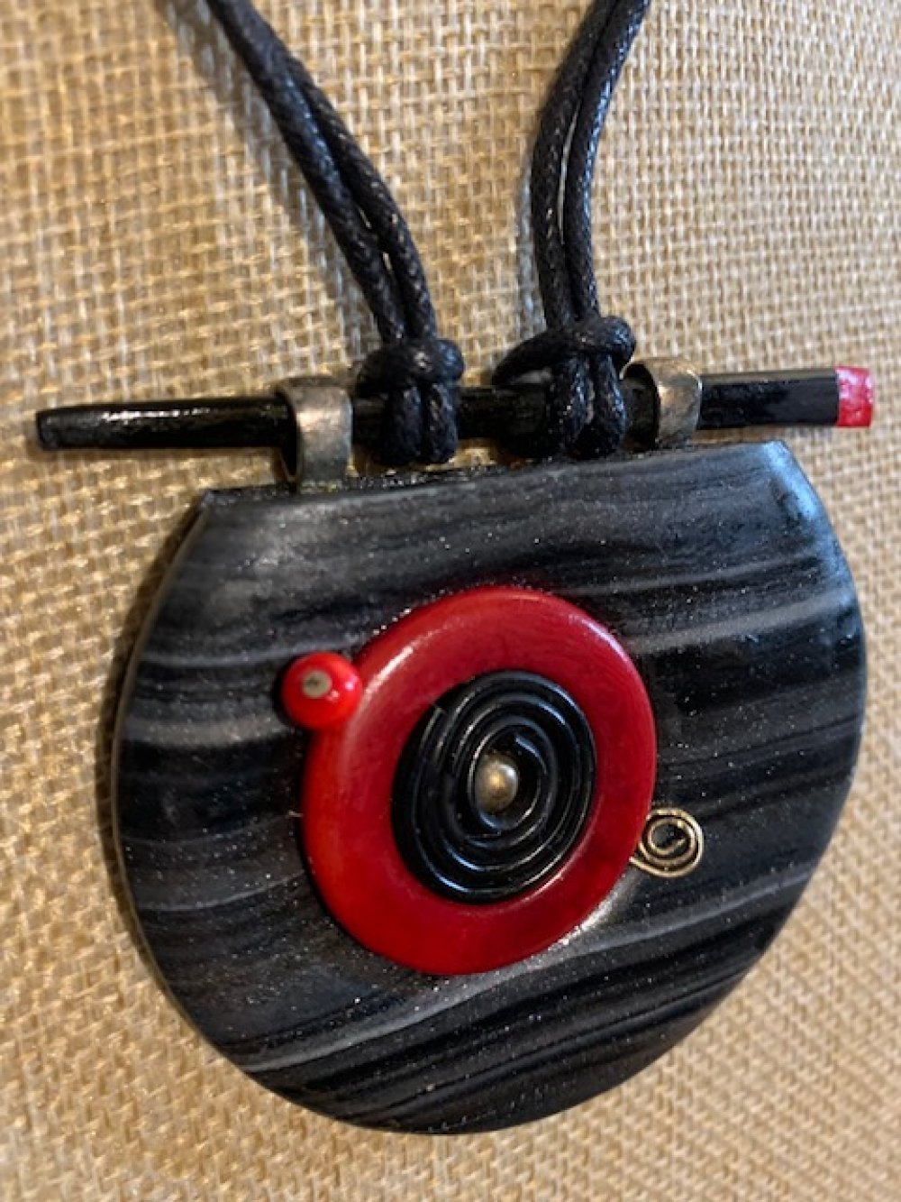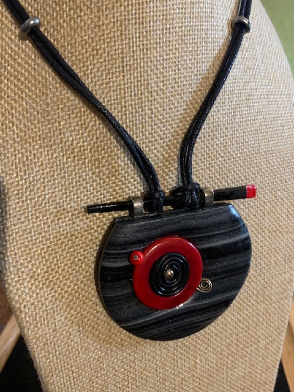 Pendentif polymère - ivoire végétal, PVC, bois, cordon coton ciré