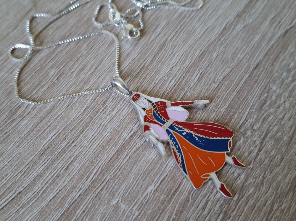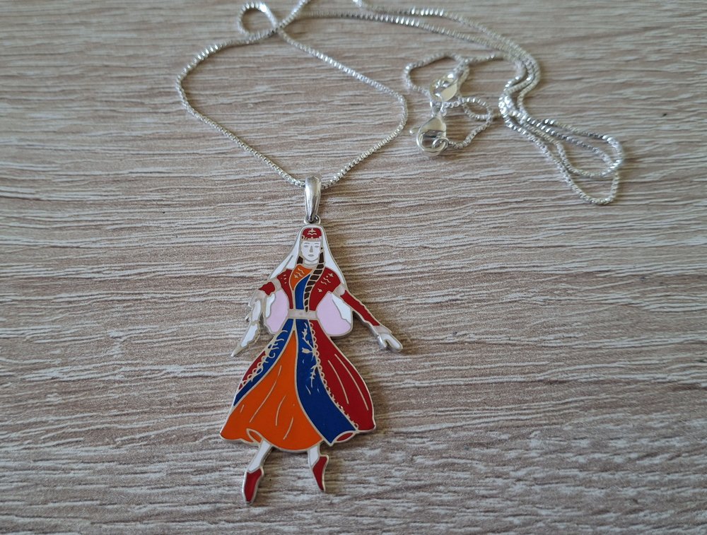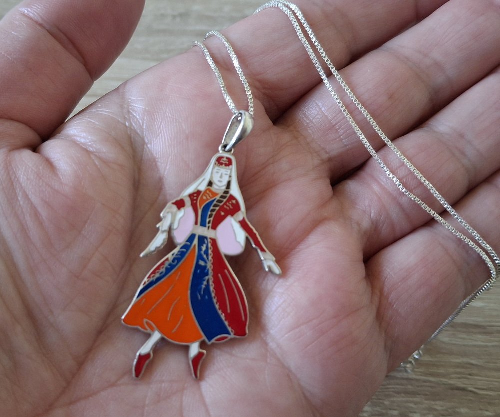 Un hommage à la grâce féminine et à l’héritage arménien. Ce pendentif artisanal représente une femme en costume traditionnel Taraz, réalisé en argent sterling (.925) et décoré d’émail aux couleurs du drapeau arménien. Un cadeau symbolique pour femmes et enfants, porteur de mémoire et de beauté.