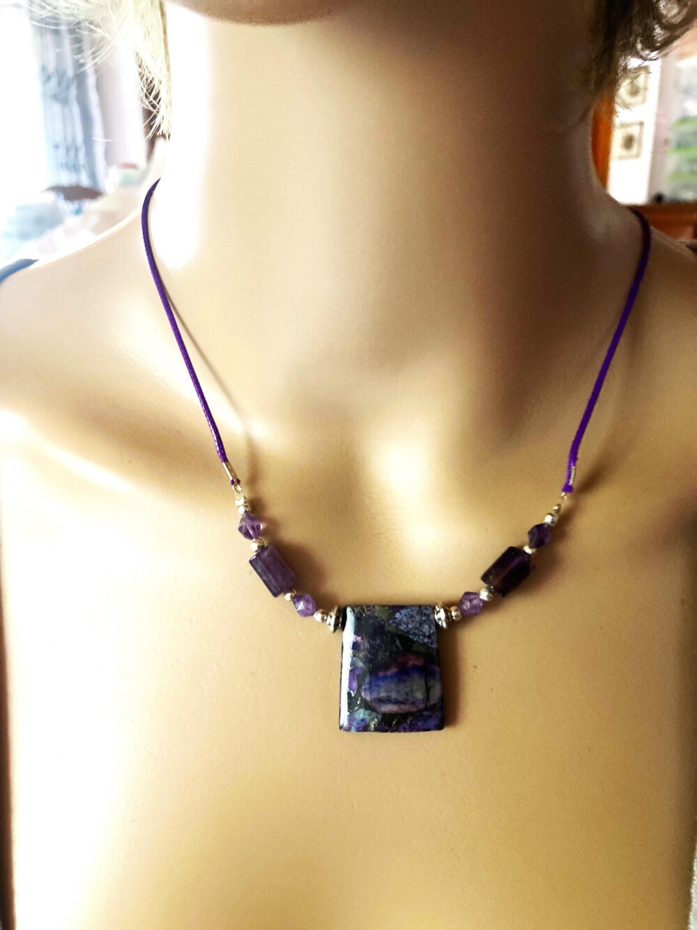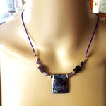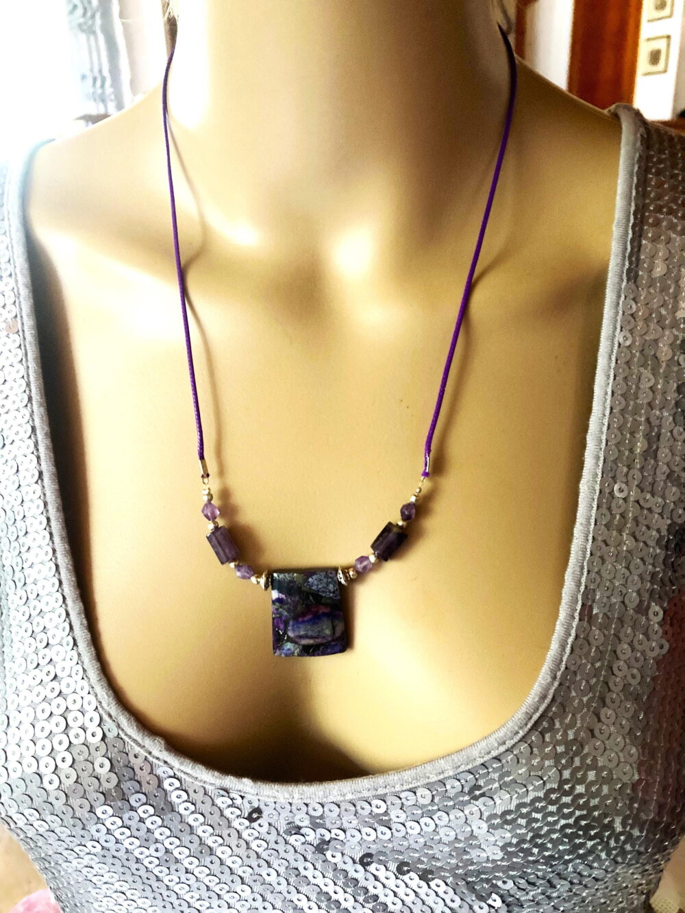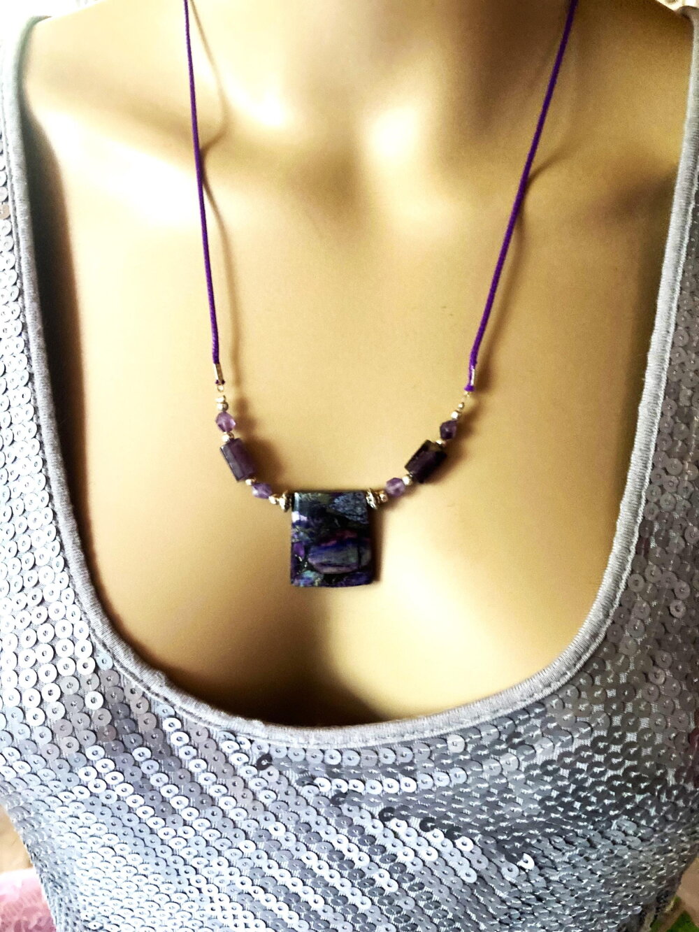 Pendentif jaspe et améthyste sur collier cordon violet 55/60 cm bijou femme