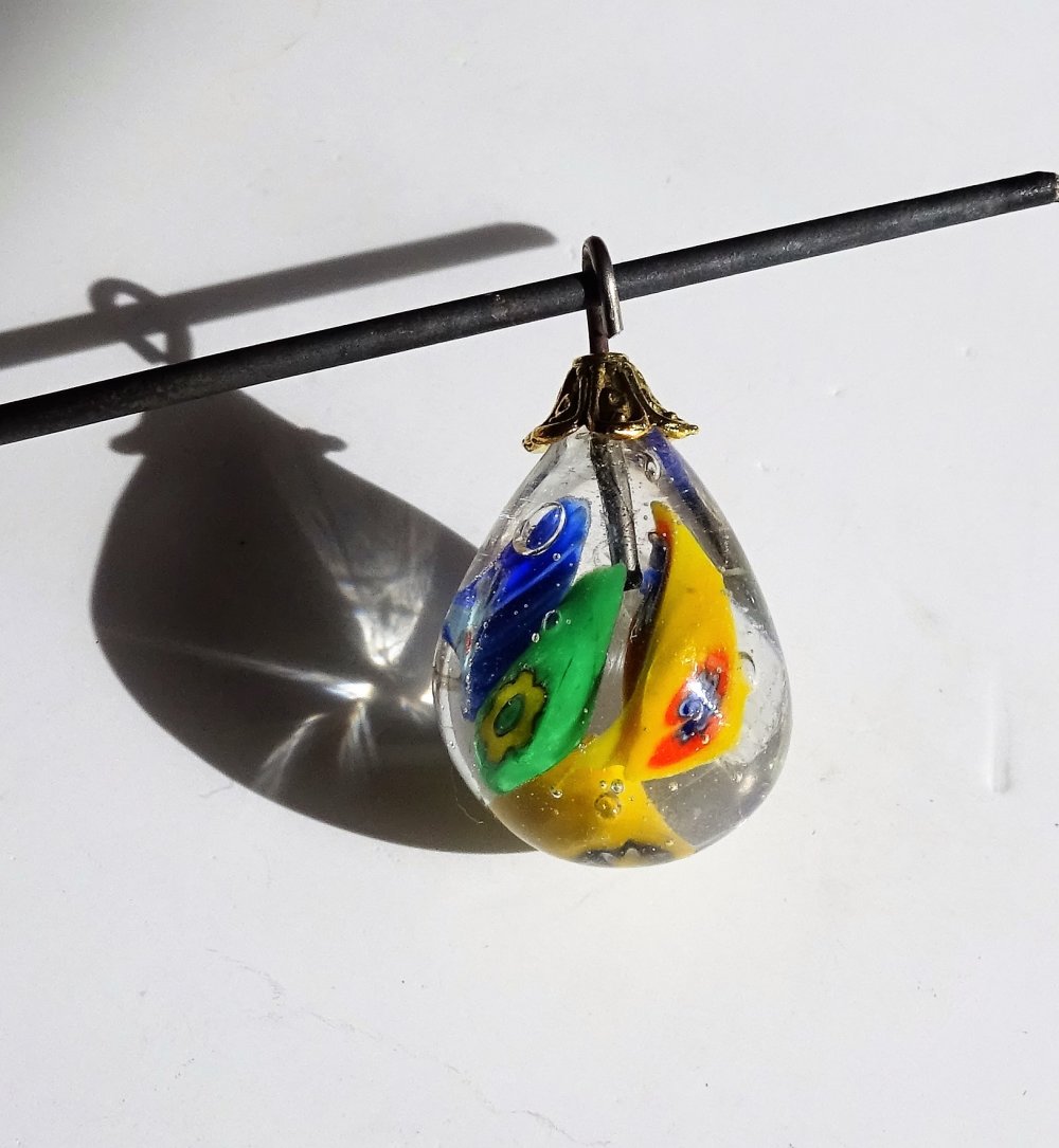 Fileuse de verre au chalumeau, je réalise moi-même la plupart des perles qui ornent mes créations. Le verre est recuit dans un four spécial de perlier pour garantir sa solidité et sa longévité.