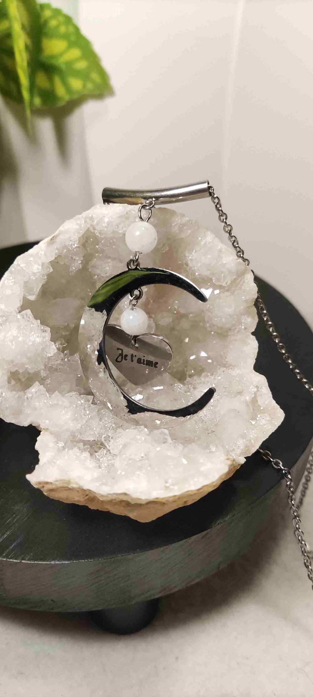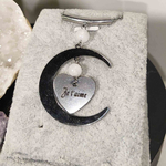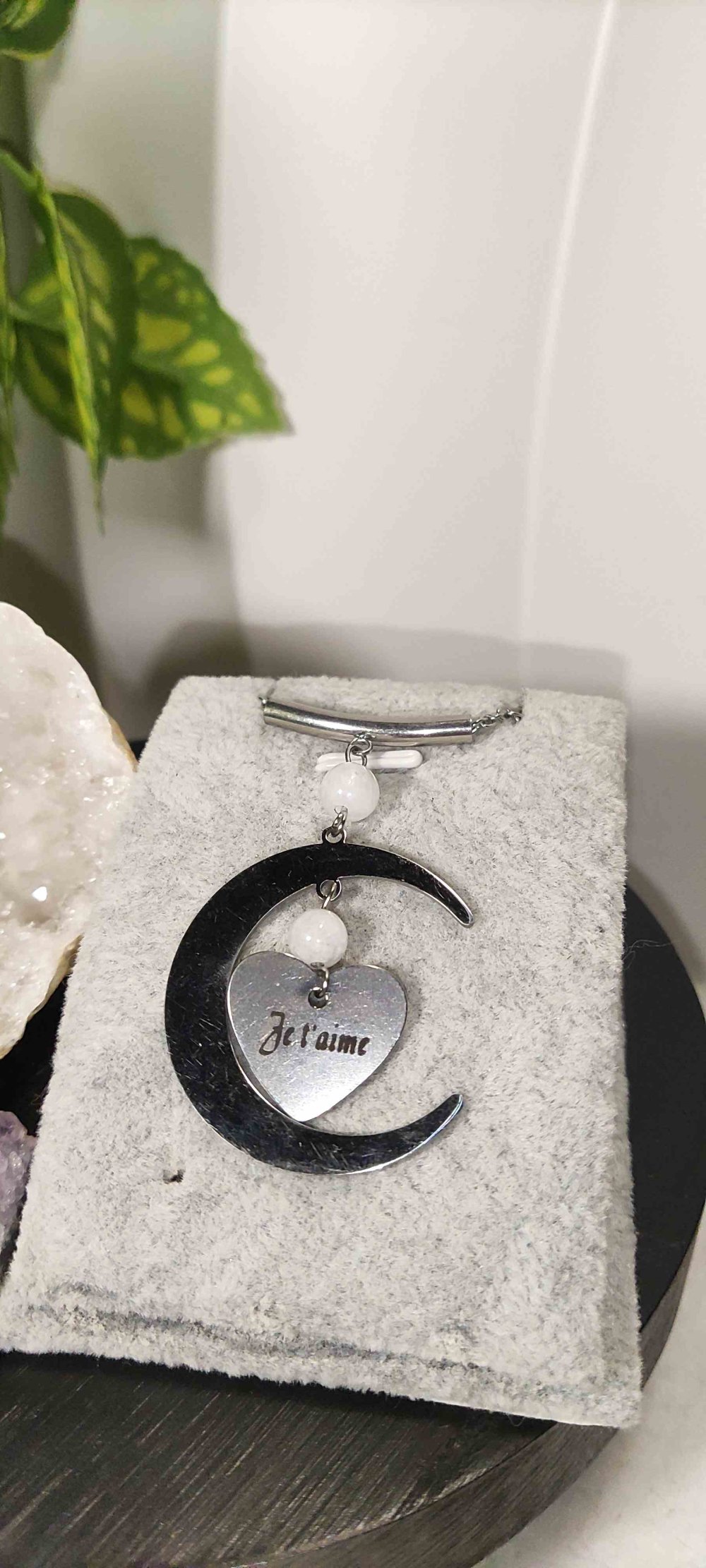 Pendentif en forme de lune avec une pierre lune naturelle . Pour déclarer sa flamme , ou pour sa maman chérie , ce joli pendentif en acier inoxydable en forme de lune transmettra vos sentiments à la personne choisie . La pierre de lune est une pierre féminine ,je trouvais l'association des deux symboles idéals .